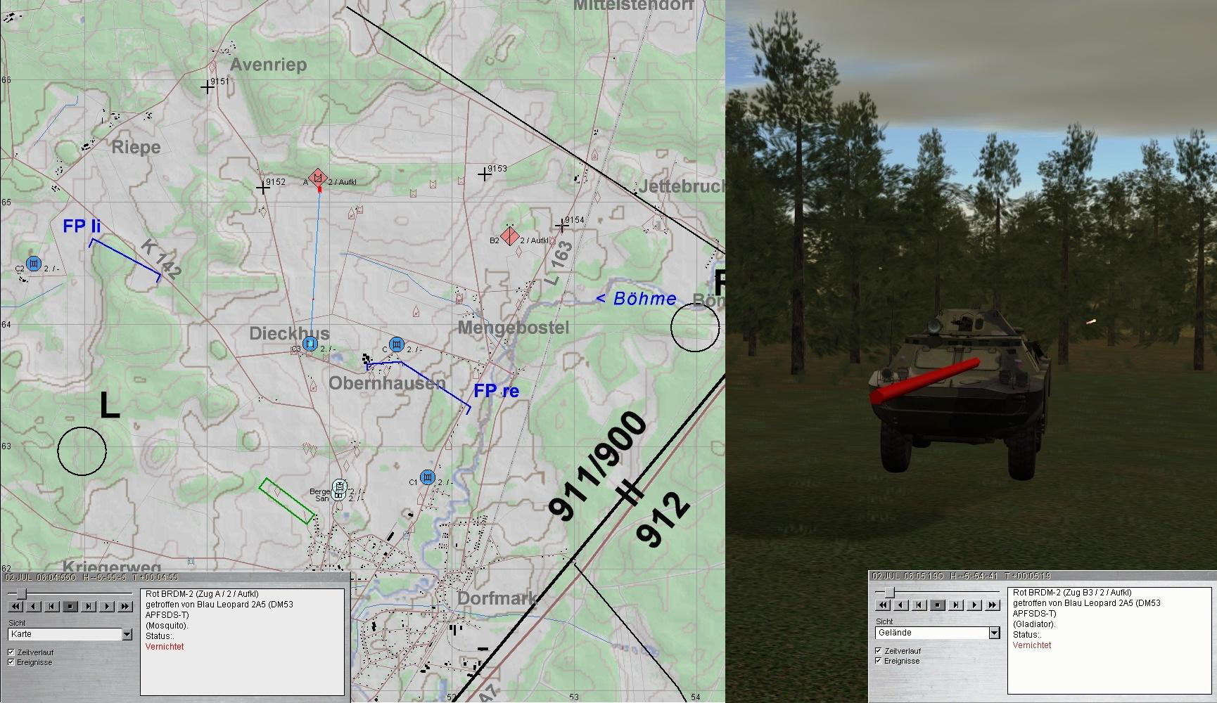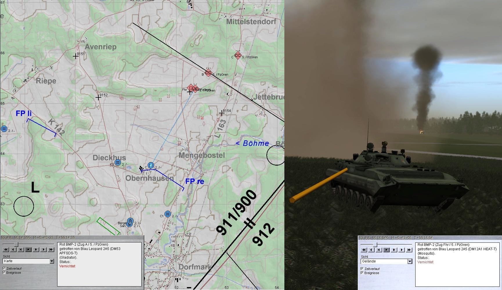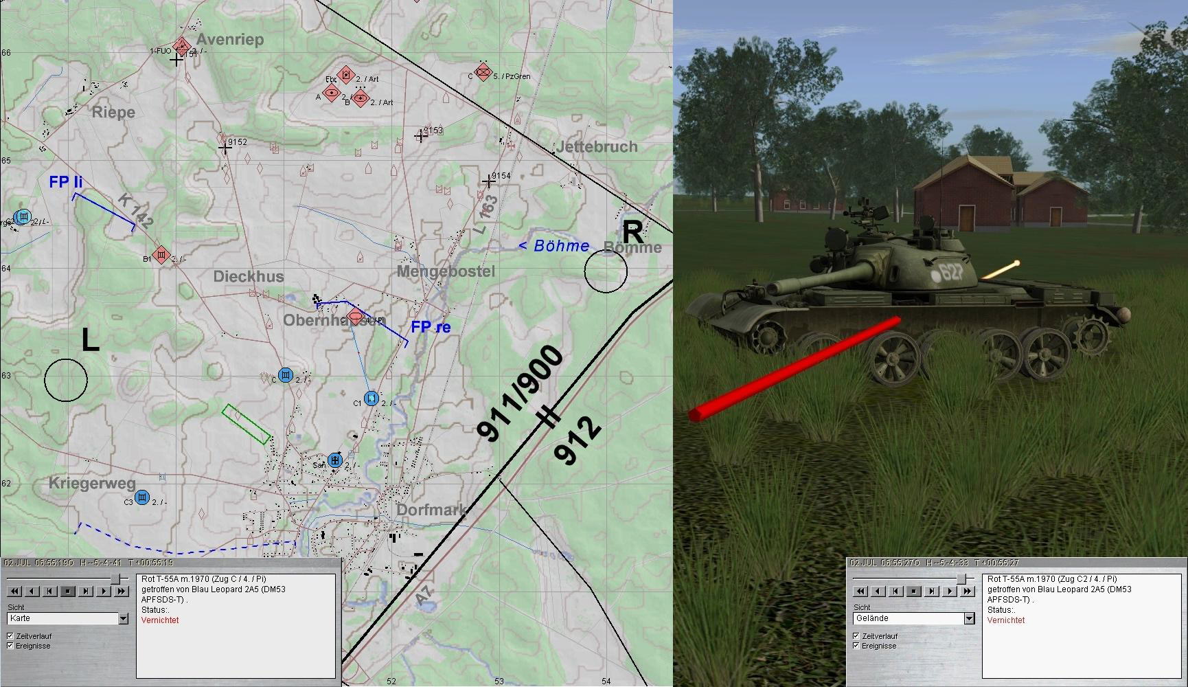 Nun meldete LUCHS 1 Feindpanzer und wurde wenig später vernichtet. C2 und C3 standen bereit. Ein schneller Treffer bei C2 zwangen den BergeTrp zum Abschleppen des C2. C-Zg wich aus. Abraxas erhielt anschließend C1. Die T-80 Kp konnte vernichtet werden, ebenso die herangeführten Pi-Kräfte. Die fdl ArtBtr konnte nichtmehr bekämpft werden:
