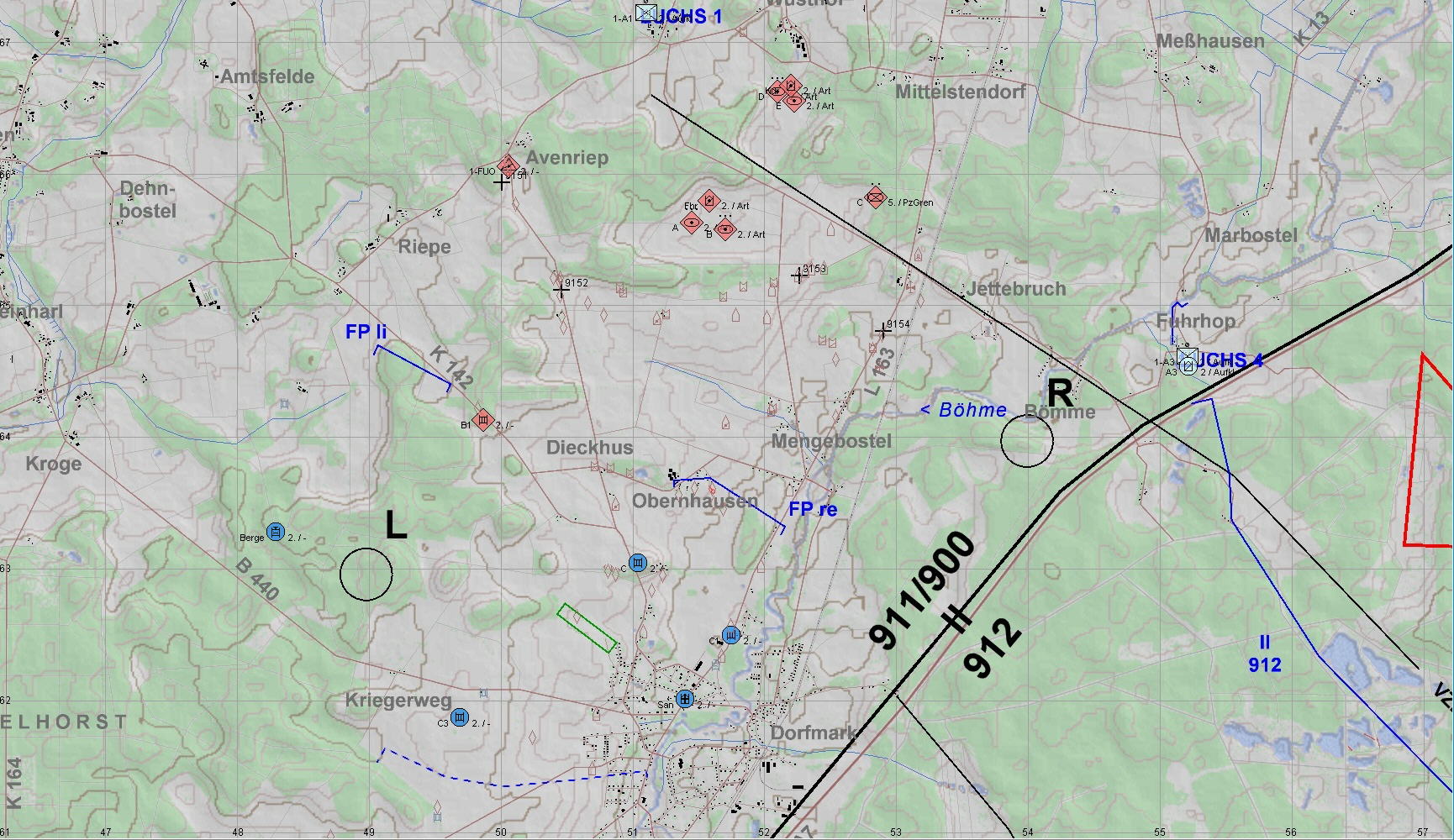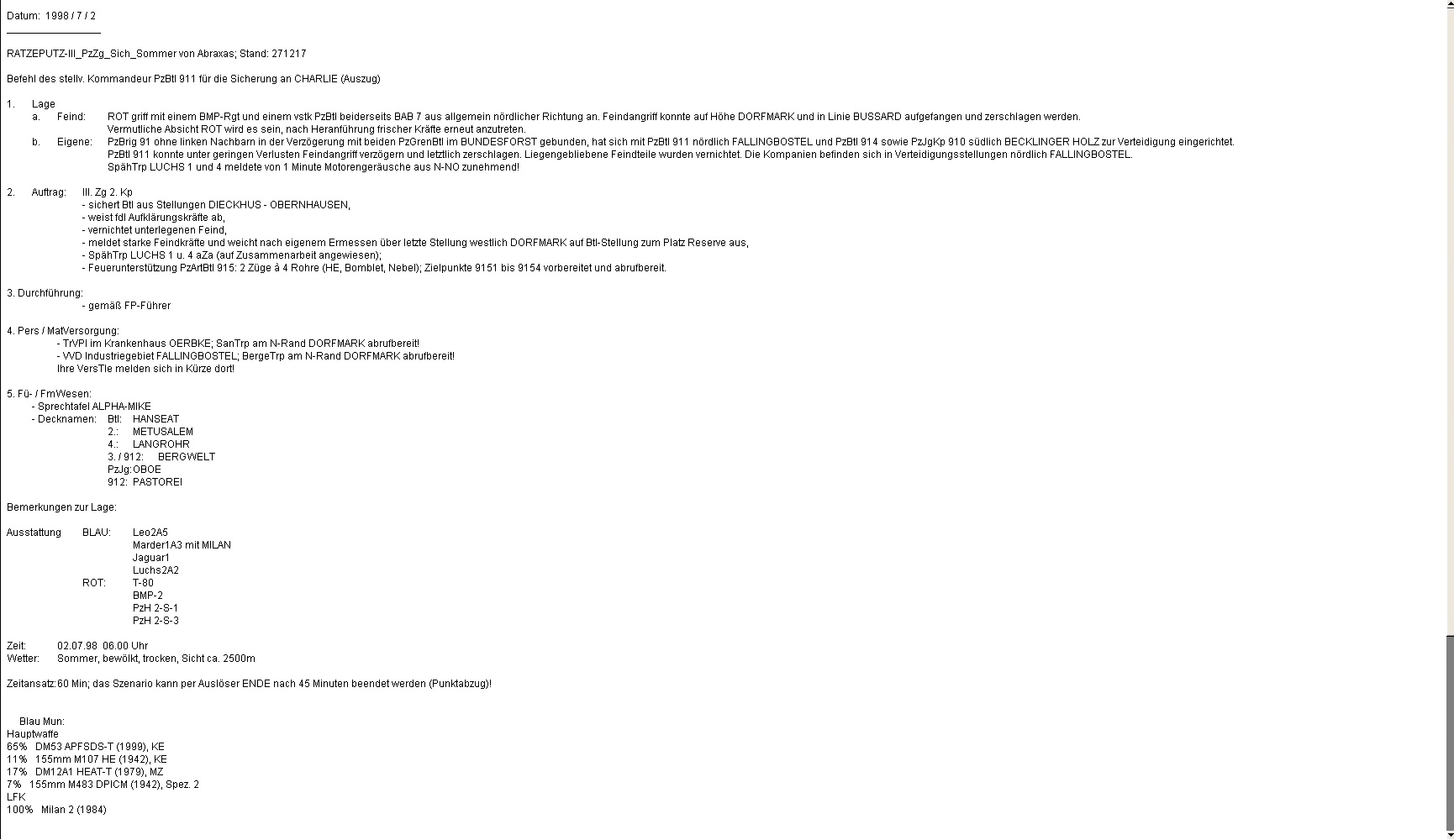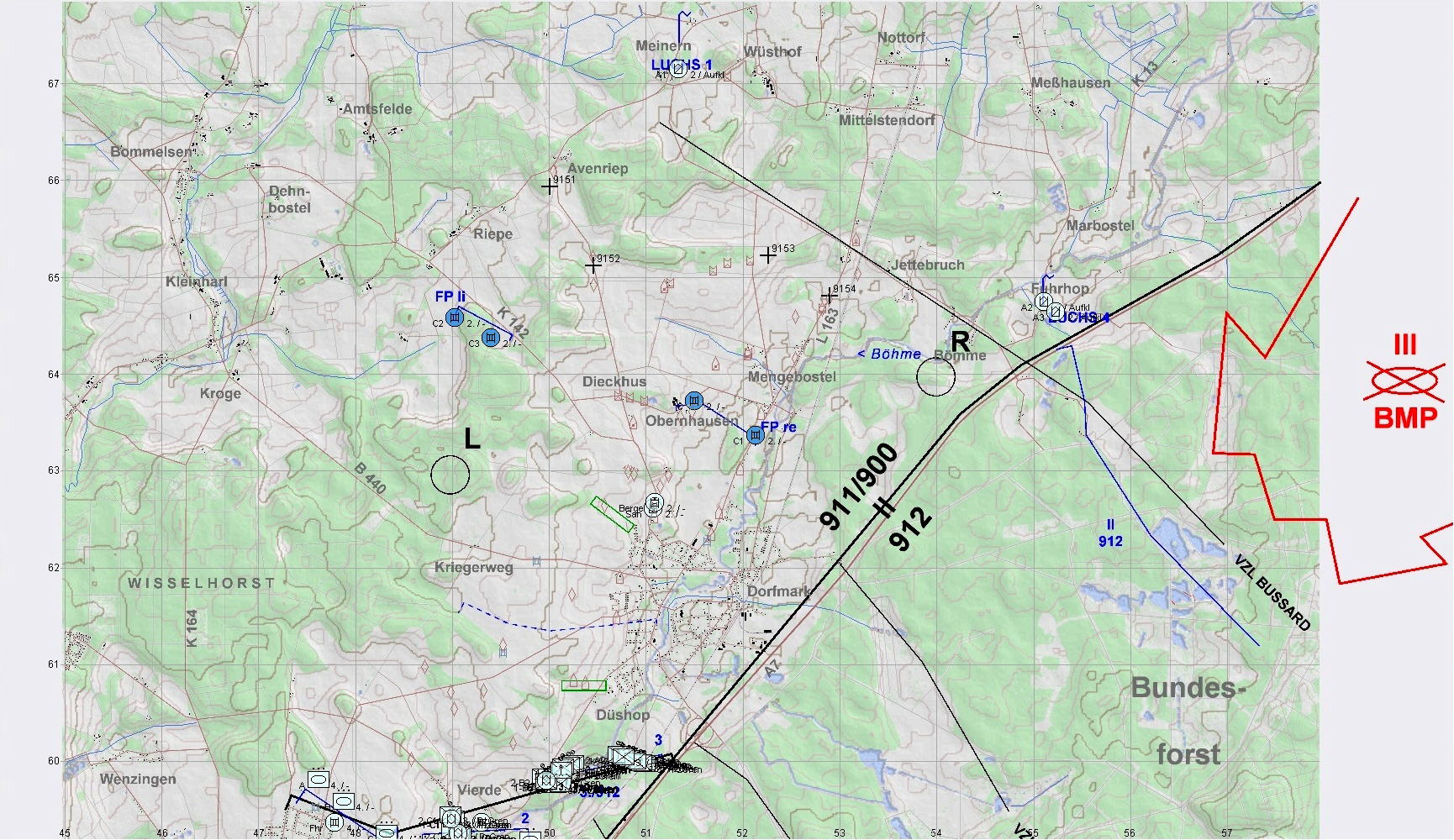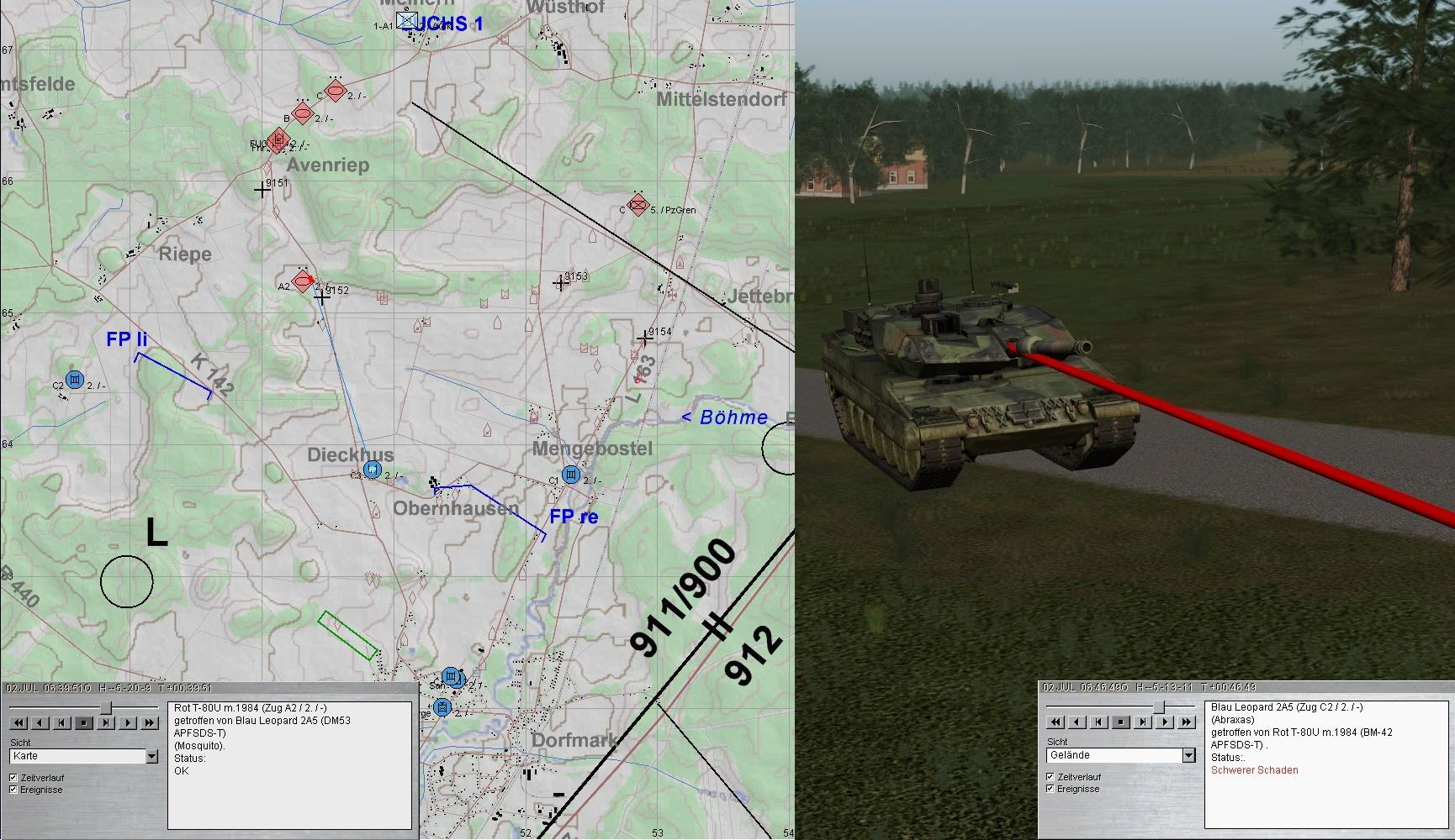 Nun meldete LUCHS 1 Feindpanzer und wurde wenig später vernichtet. C2 und C3 standen bereit. Ein schneller Treffer bei C2 zwangen den BergeTrp zum Abschleppen des C2. C-Zg wich aus. Abraxas erhielt anschließend C1. Die T-80 Kp konnte vernichtet werden, ebenso die herangeführten Pi-Kräfte. Die fdl ArtBtr konnte nichtmehr bekämpft werden: