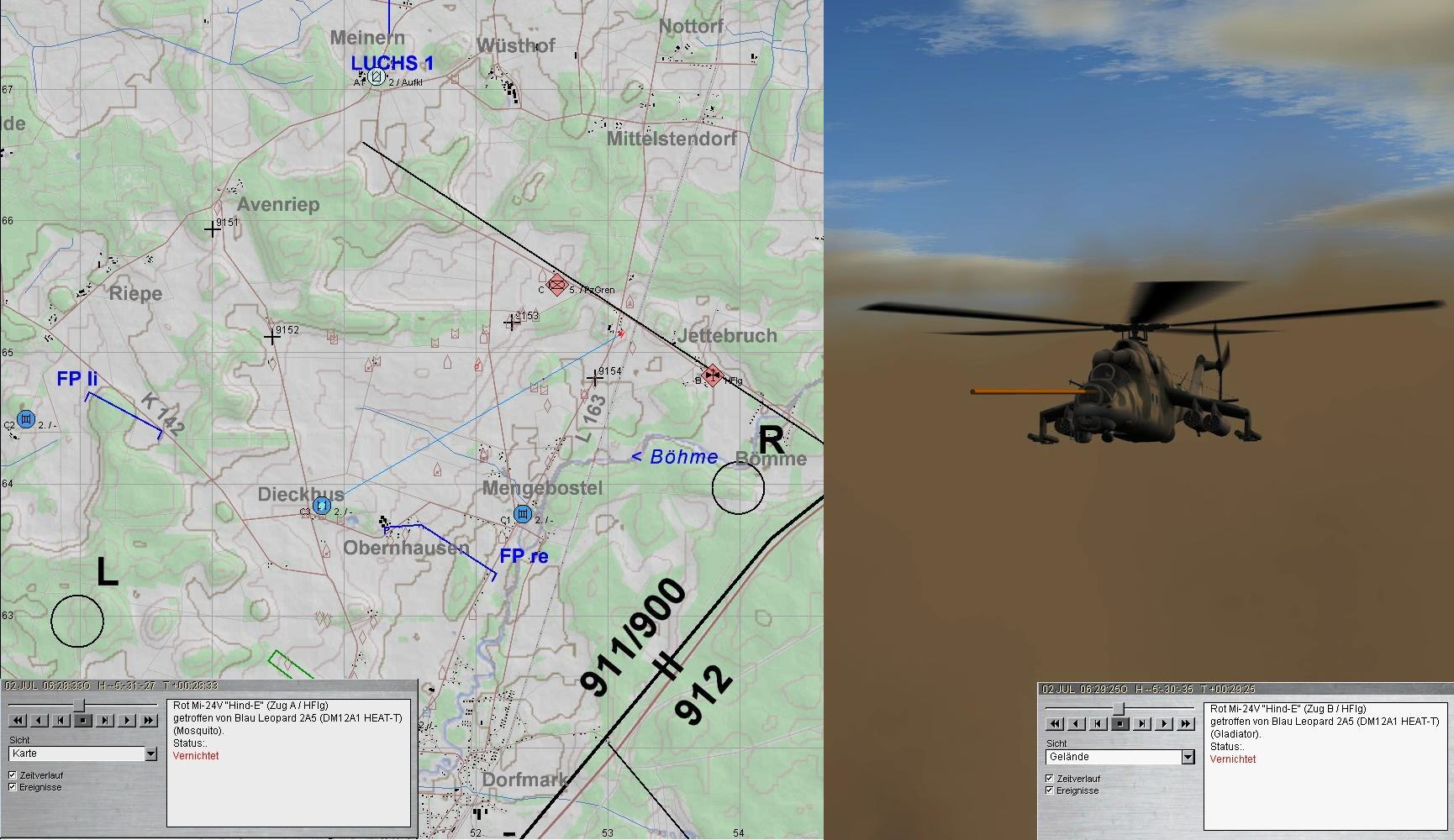 Wenig später griff eine BMP-Kp an. C-Zg stand bereit und konnte den Angriff abweisen. Eine Hausecke zwang C dazu den Berge- und SanTrp anzufordern. Der MKF von C wurde in Deckung versorgt, während dessen griffen 2 HIND an:
