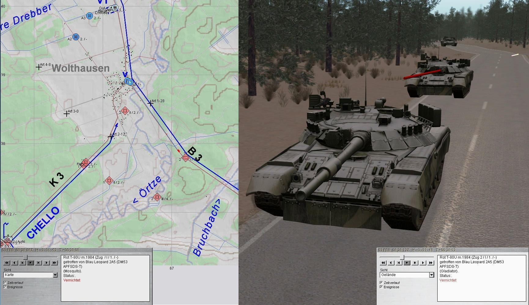 A1, A2 und 3 wichen auf Stellungen 1 und 2 aus. Dabei wurde der Feuerkampf auf BMP und T-80 fortgesetzt: