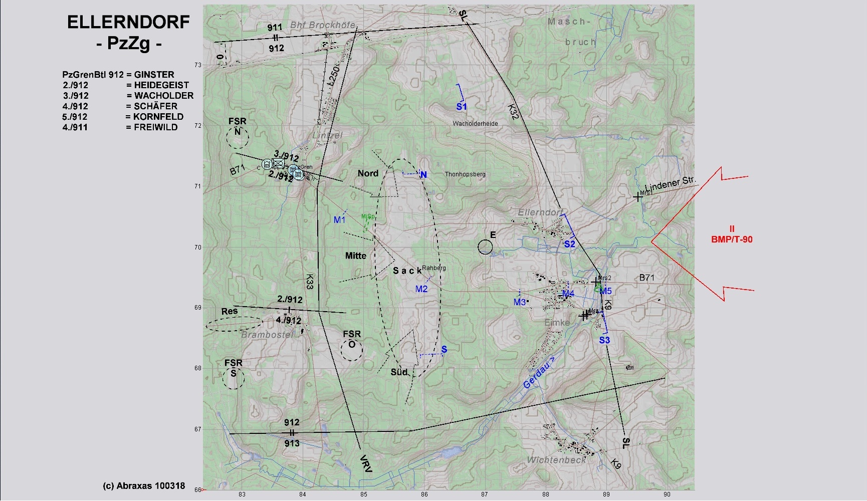 Während die Pioniere unter dem Schutz der PzGren und Pz an der Brücke die Ladungen anbrachten, trat die 1. Staffel des vstkBtl mit 2 BMP-Kp auf ELLERNDORF und EIMKE an. A-Zg eröffnete den Feuerkampf:
