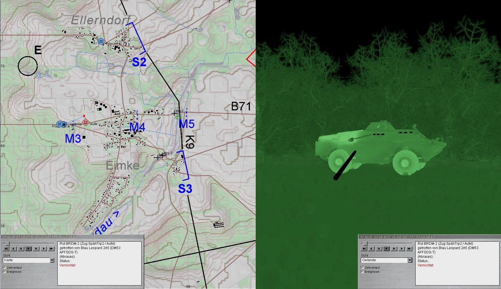 A-Zg trat mit Höchstgeschwindigkeit Richtung Stellungen S2 und S3 an, PzGren und Pi folgten. A2 traf überraschend auf erste Aufklärungsteile am NW-Rand EIMKE. Während 1 BRDM vernichtet wurde, fuhr der 2. gegen einen Baum und blieb mit verletzter Besatzung unbeachtet liegen. In Stellung S3 traf 2. PzGrp auf weitere fdl Aufklärungskräfte: