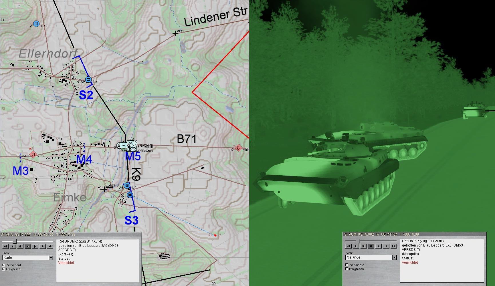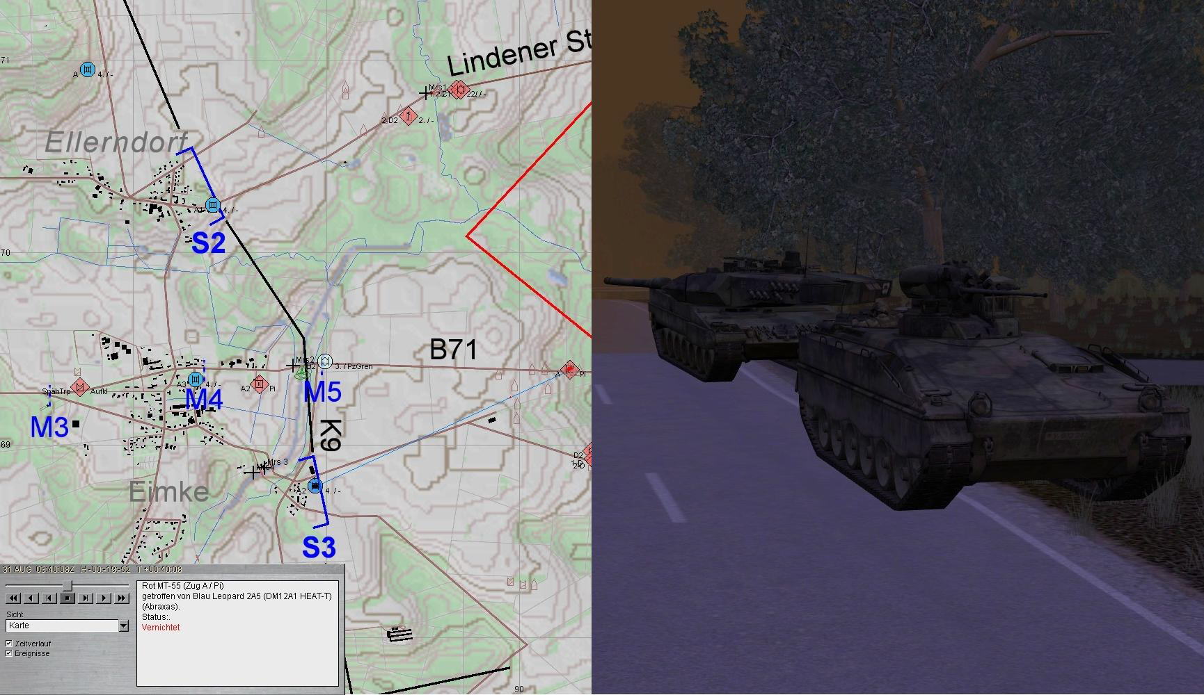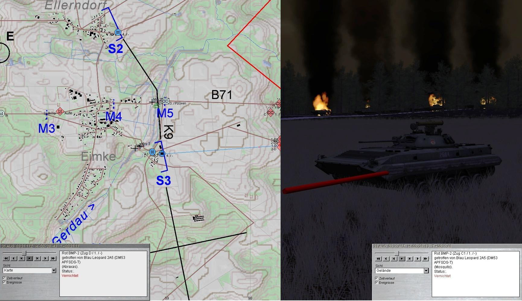 Im Zuge dieses Gefechtes wurde Kdt und MKF des B2-SPz verletzt. A3 erhielt den Auftrag den SPz zu bergen und Richtung Stellung S zu schleppen. Währenddessen ging das Gefecht weiter. ROT führte seine 2. Staffel ein, T-90-Kp im N und BMP-Kp im S unterstützt von Artillerie und PiKräften: