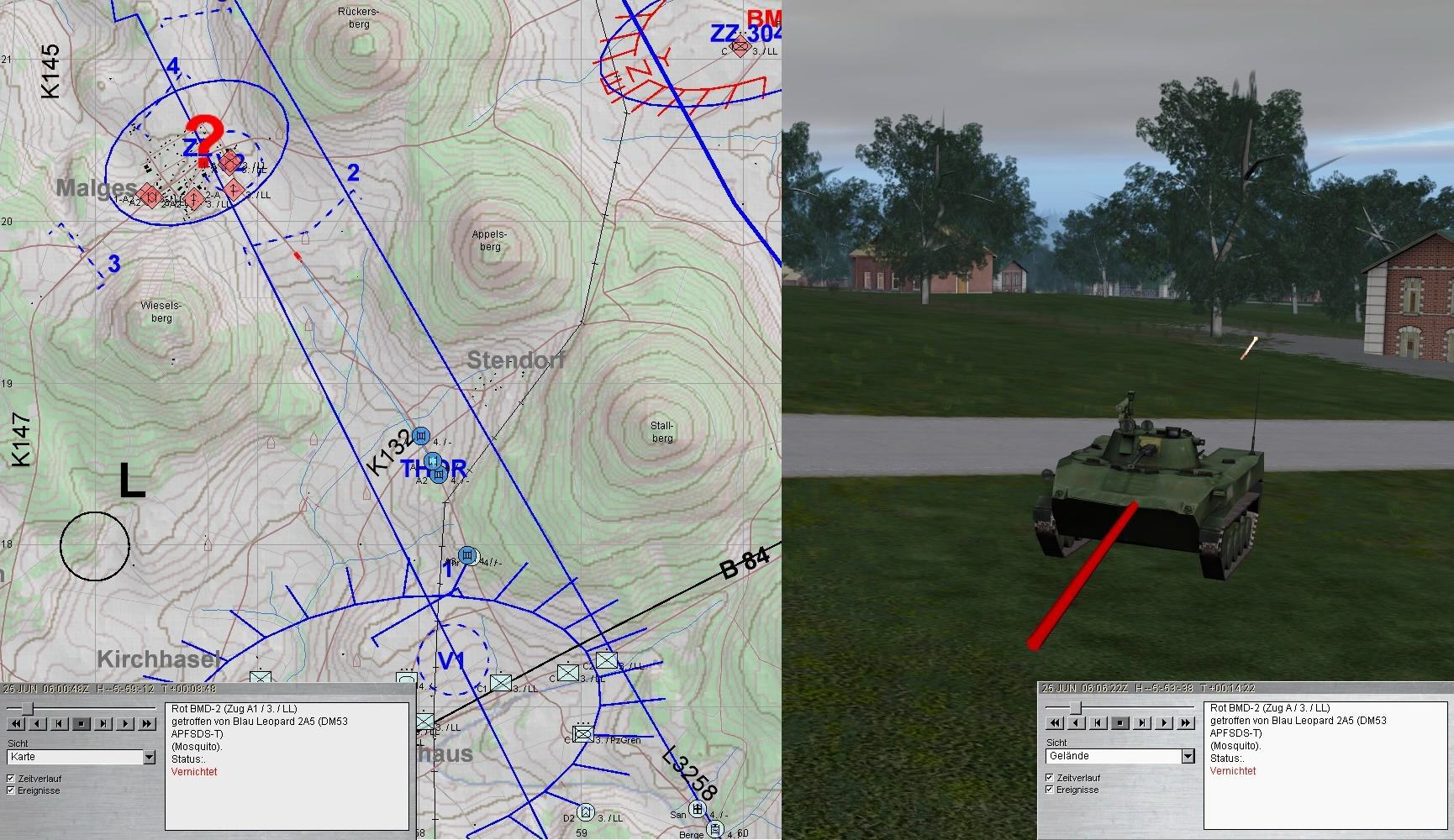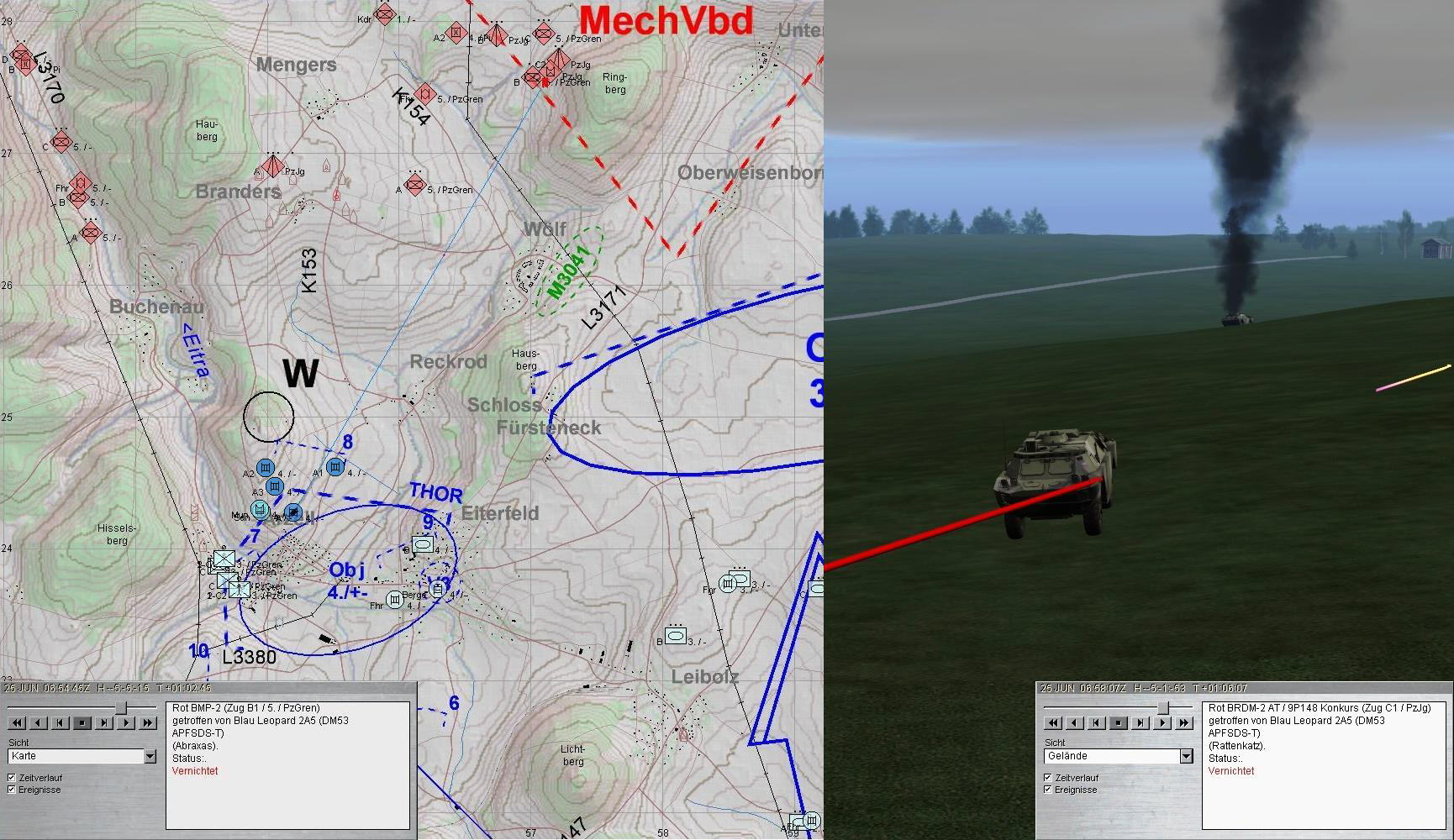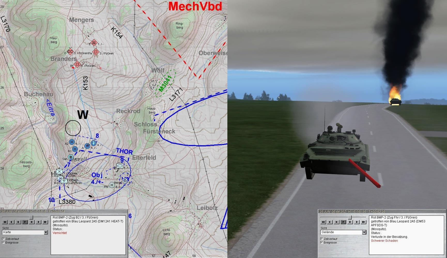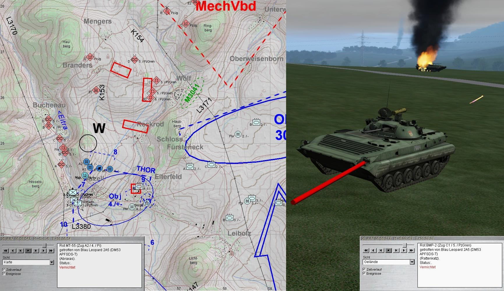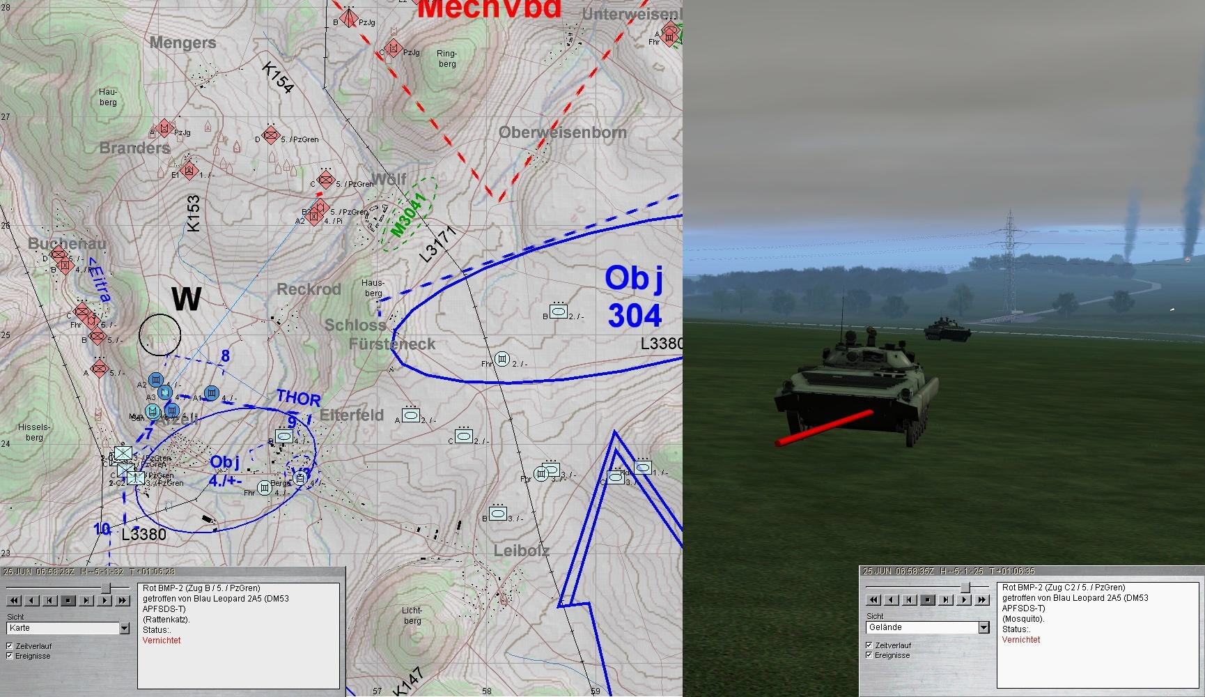Nach dem Zerschlagen der BMP-Kp konnte A-Zg die SanVers abschließen und Mun ergänzen. Dann kam es dicke: eine BMP-Kp aus Nordwest im Zuge der EITRA, eine weitere aus Norden und das Btl hatte ein T-80-Btl vor sich.