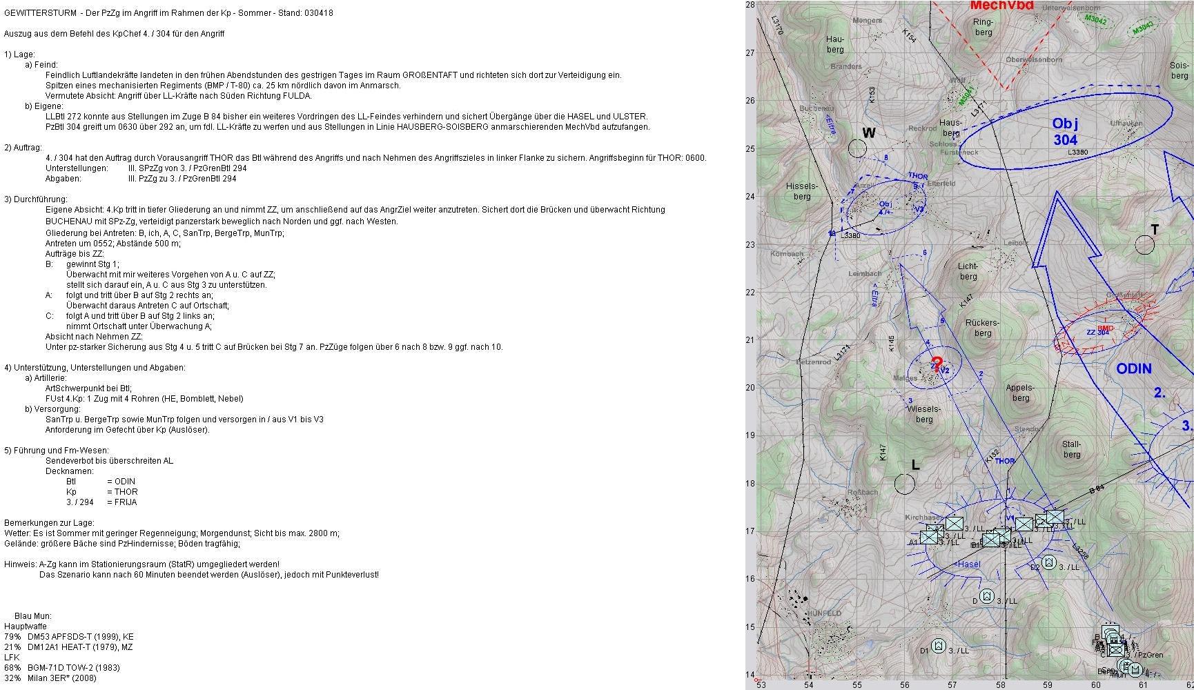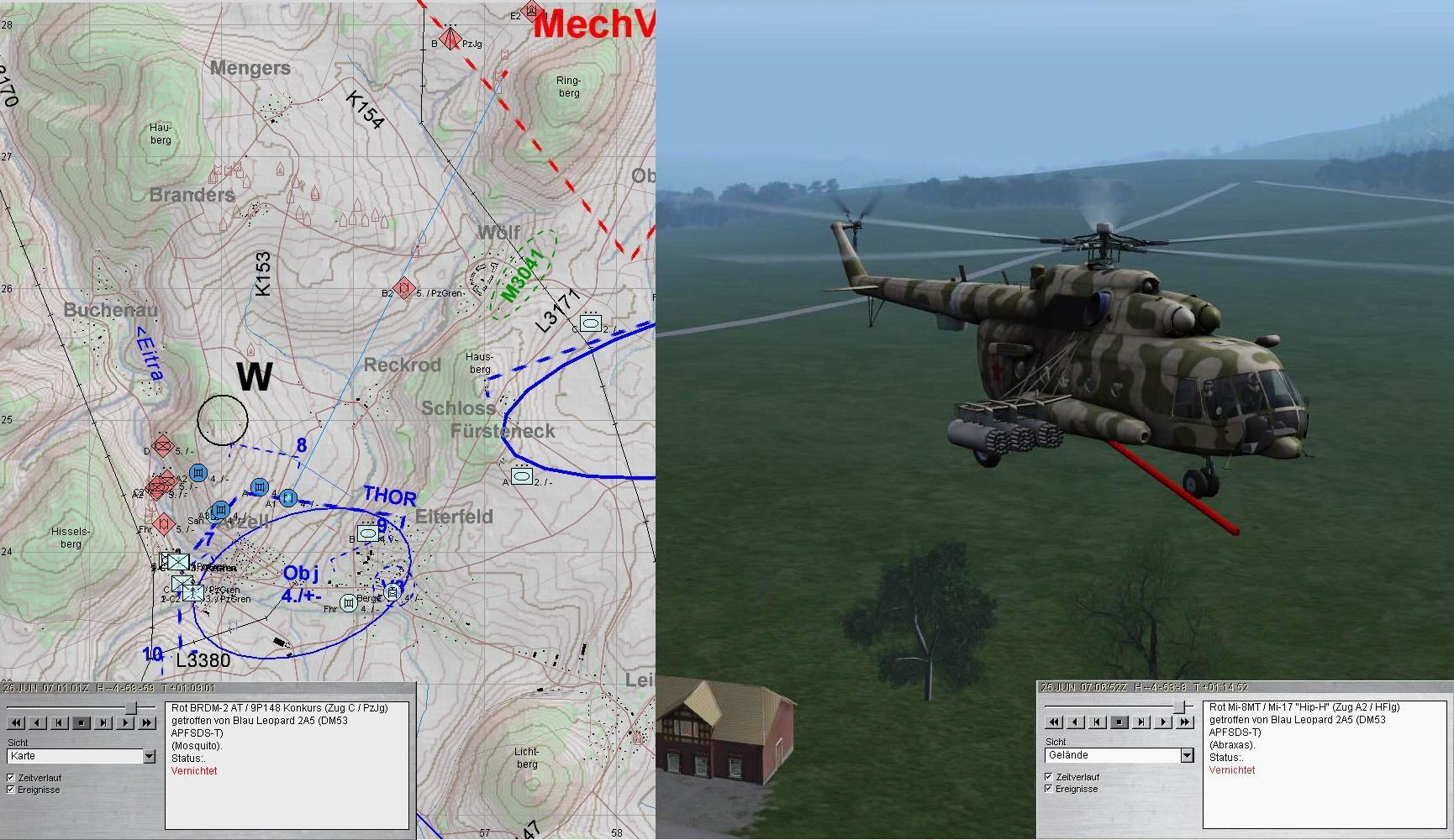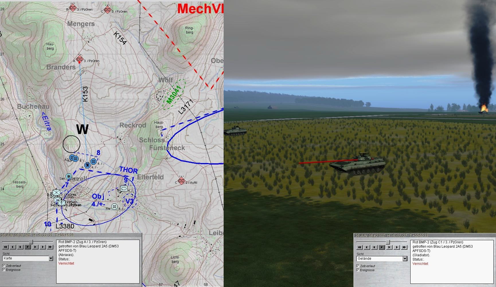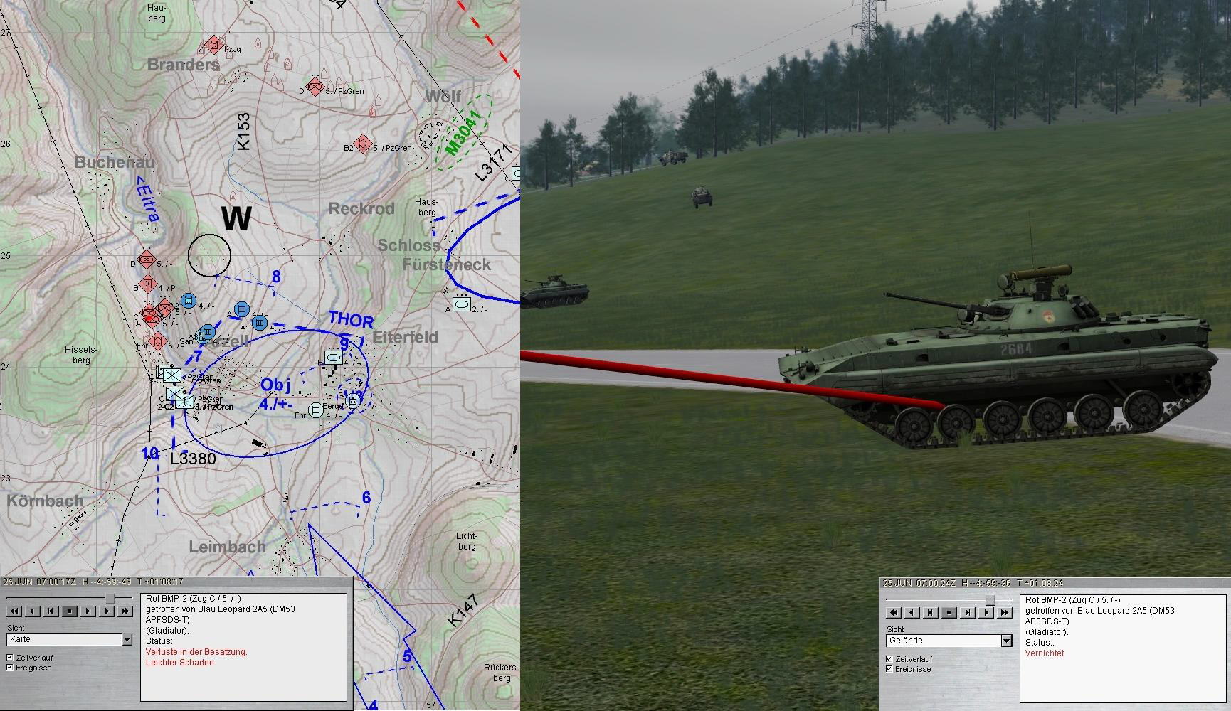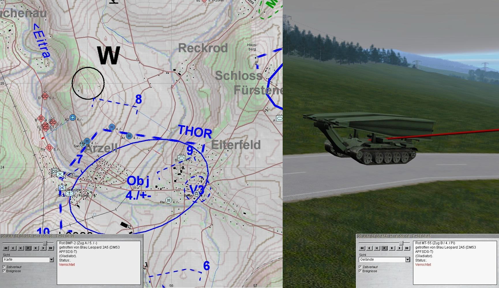 Nach dem Zerschlagen der BMP-Kp konnte A-Zg die SanVers abschließen und Mun ergänzen. Dann kam es dicke: eine BMP-Kp aus Nordwest im Zuge der EITRA, eine weitere aus Norden und das Btl hatte ein T-80-Btl vor sich.