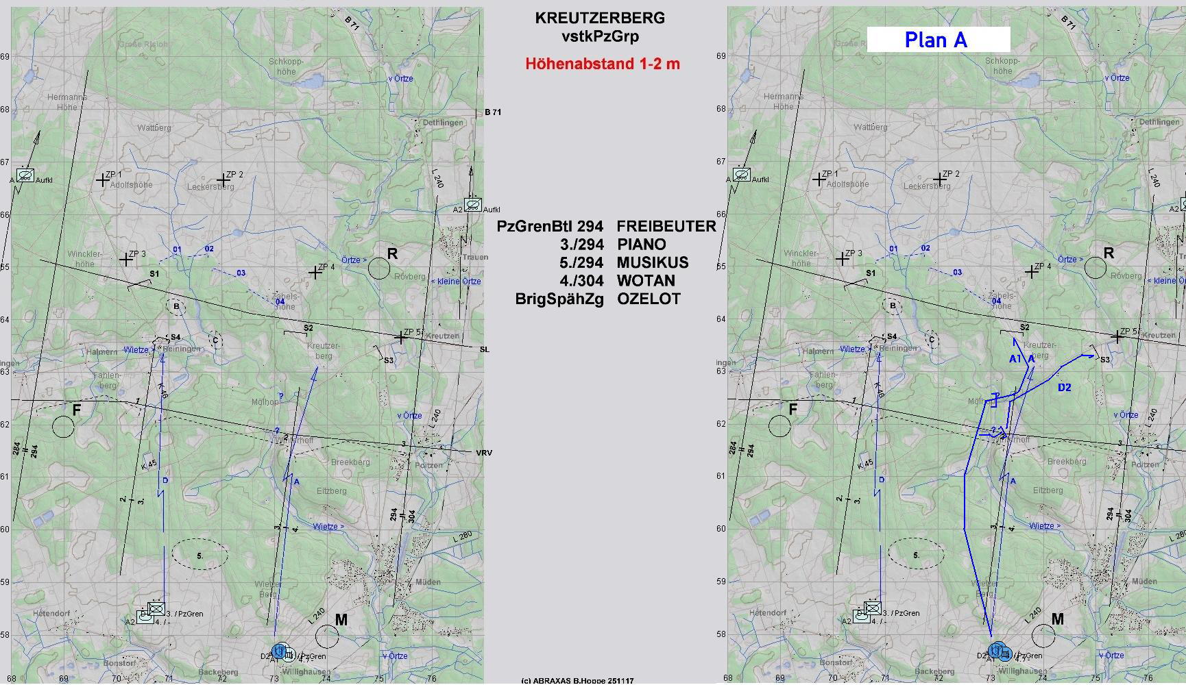 Es folgte eine T-80-Kp und eine weitere BMP-Kp nördlich A. Während die T-80-Kp direkt nach Süden antrat, holte die BMP-Kp nach Südosten aus, um uns über KREUTZEN in die Flanke zu fallen.