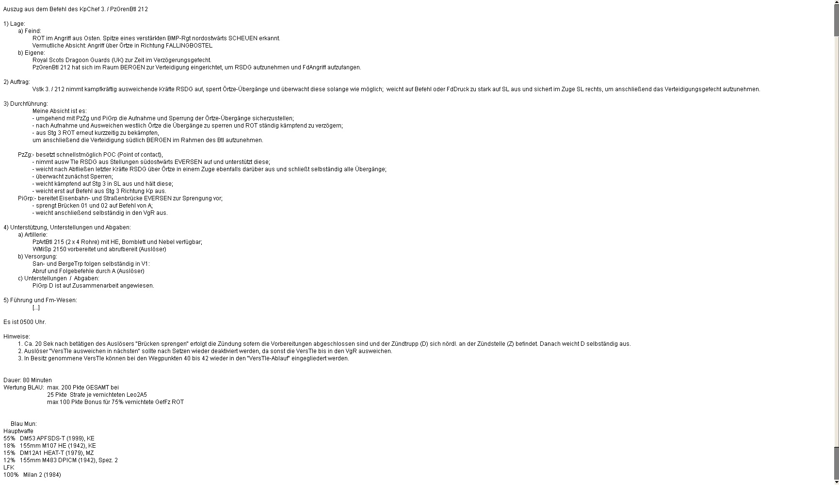 Ein nachstoßender, letzter fdl Räumpanzer T-72 wurde von A1 vernichtet. Die übrigen Feindkräfte blieben - sofern sie nicht vernichtet wurden - bewegungsunfähig oder in der ÖRTZE liegen: SIEG!