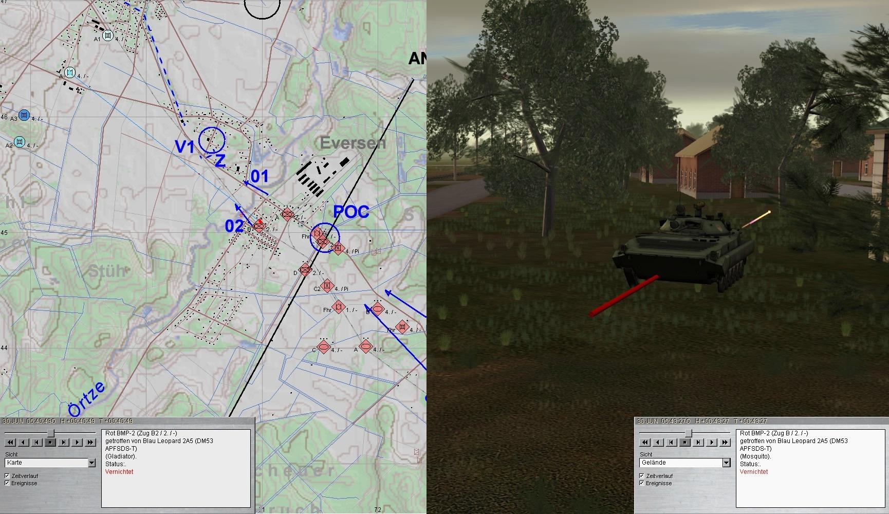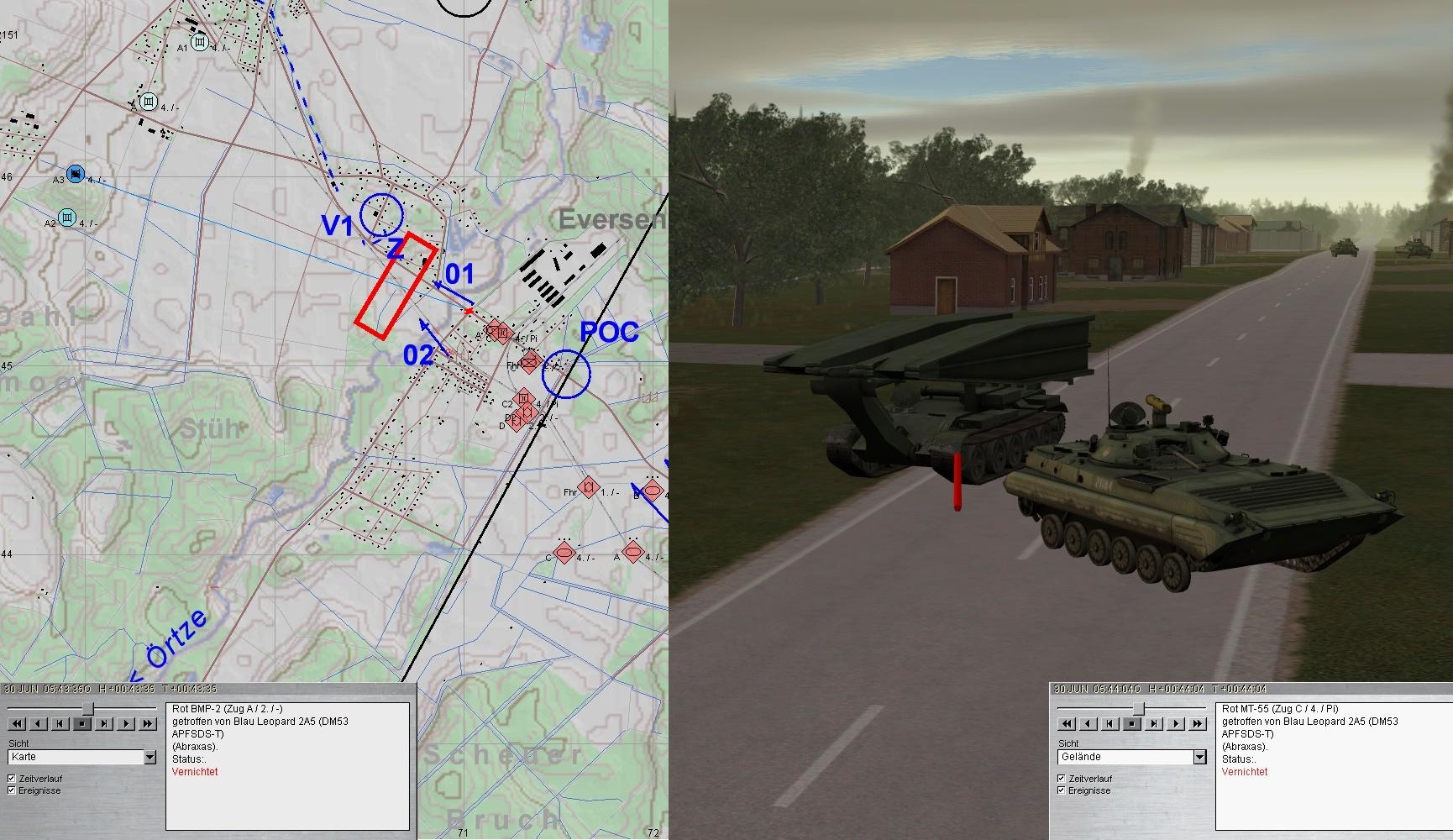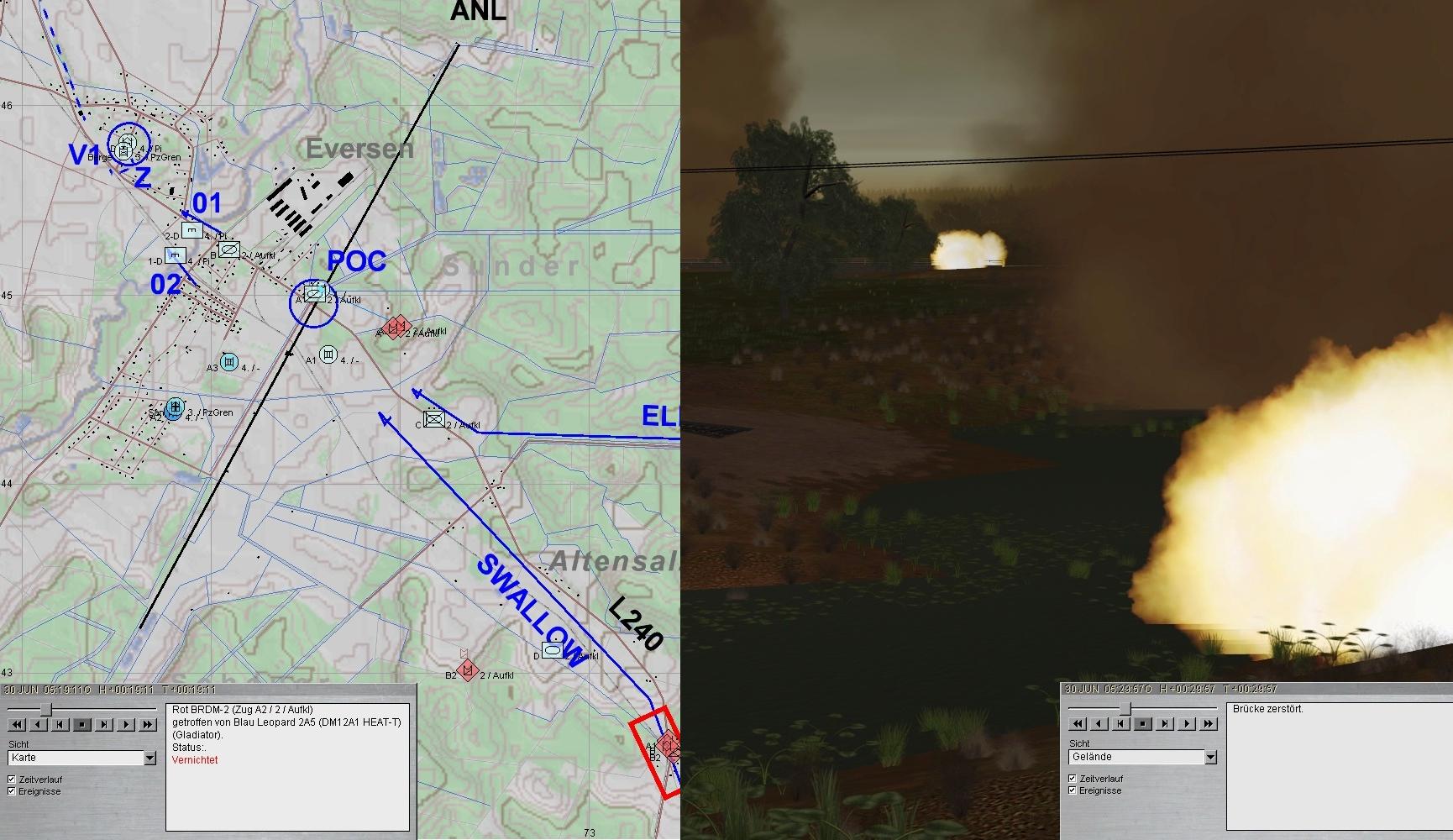 Während die PiGrp und die VersTle auswichen, eröffnete A aus den Stg 2.1 und 2.2 den Feuerkampf auf erste Teile einer 2. BMP-Kp und fdl Brückenleger: