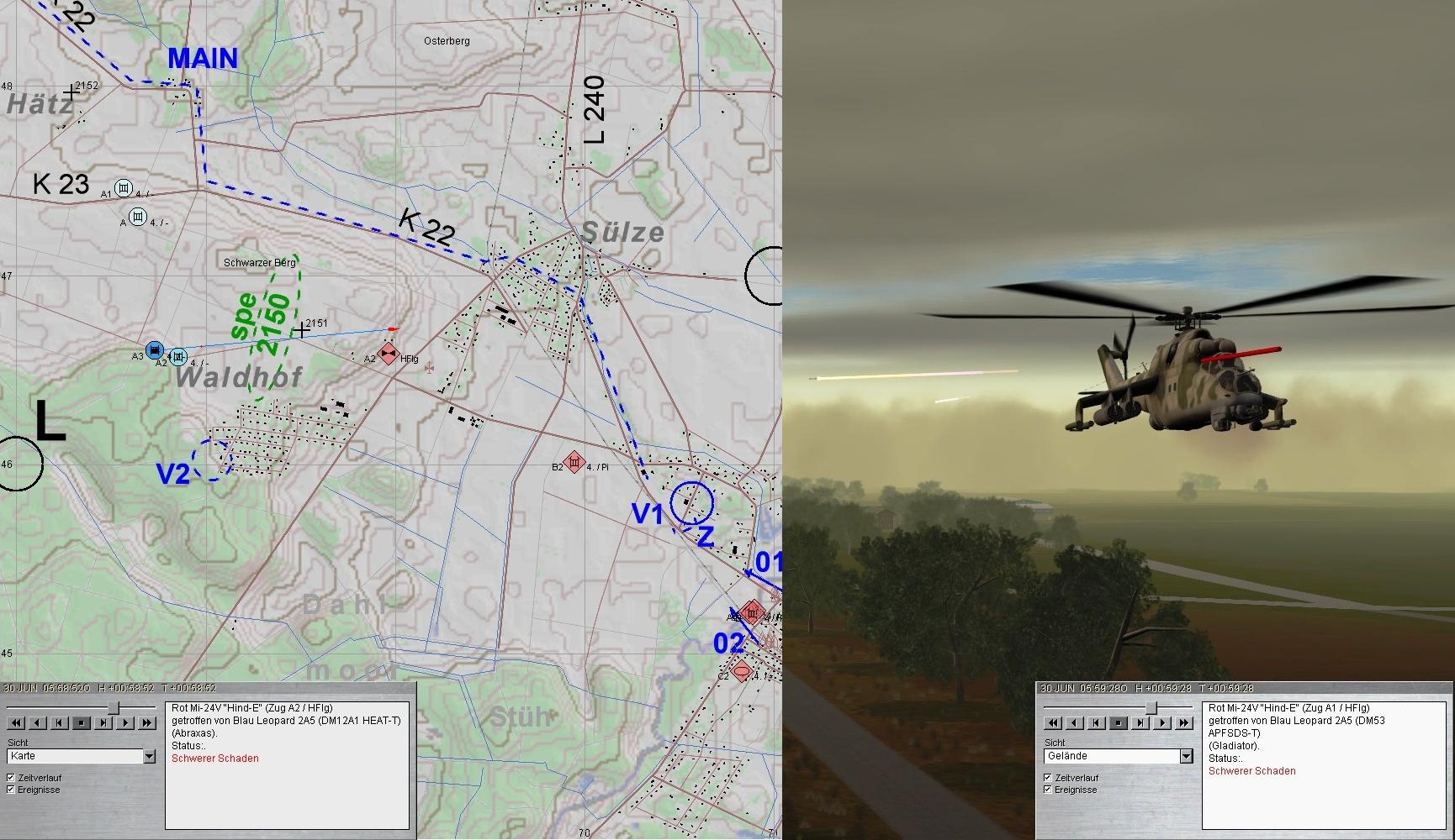 Feind löste nun Artilleriefeuerwalze aus und zwang damit A zum Ausweichen. Nun griff ein Schwarm HIND an. A2 musste 3 LFK schlucken, ohne Schaden! Im Feuer von A konnten die HIND abgeschossen werden.
