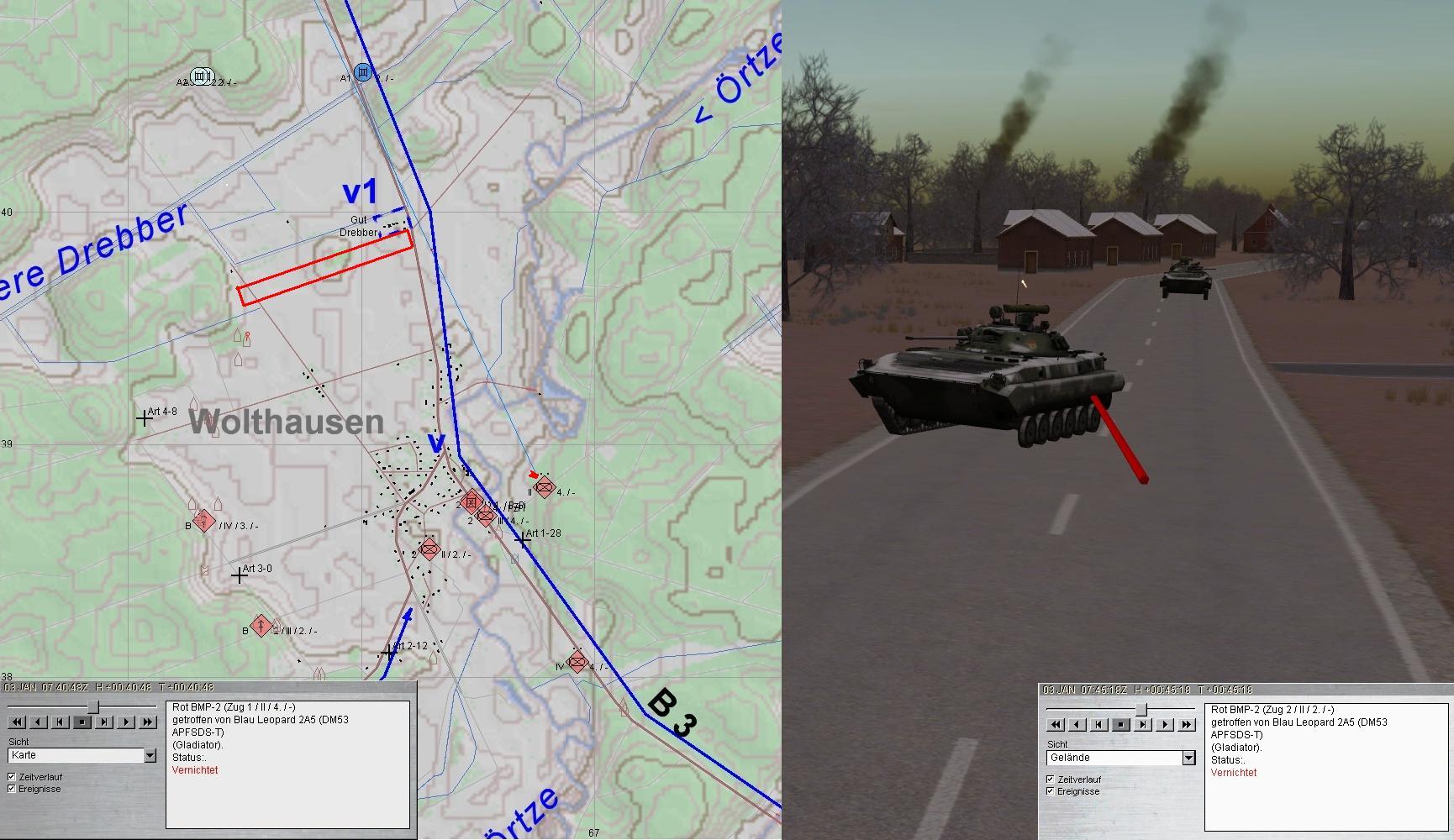 A musste auf Stellungen 3 ausweichen. Im Feuerkampf gelang es, die aus SW angreifende BMP-Kp zu vernichten und erste FdPz und SPz am Nordrand von WOLTHAUSEN abzuschießen.