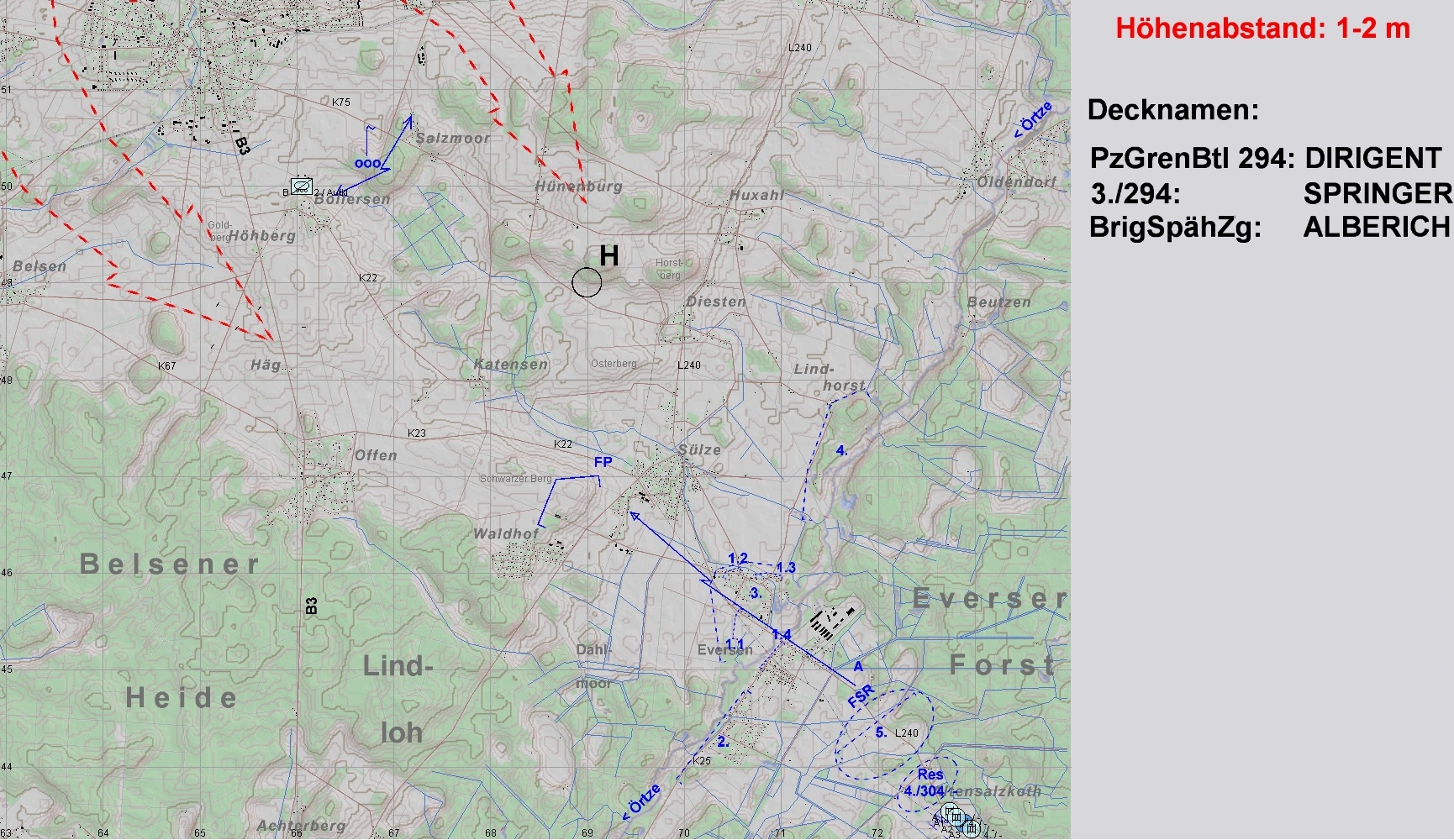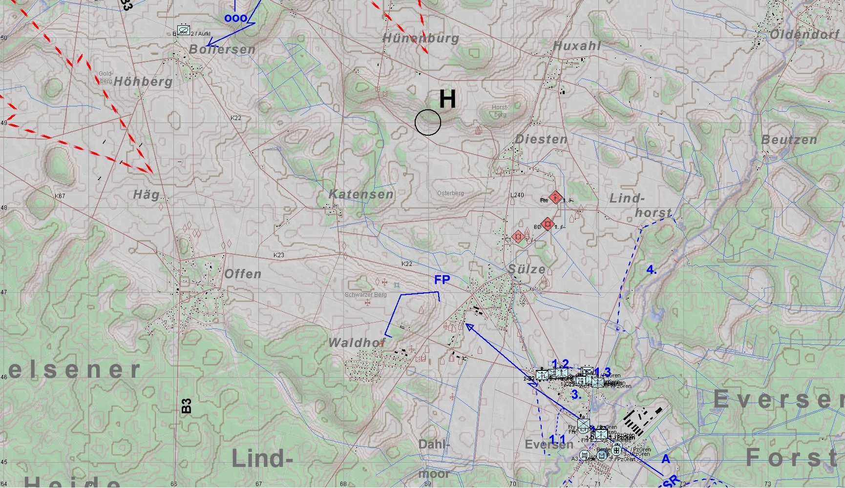 A2 übernahm die Führung und befahl das Ausweichen. A1 und A3 sollten die bedrängten PzGrenZg am N-Rand von EVERSEN unterstützen, A2 sicherte Richtung WALDHOF.