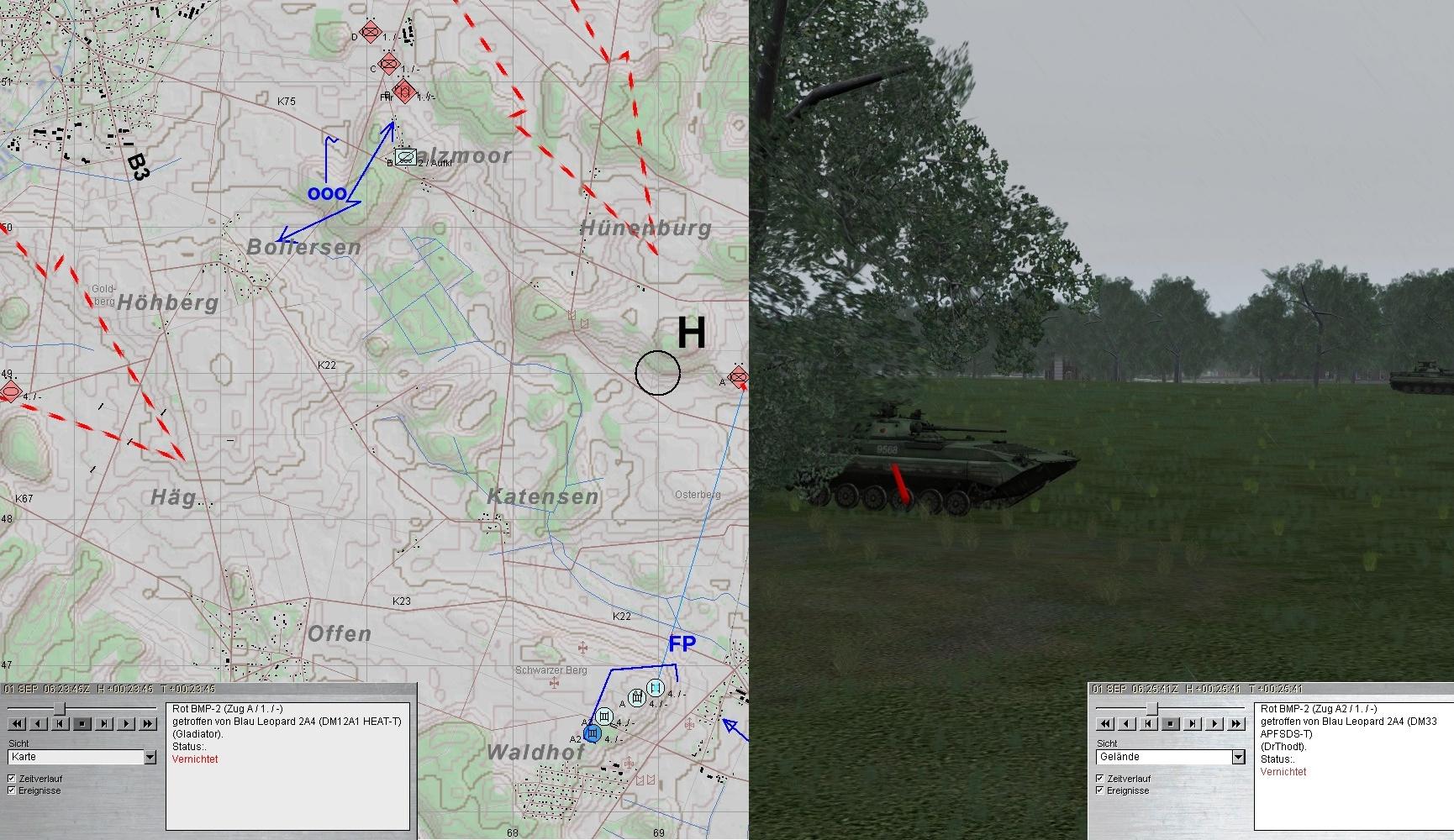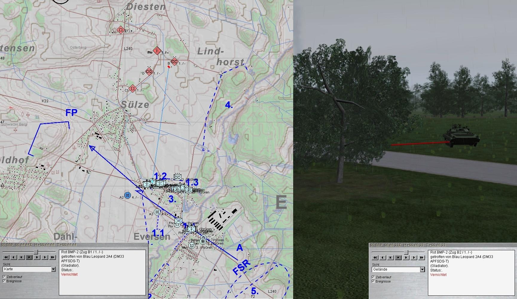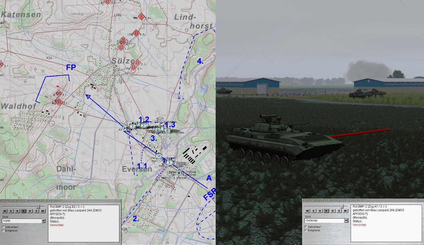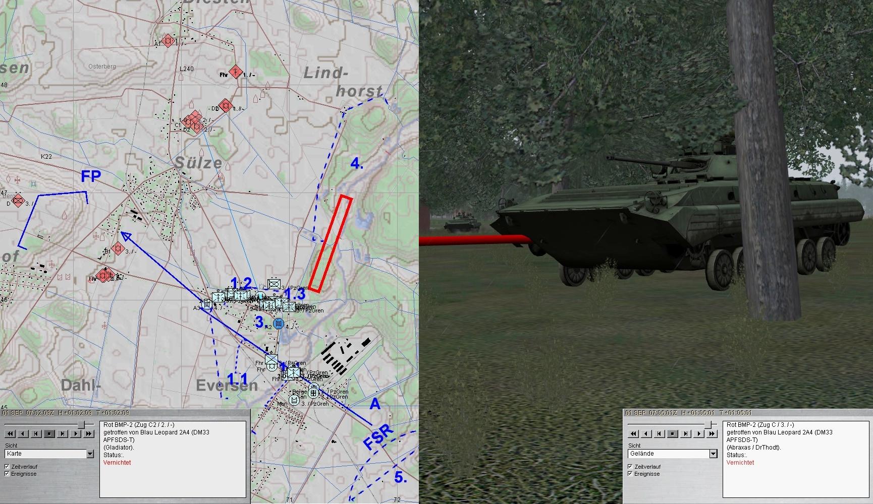 Als die Munition von A1 zur Neige ging, übernahm A2 und A1 wich zum MunTrp aus. Die 2. BMP-Kp im N konnte gestoppt werden.