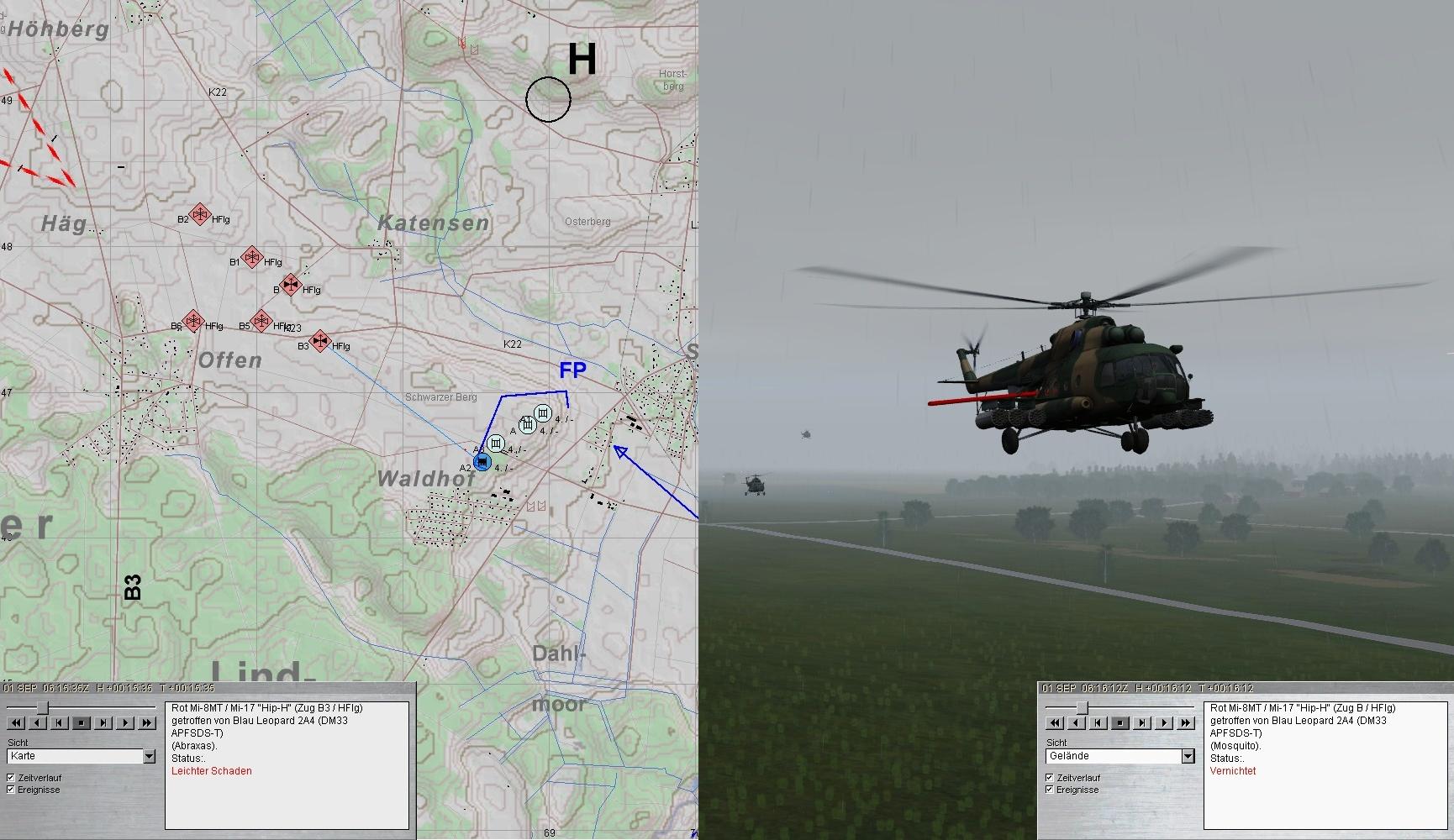 Nach wenigen Minuten warnte ALBERICH vor fdl Hubschraubern. ... und sie kamen! Ein mühsames Unterfangen für unsere Leos, denn die Munition zeigte kaum Wirkung und die Sicht war besch...en. Dennoch konnten 5 der 6 HIP abgeschossen sowie der einzig abgesetzte BMD vernichtet werden:
