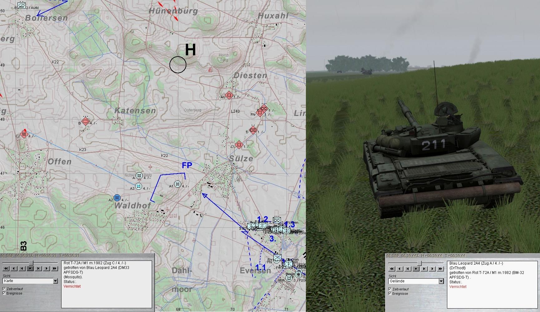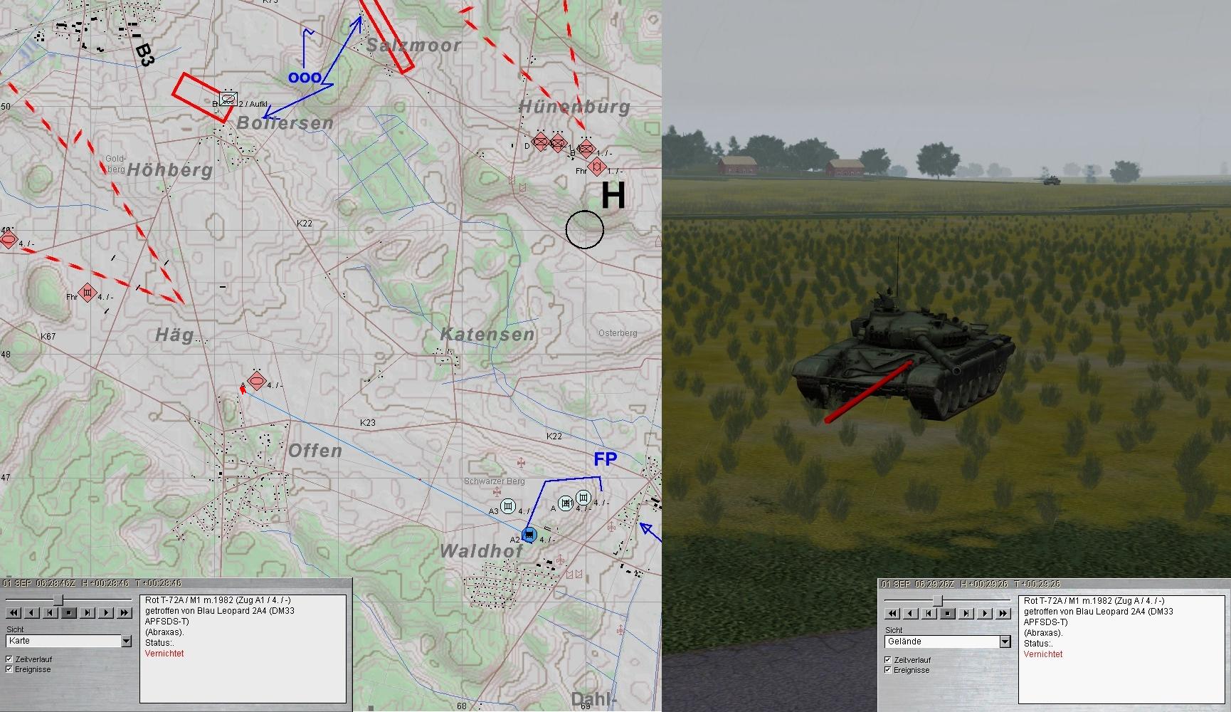 Das sollte sich rächen: A1 konnte dies zahlenmäßig nicht schaffen; A übersah einen T-72-Zg, konnte in letzter Minute zwar noch 2 FdPz vernichten, aber der dritte wurde sein Schicksal: