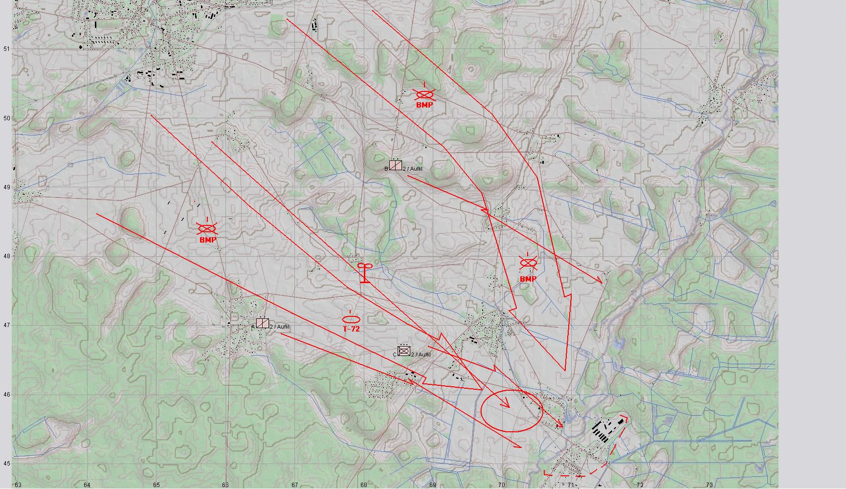 A entschloss sich die 2. Grp gegen die Feindpanzer zu unterstützen, A1 musste die BMP-2 bekämpfen: