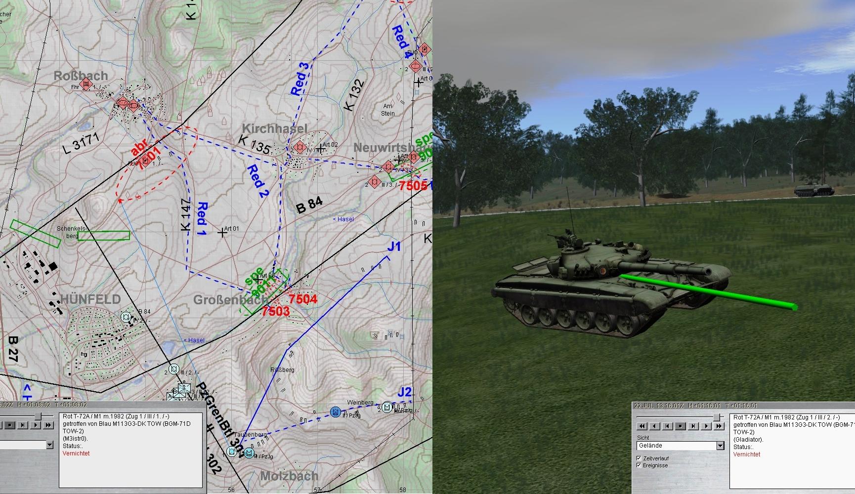 Die BMP-Kp konnte zwar zum Stehen gebracht werden, aber eine T-72-Kp aus Richtung MALGES wurde zu spät erkannt. A1 fiel ihr zum Opfer!
