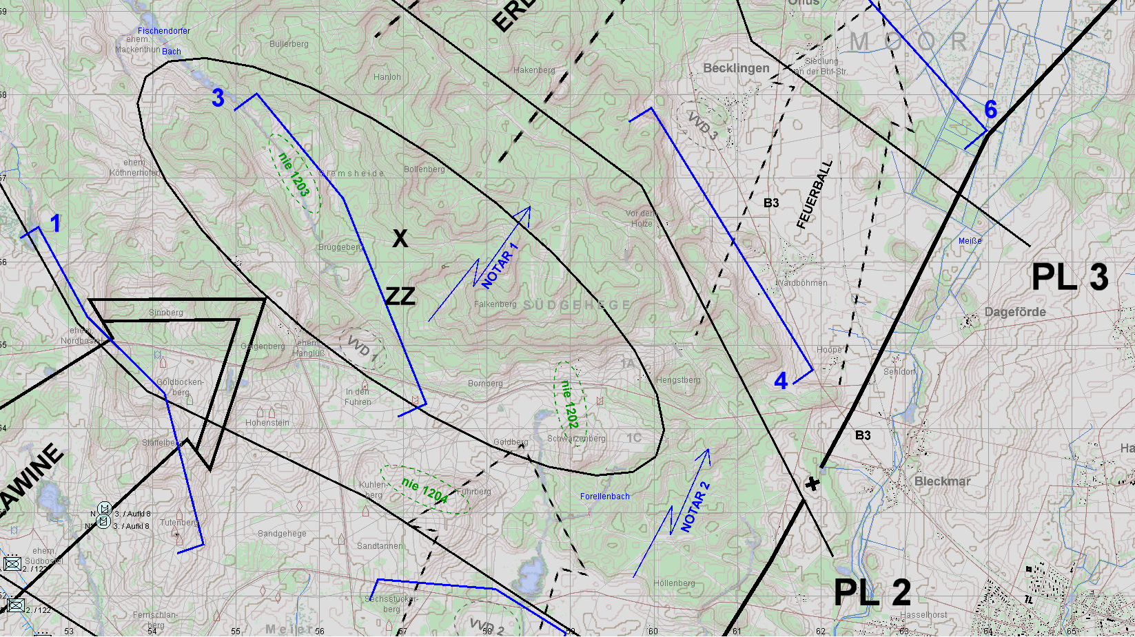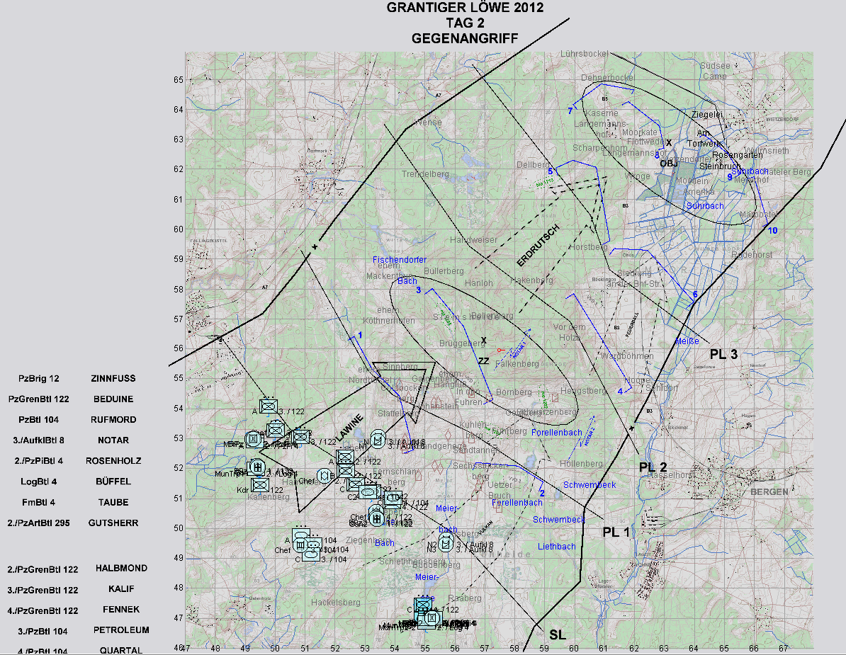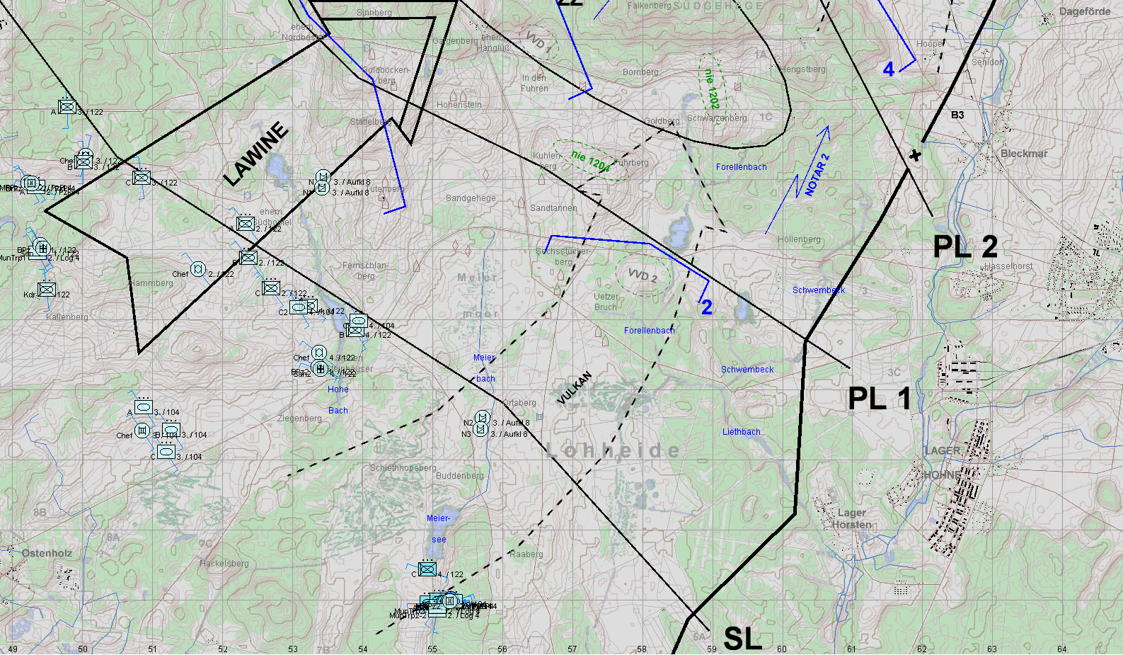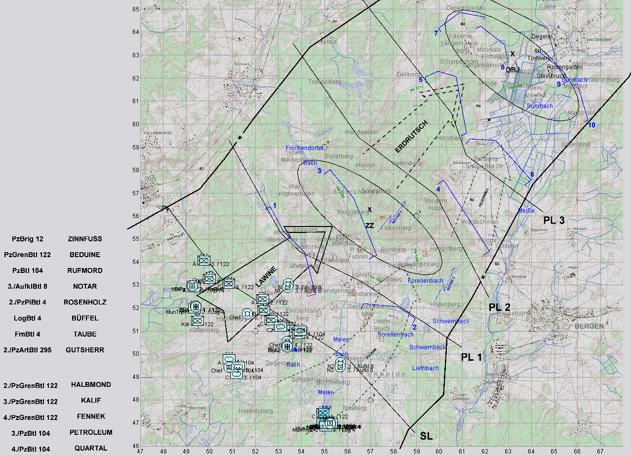 Der Hauptangriff (LAWINE) wird mittig des Gefechtsstreifens durch min. zwei Kompanien des PzGrenBtl 122 durchgeführt. Die 4. PzGrenKp verm. verst. durch einen KPz Zug wird etwas weiter rechts des Hauptangriffs eingesetzt.