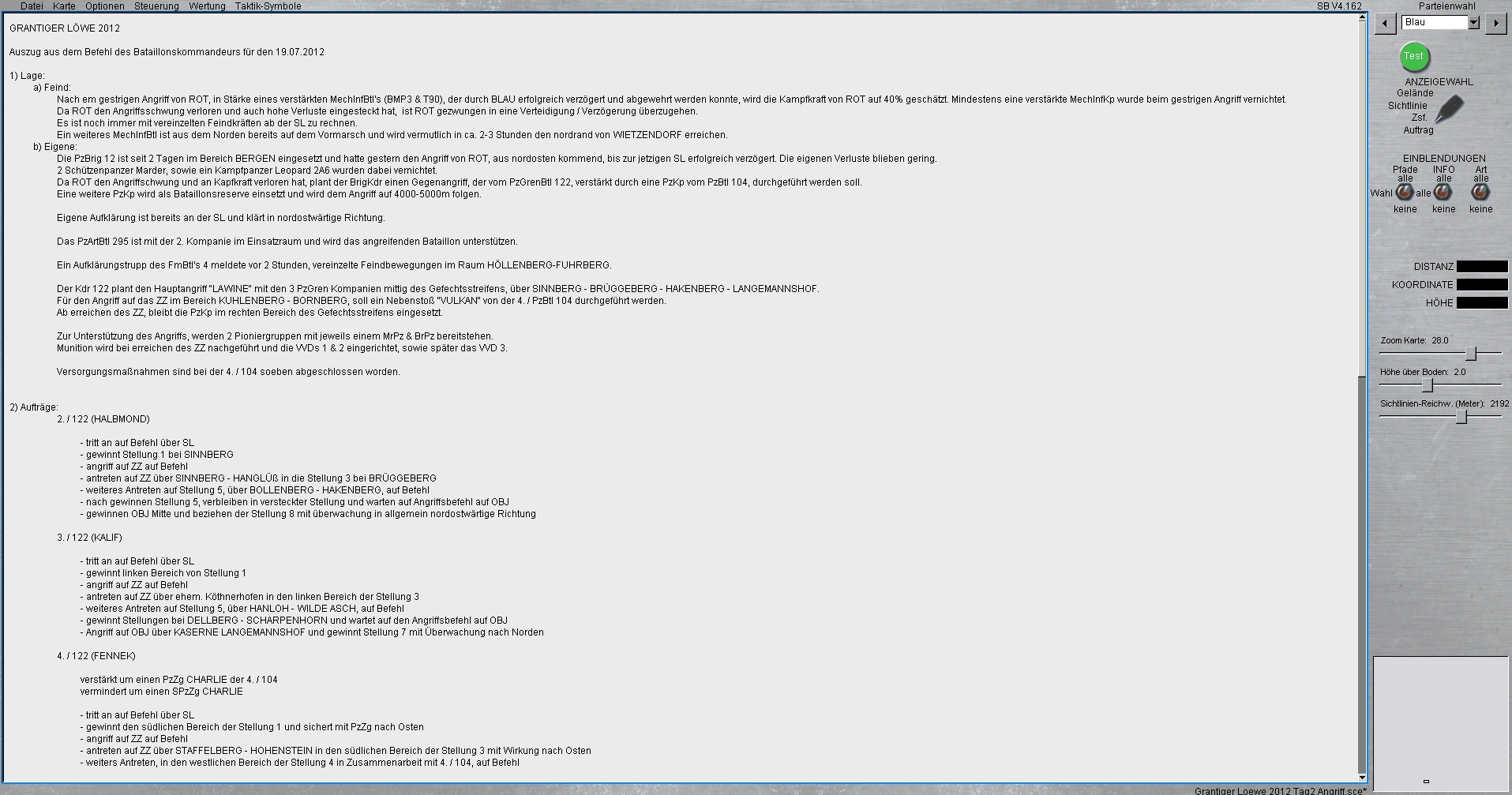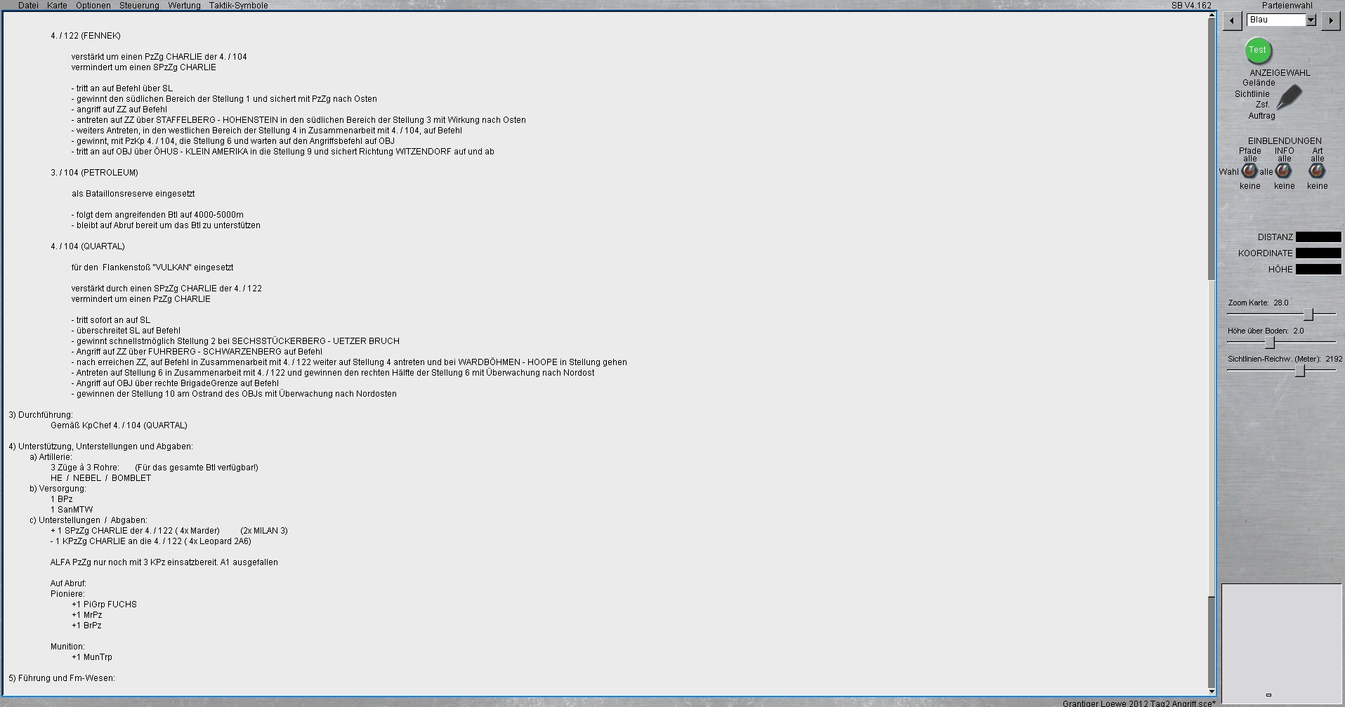 Das PzGrenBtl 122, im Rahmen der Brigade eingesetzt, verstärkt durch 2 Kompanien des PzBtl 104, sowie Teile des PzPiBtl 4, AufklBtl 8, hat durch das erfolgreiche Verzögerungsgefecht nur geringe Ausfälle erlitten und bereitet sich auf den Gegenangriff vor, um das aufgegebene Gelände wieder zurückzuerobern.
