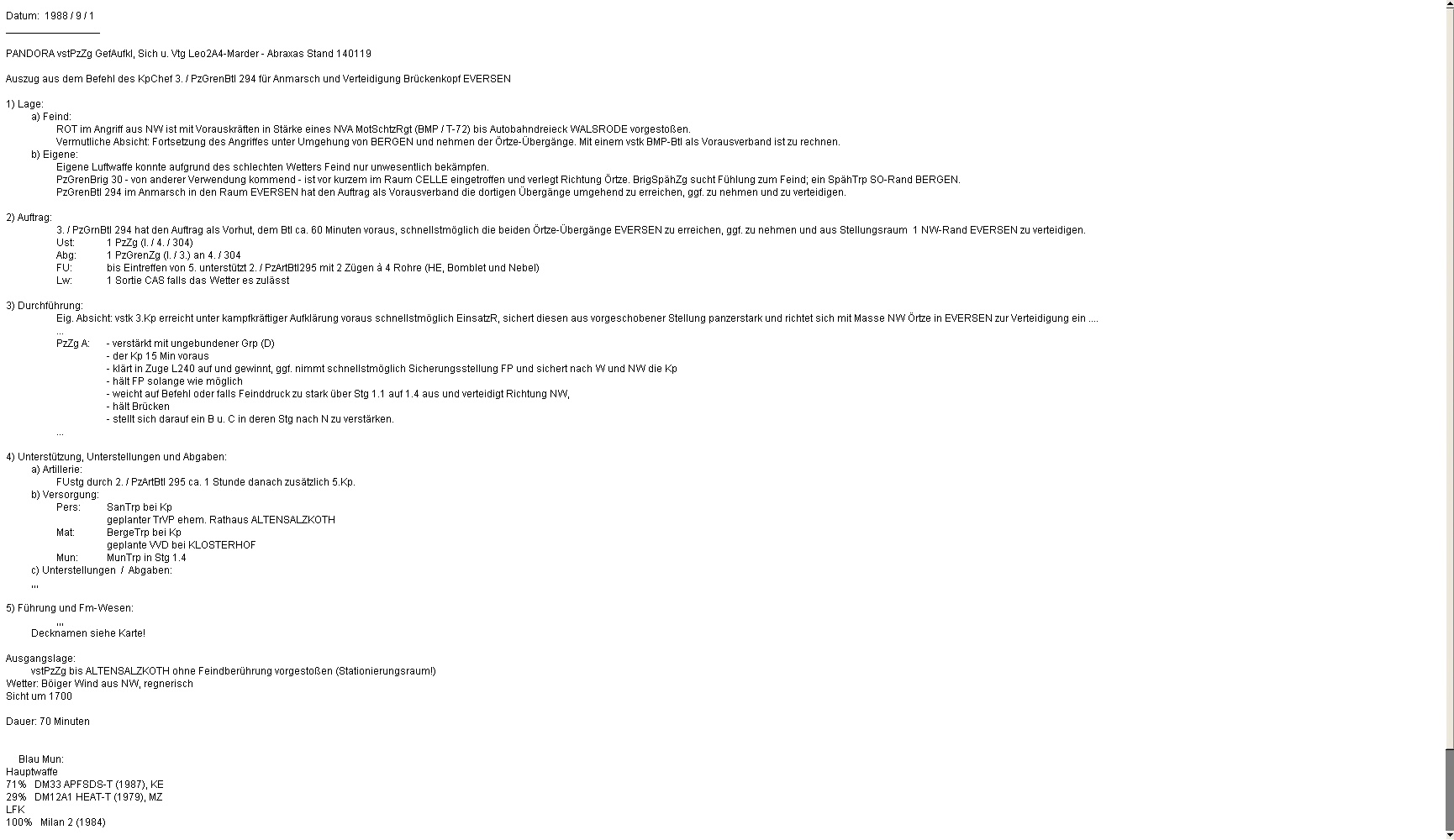 Der verstärkte A-Zg trat wie geplant an und traf am Westrand von EVERSEN auf fdl Aufklärung, die vernichtet werden konnte. Ebenso erging es einem weiteren Aufklärungstrupp bei WALDHOF: