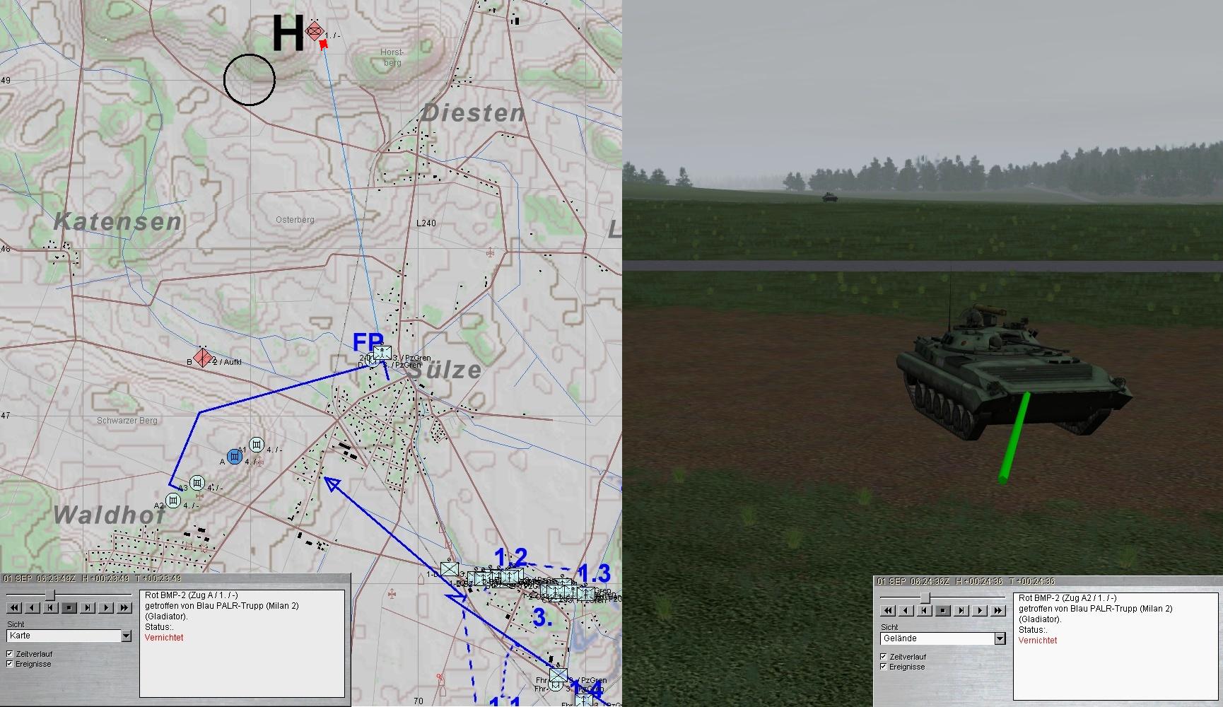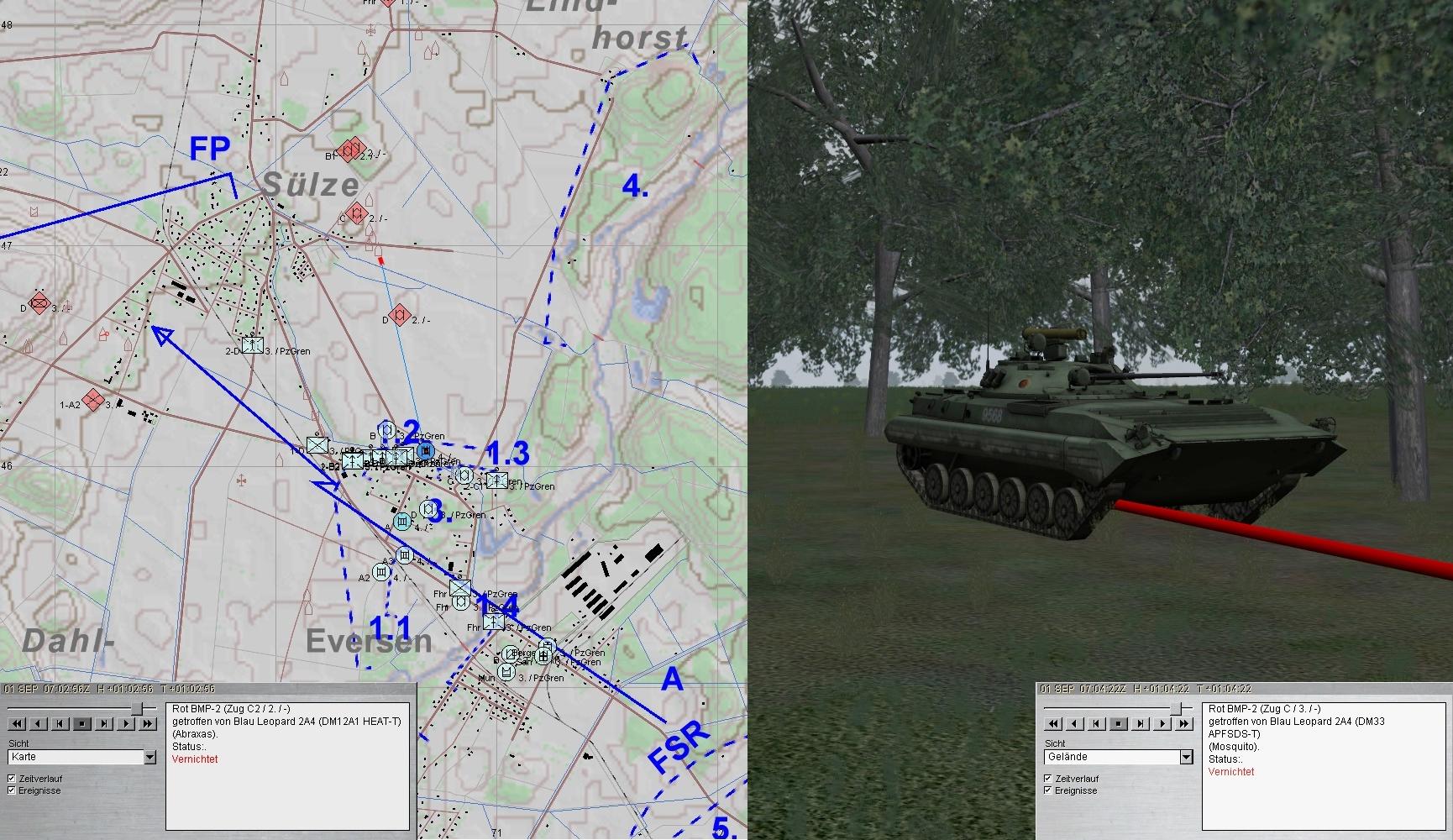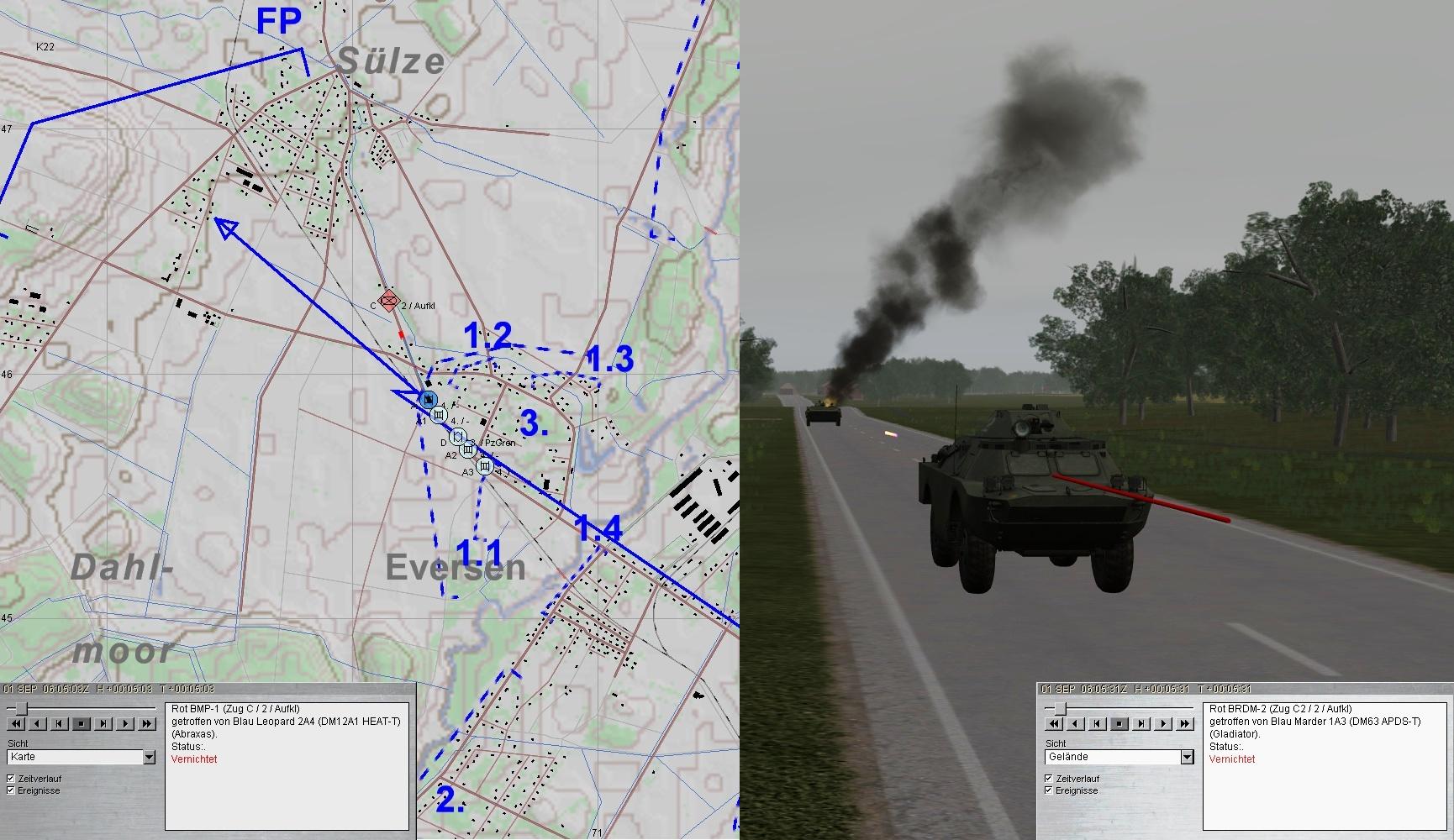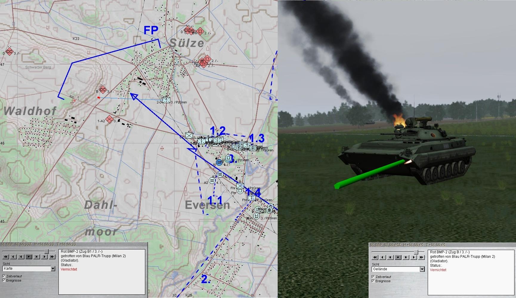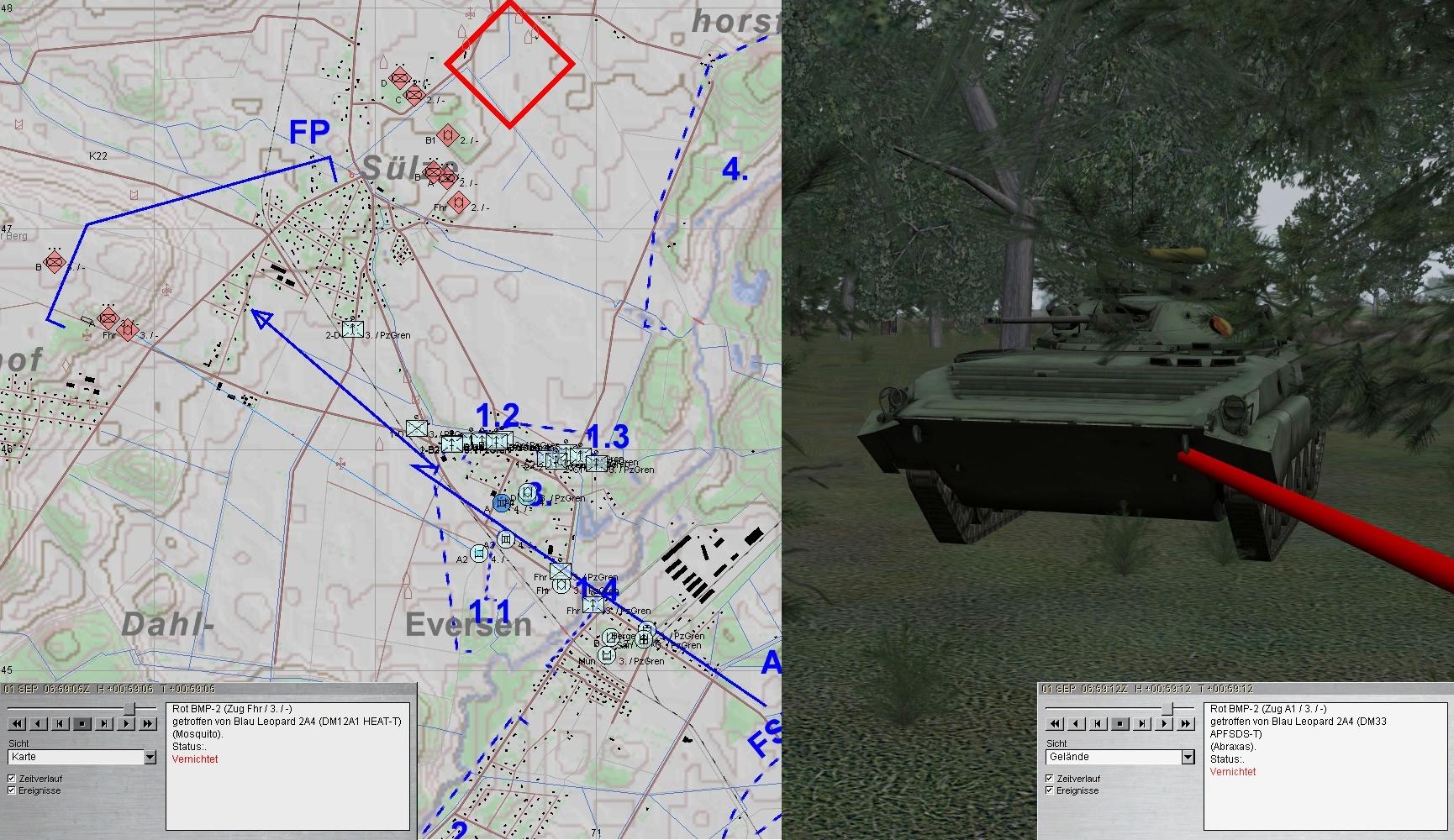 2. Grp musste nachmunitionieren und A1 unterstützte die PzGren am Nordrand von EVERSEN. Der PARS-Trp von D kam groß raus und vernichtete 5 BMP aus W:
