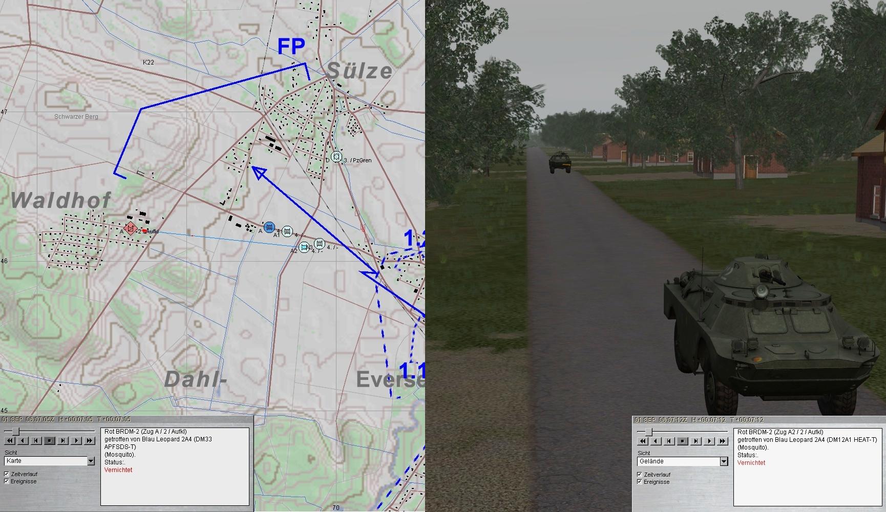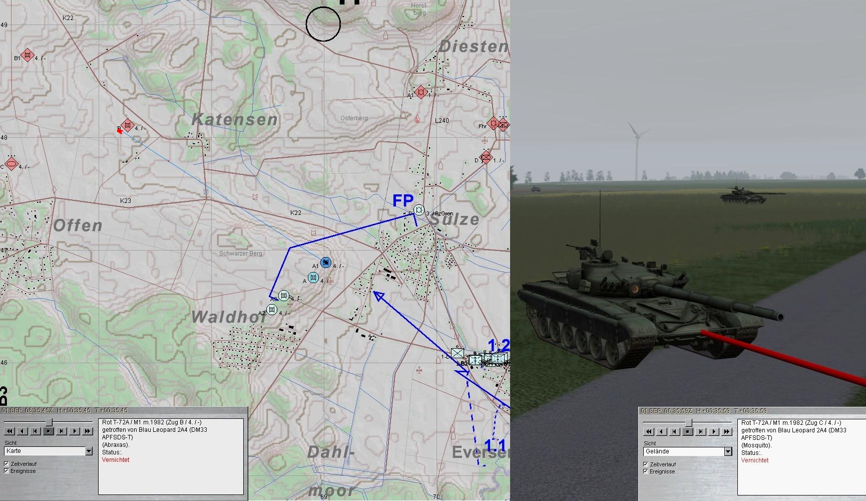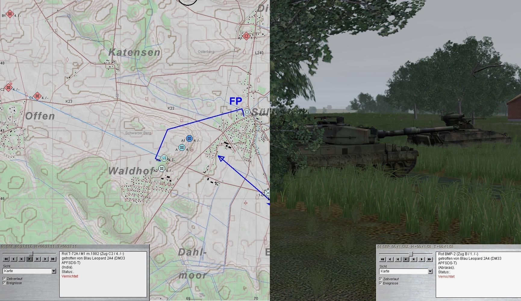 Nun marschierte eine BMP-Kp aus NW an und eine T-72-Kp aus W zudem der noch unbekämpfte fdl SpähTrp: da kam natürlich Hektik auf und alle wurden gefordert!