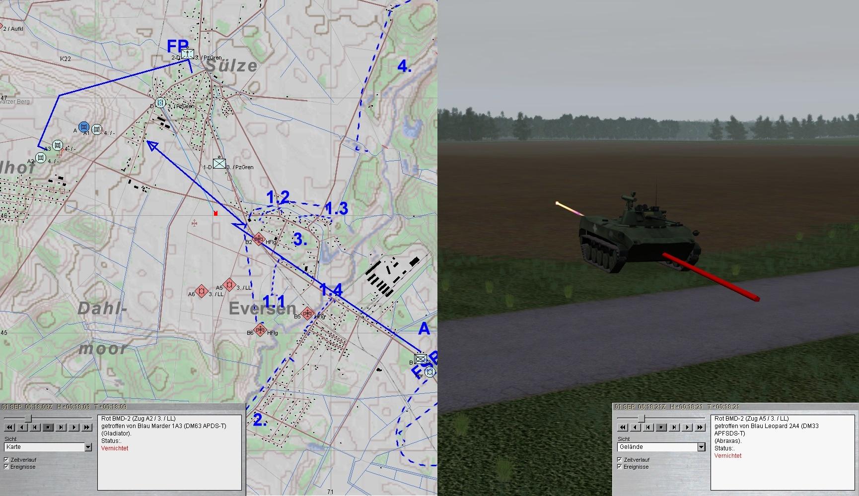 Im Laufe des Gefechtes wurde D bewegungsunfähig und musste von A1 geborgen und abgeschoben werden. A-Zg wich auf EVERSEN aus und führte von dort den Feuerkampf: