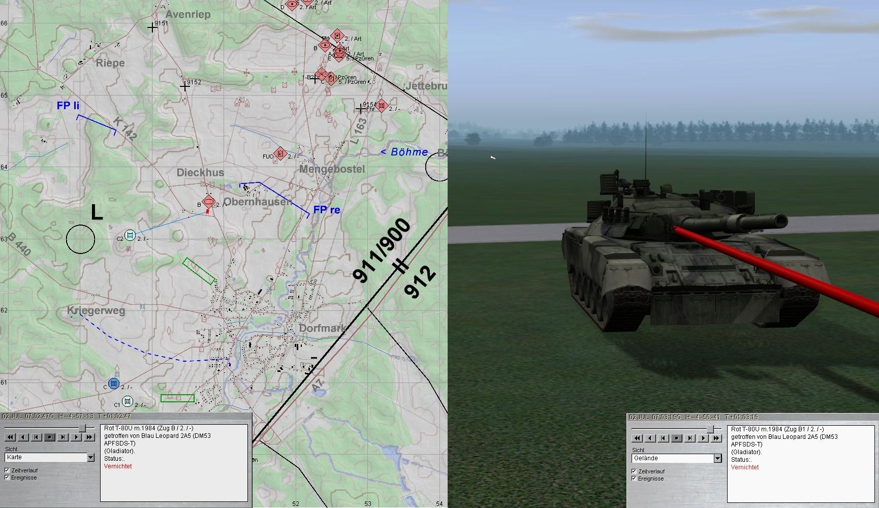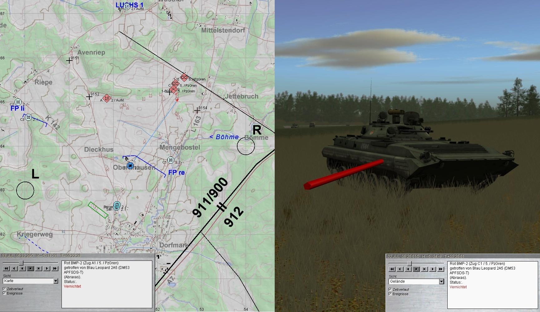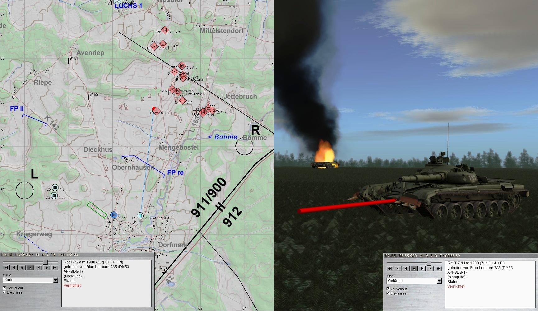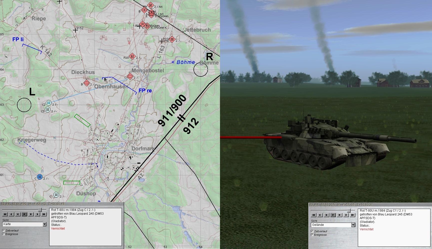 Wenig später meldete SpähTrp LUCHS 4 feindliche PzKp. C-Fhr befahl sofort der 2. Grp Stellungswechsel nach 2.1 zur Unterstützung der 1. Grp, die an den Nordrand von DORFMARK kämpfend auswich. Erste T-80und MiRPz blieben im Feuer von C und C1 sowie der Artillerie liegen.