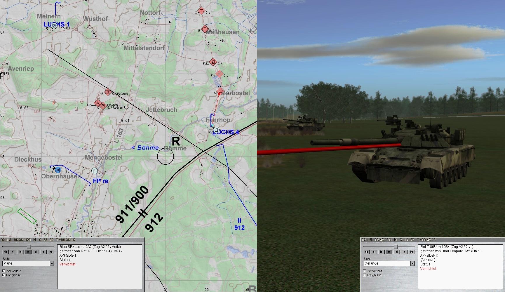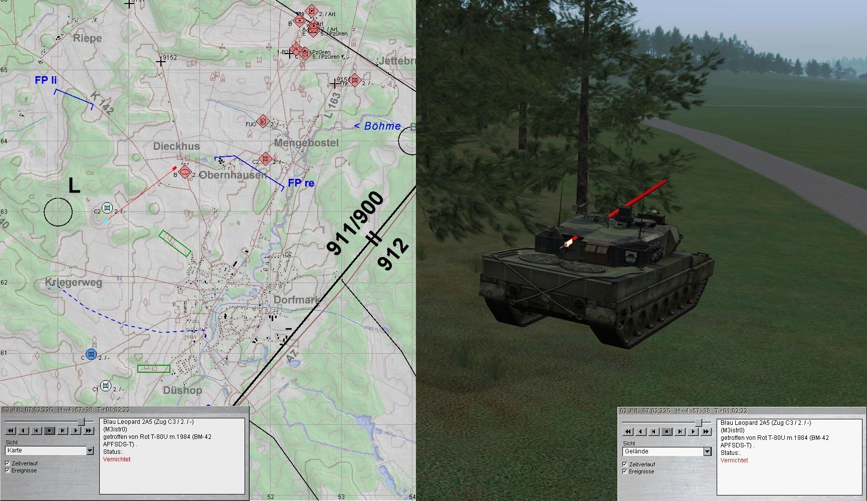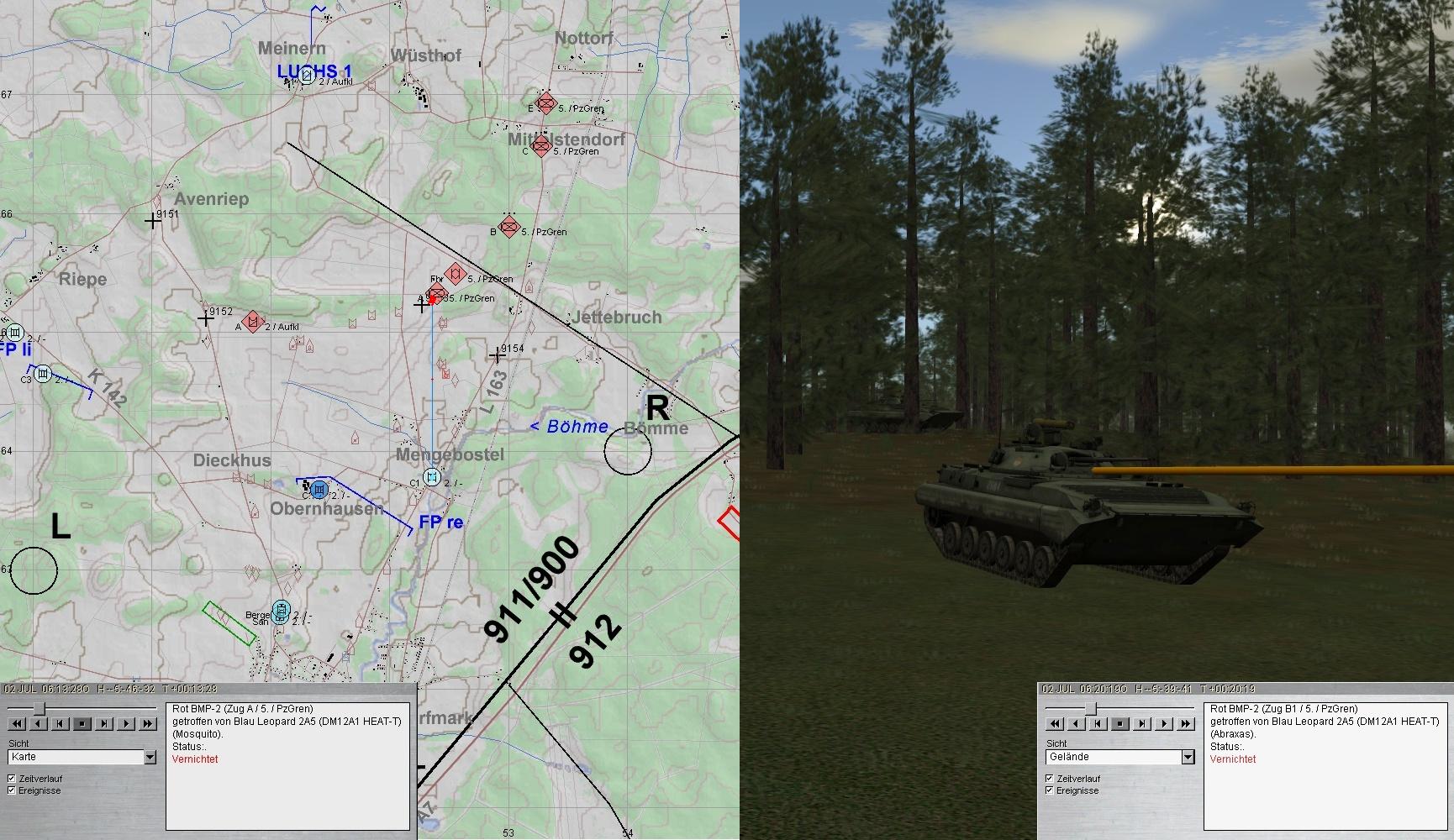 Wenig später meldete SpähTrp LUCHS 4 feindliche PzKp. C-Fhr befahl sofort der 2. Grp Stellungswechsel nach 2.1 zur Unterstützung der 1. Grp, die an den Nordrand von DORFMARK kämpfend auswich. Erste T-80und MiRPz blieben im Feuer von C und C1 sowie der Artillerie liegen.