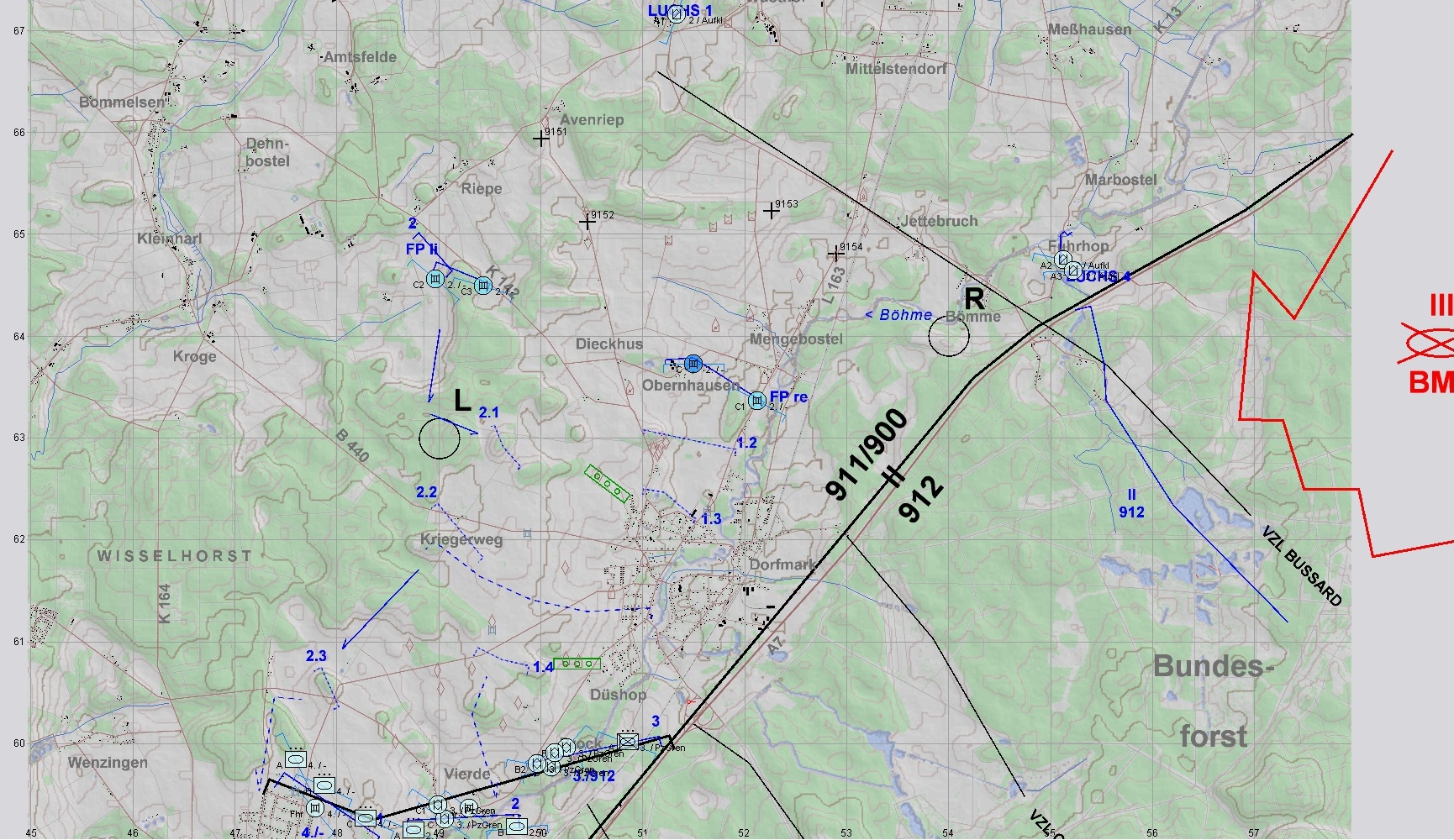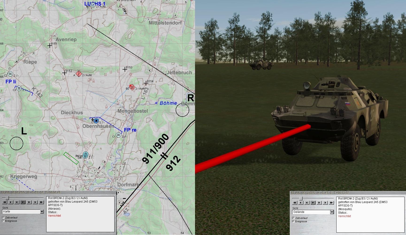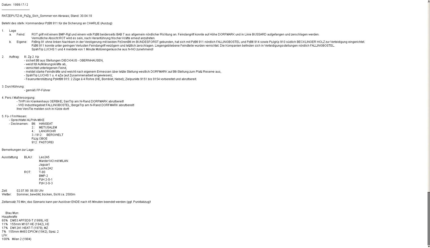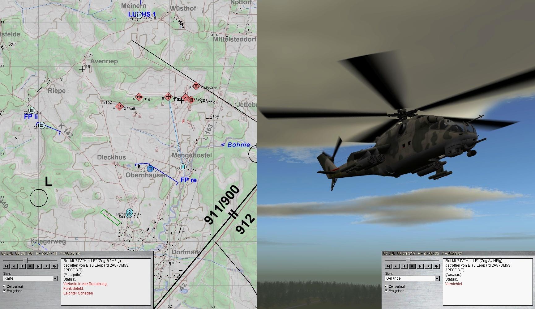 Wenig später meldete SpähTrp LUCHS 4 feindliche PzKp. C-Fhr befahl sofort der 2. Grp Stellungswechsel nach 2.1 zur Unterstützung der 1. Grp, die an den Nordrand von DORFMARK kämpfend auswich. Erste T-80und MiRPz blieben im Feuer von C und C1 sowie der Artillerie liegen.