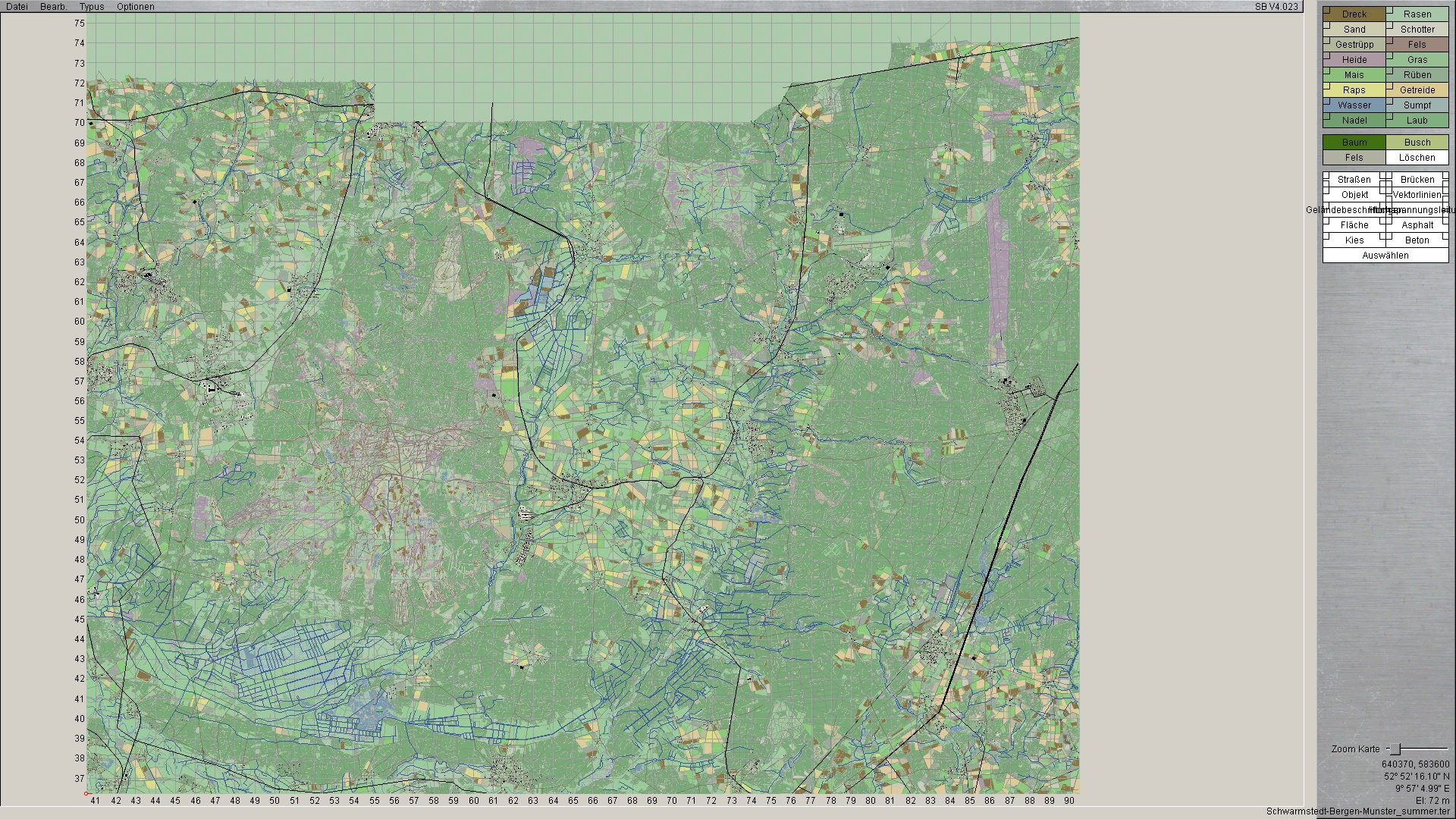 Qualitativ hochwertige Karten sind wichtig für eine sauber laufende Simul­a­tion hoher Simulationsgüte, die bei den Anwendern auf Akzeptanz stößt. Nutzen Sie, wenn möglich, im­mer Karten von guter, erprobter Qualität. In einigen Fällen können Änderungen an bestehenden Karten nötig sein, um ein Szenario zu verbessern oder das Erreichen eines Ausbildungsziels zu ermöglichen. Steel Beasts ermöglicht die Bearbeitung von Karten im Gelände-Editor.
