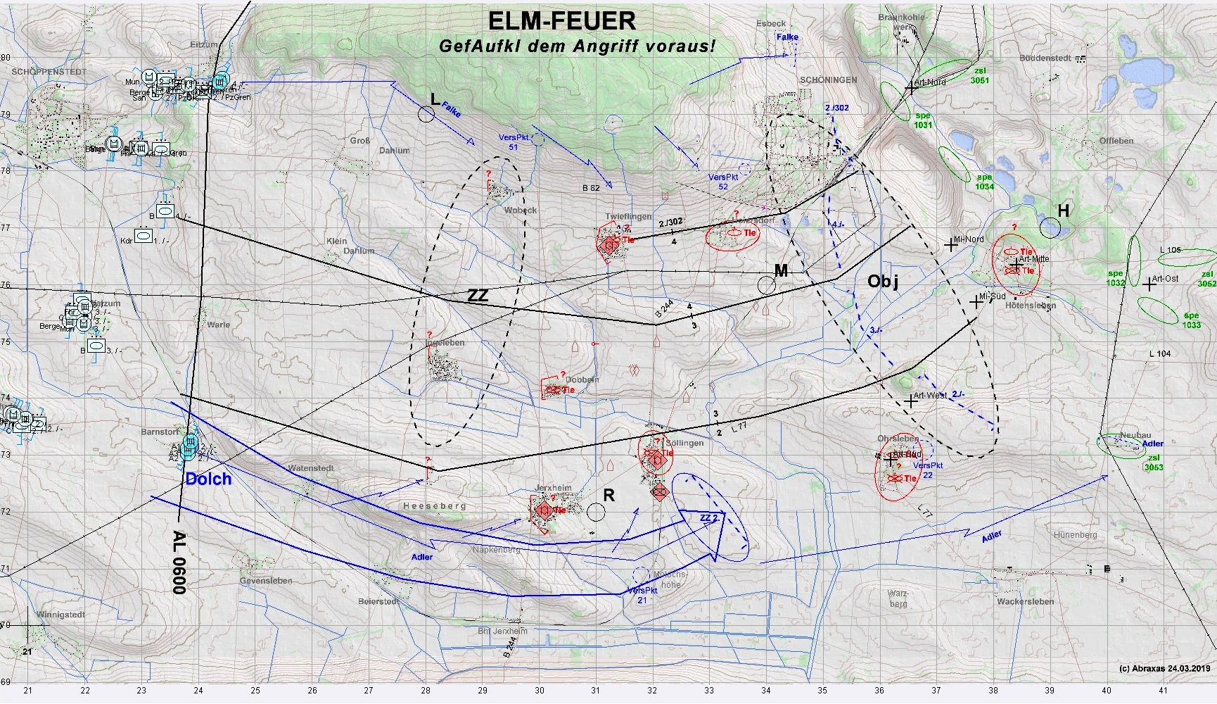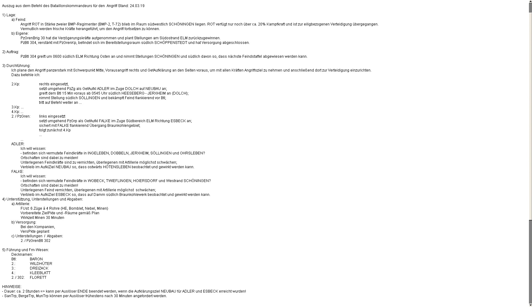 2. PzZg und PzGrp (A-Zug der 2,/304 und C-Grp der 4./304) in den Flanken des Angriffes dem Btl voraus!