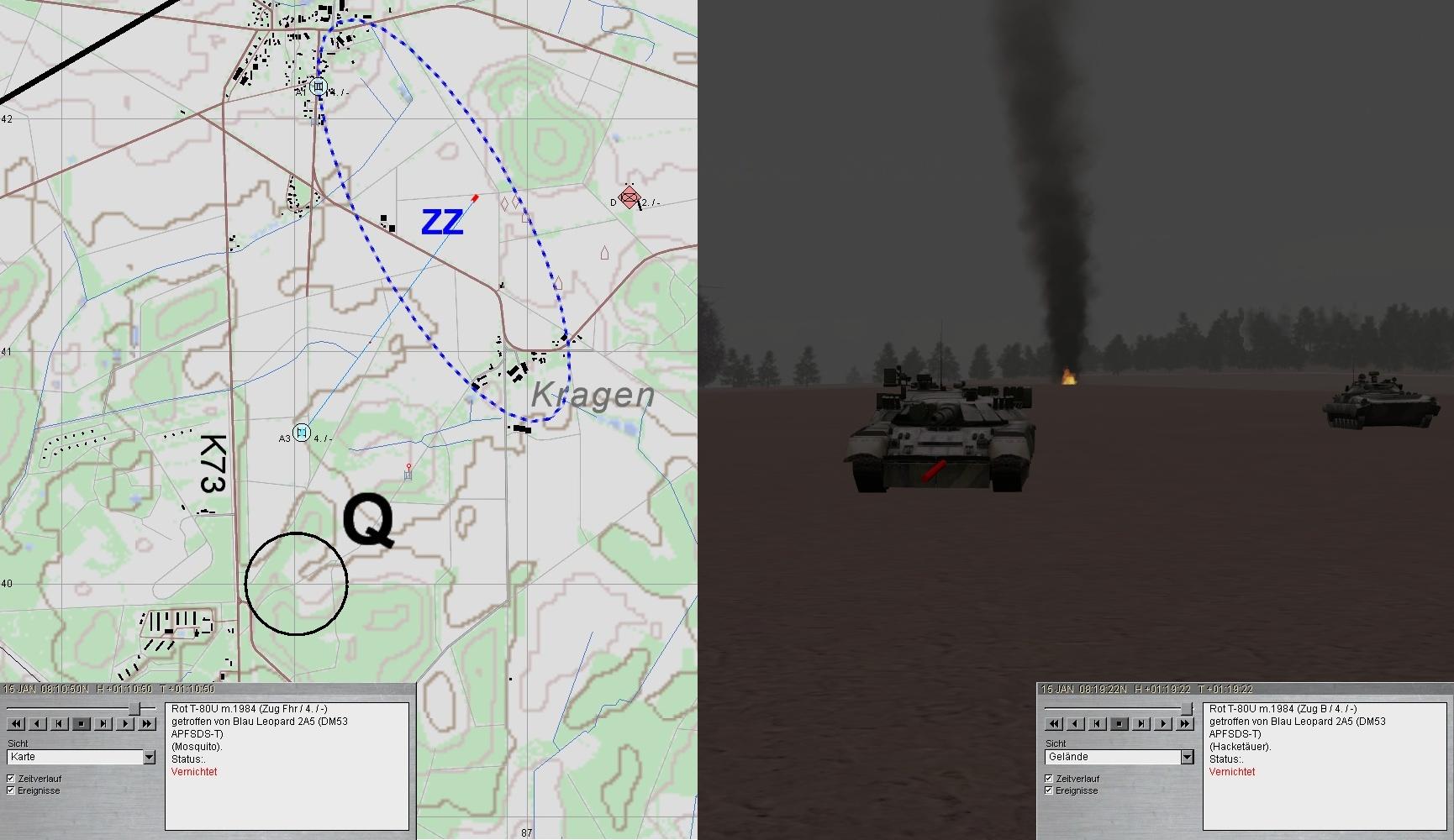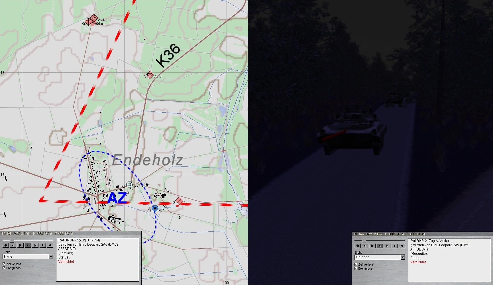 A trat wie geplant an und stieß mit 2. Grp im AZ auf feindliche Aufklärung in "Barett-Entfernung". Beide Aufklärungstrupps wurden von A2 und A3 vernichtet. Nun klärte auch 1. Grp Feindaufklärung auf und vernichtete diese ebenfalls.