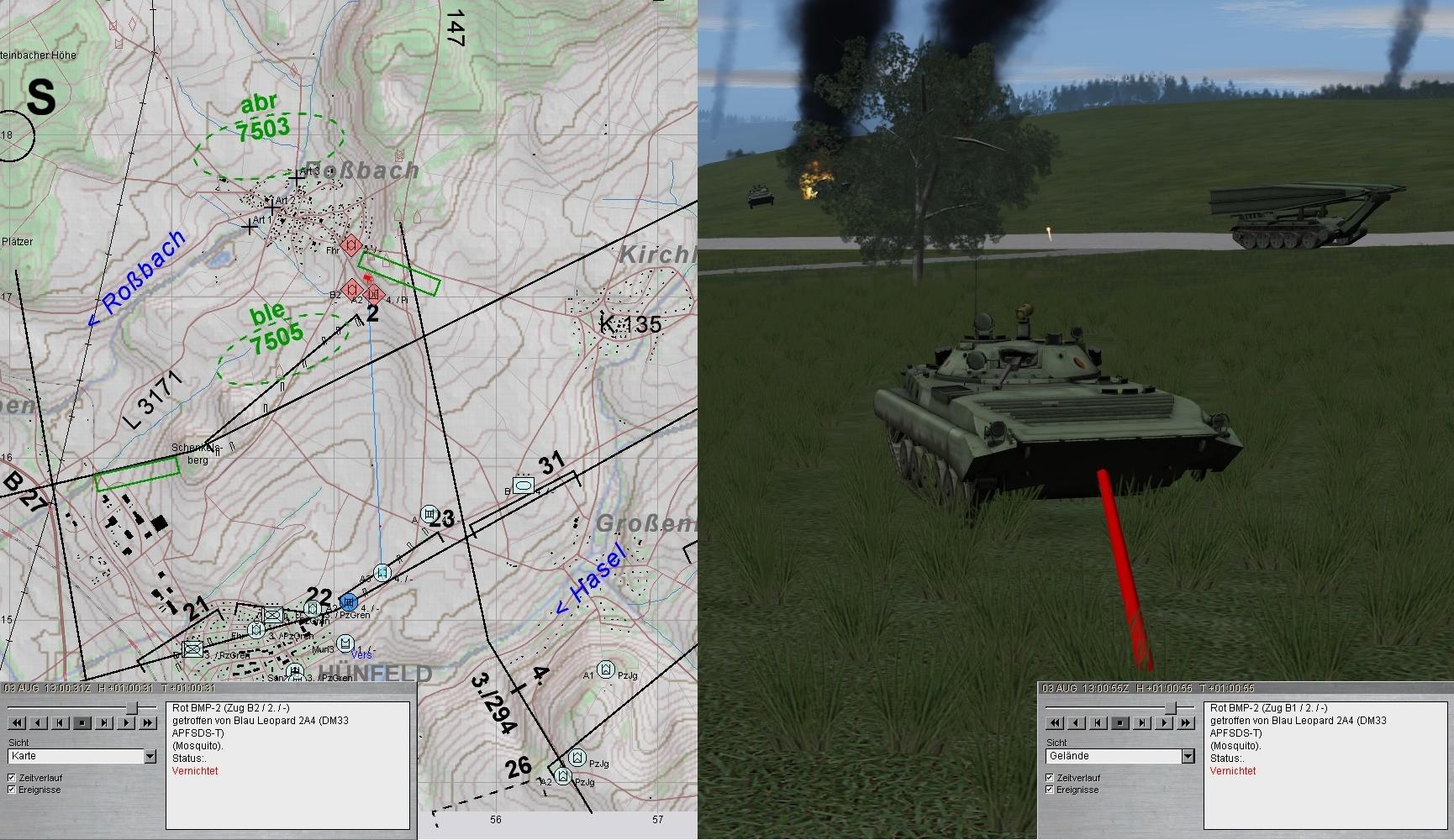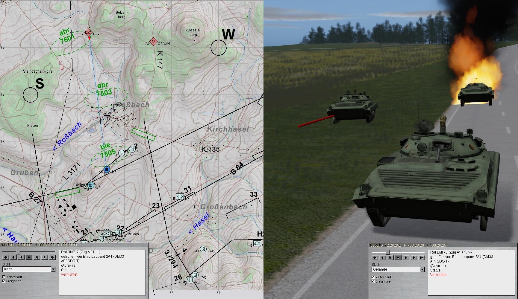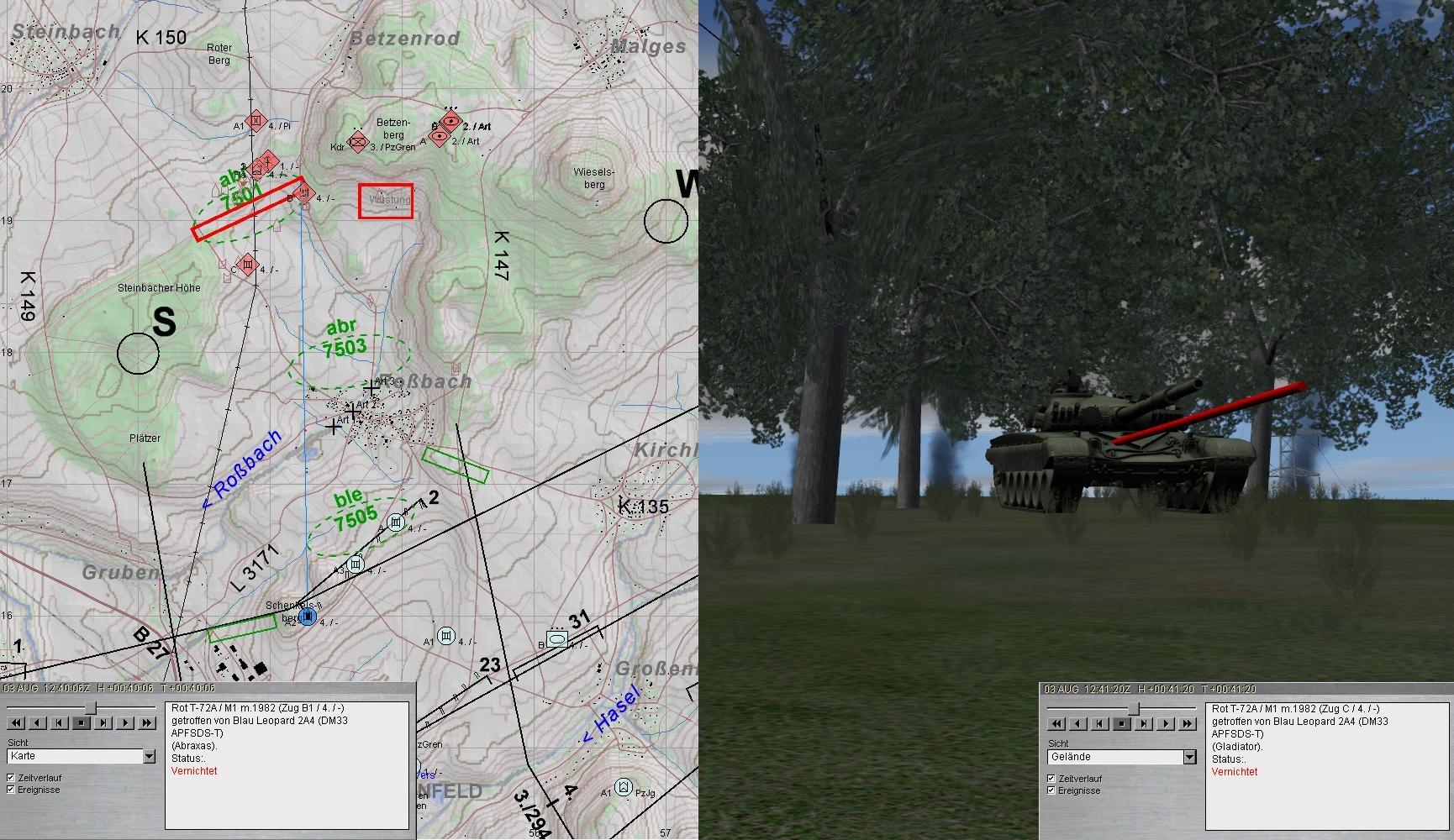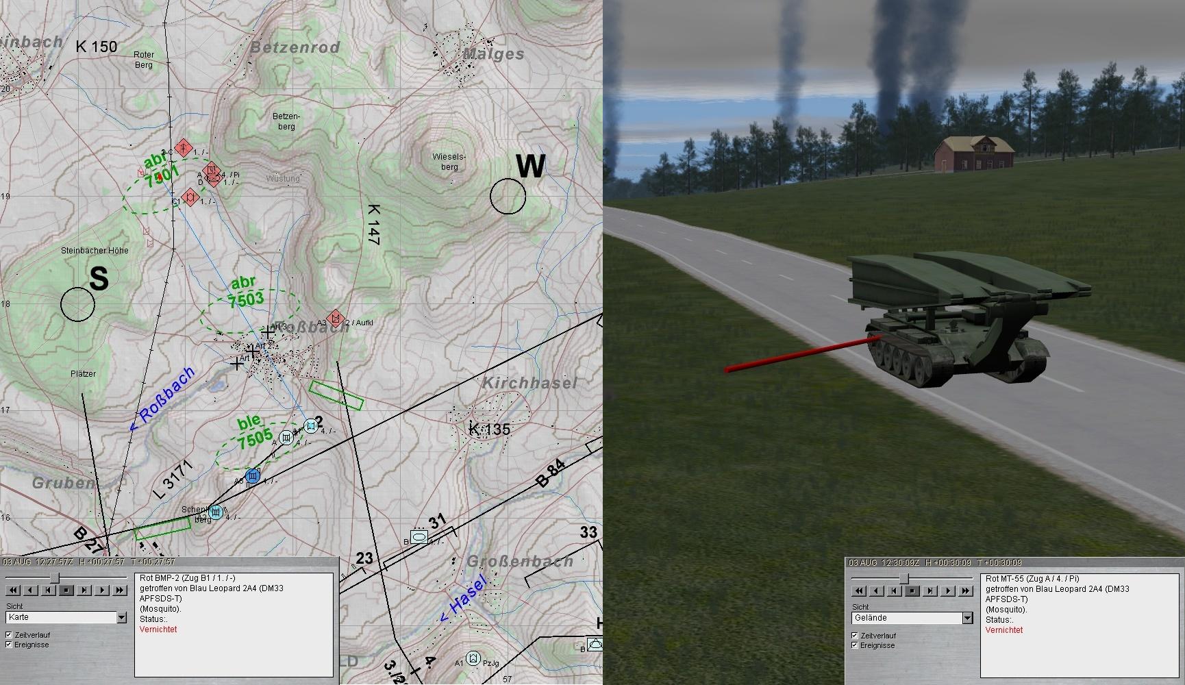 Eigene Aufklärungskräfte meldeten fdl Pz und SPz aus Norden antretend und wichen aus. Fdl Aufklärung wurde von A aufgeklärt und vernichtet. Ebenso erging es fdl GefAufklärung: