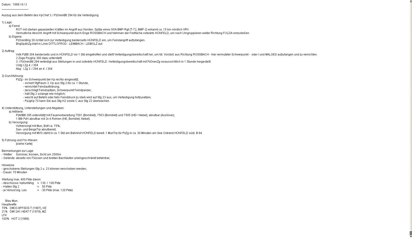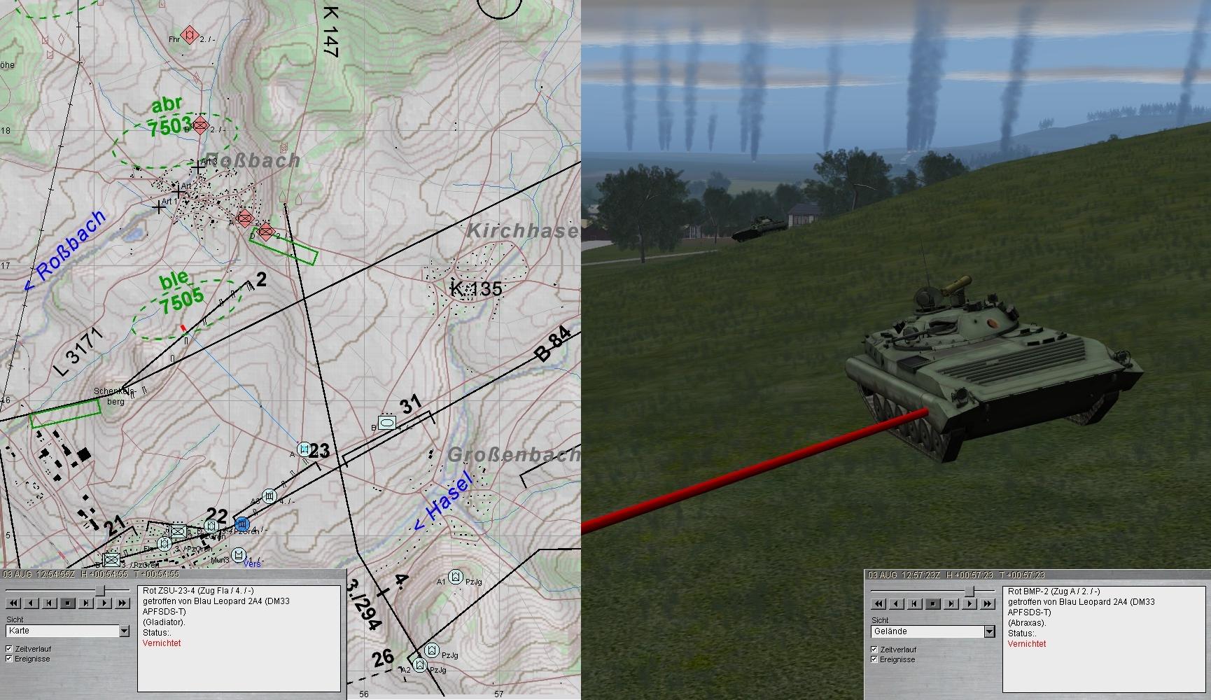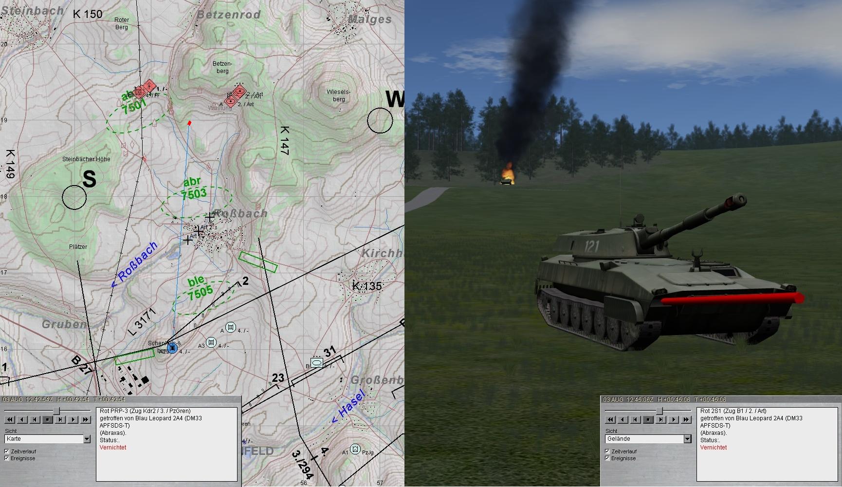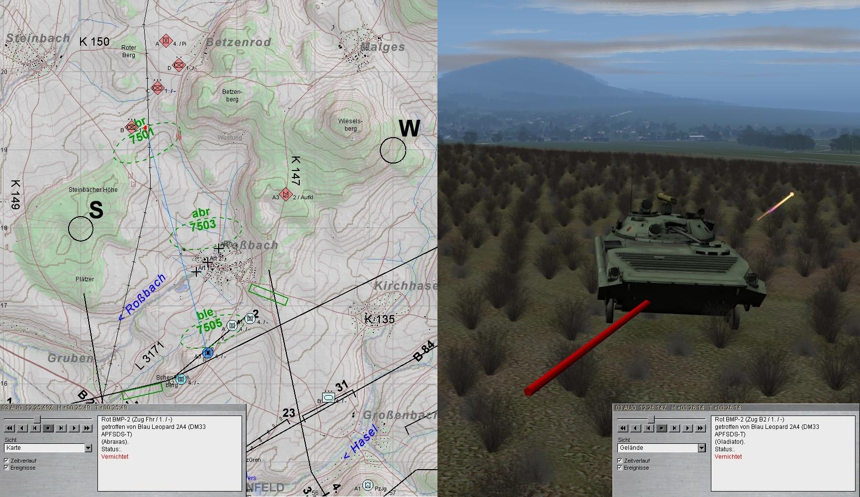 Eigene Aufklärungskräfte meldeten fdl Pz und SPz aus Norden antretend und wichen aus. Fdl Aufklärung wurde von A aufgeklärt und vernichtet. Ebenso erging es fdl GefAufklärung: