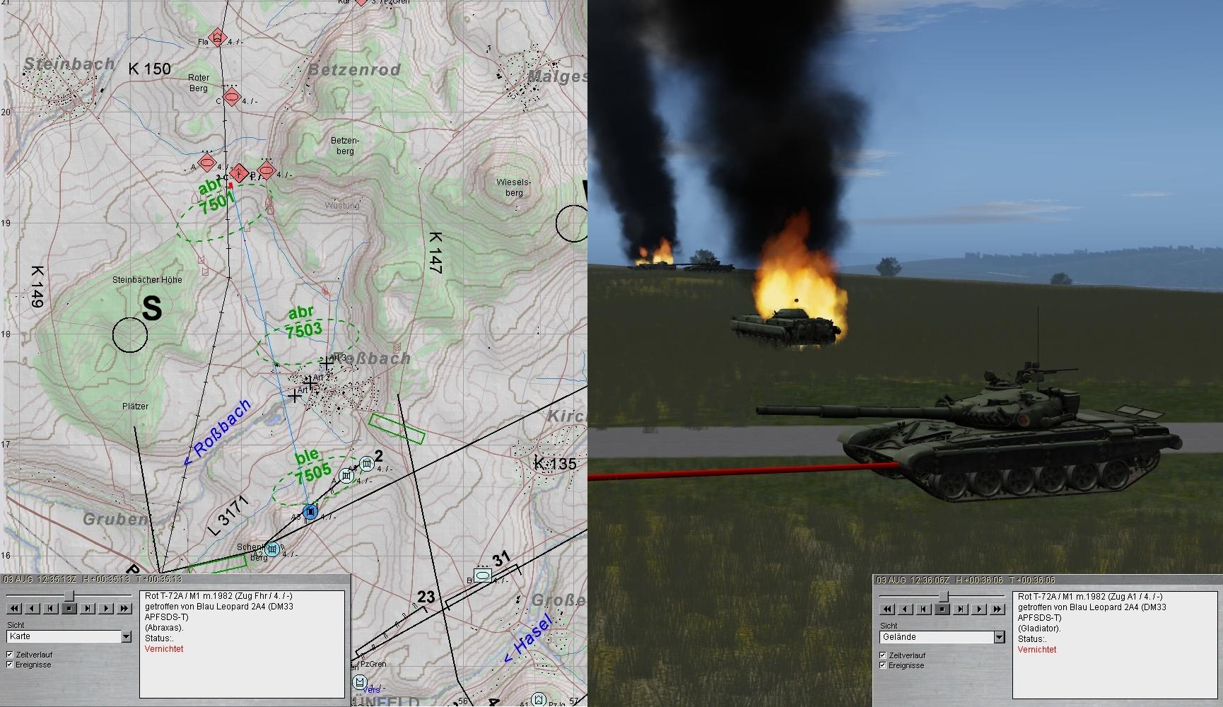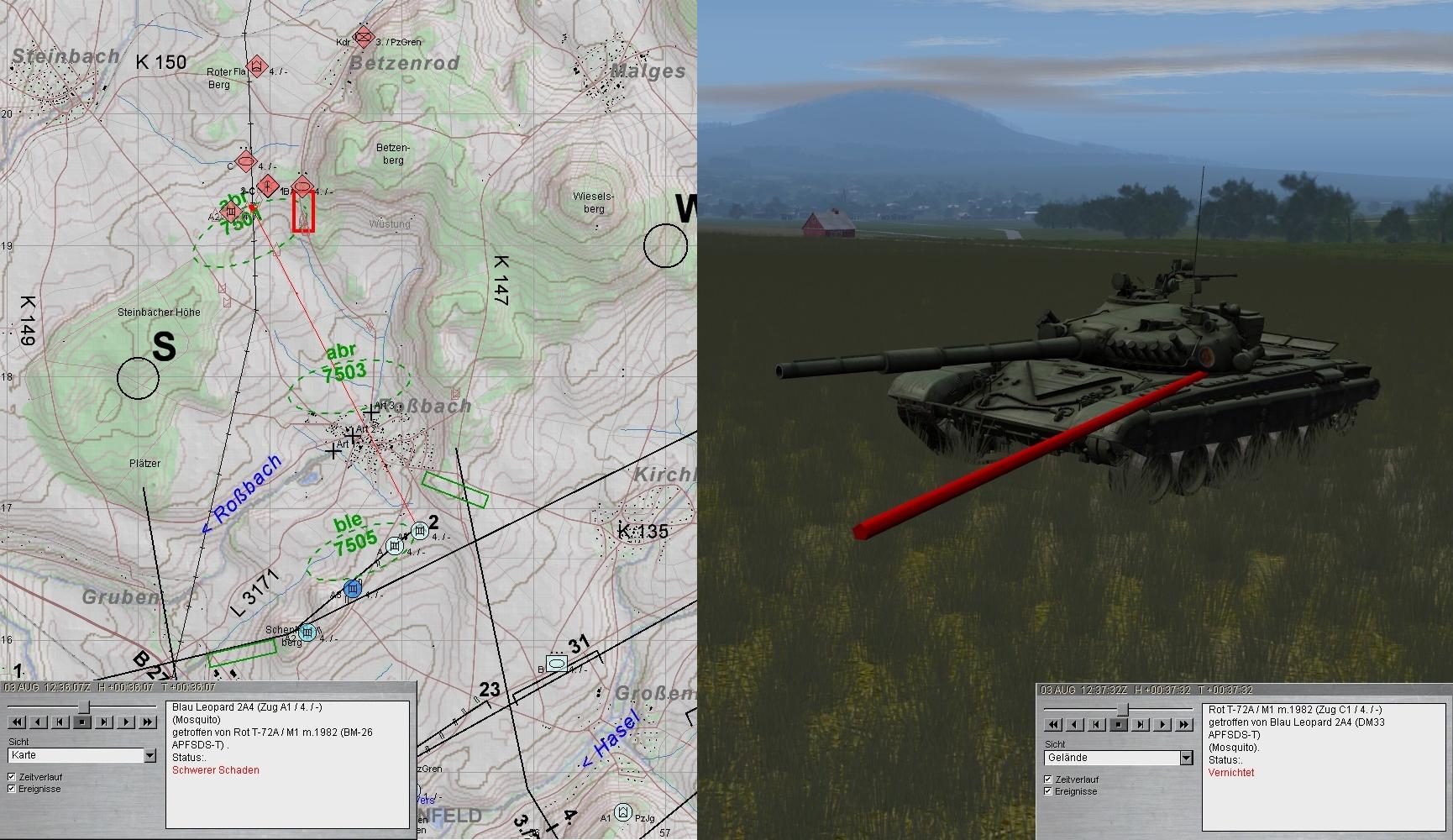 A1 erhielt einen Turmtreffer, konnte aber noch im Notbetrieb einen T-72 nernichten. Dann wurde der A1-Pz Richtung RVD geschickt und Mosquito erhielt den A3. Das Gefecht ging weiter: