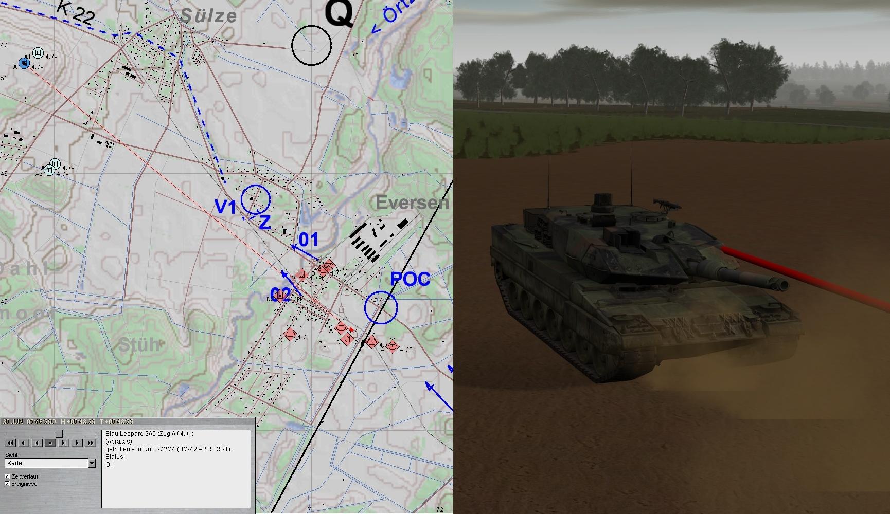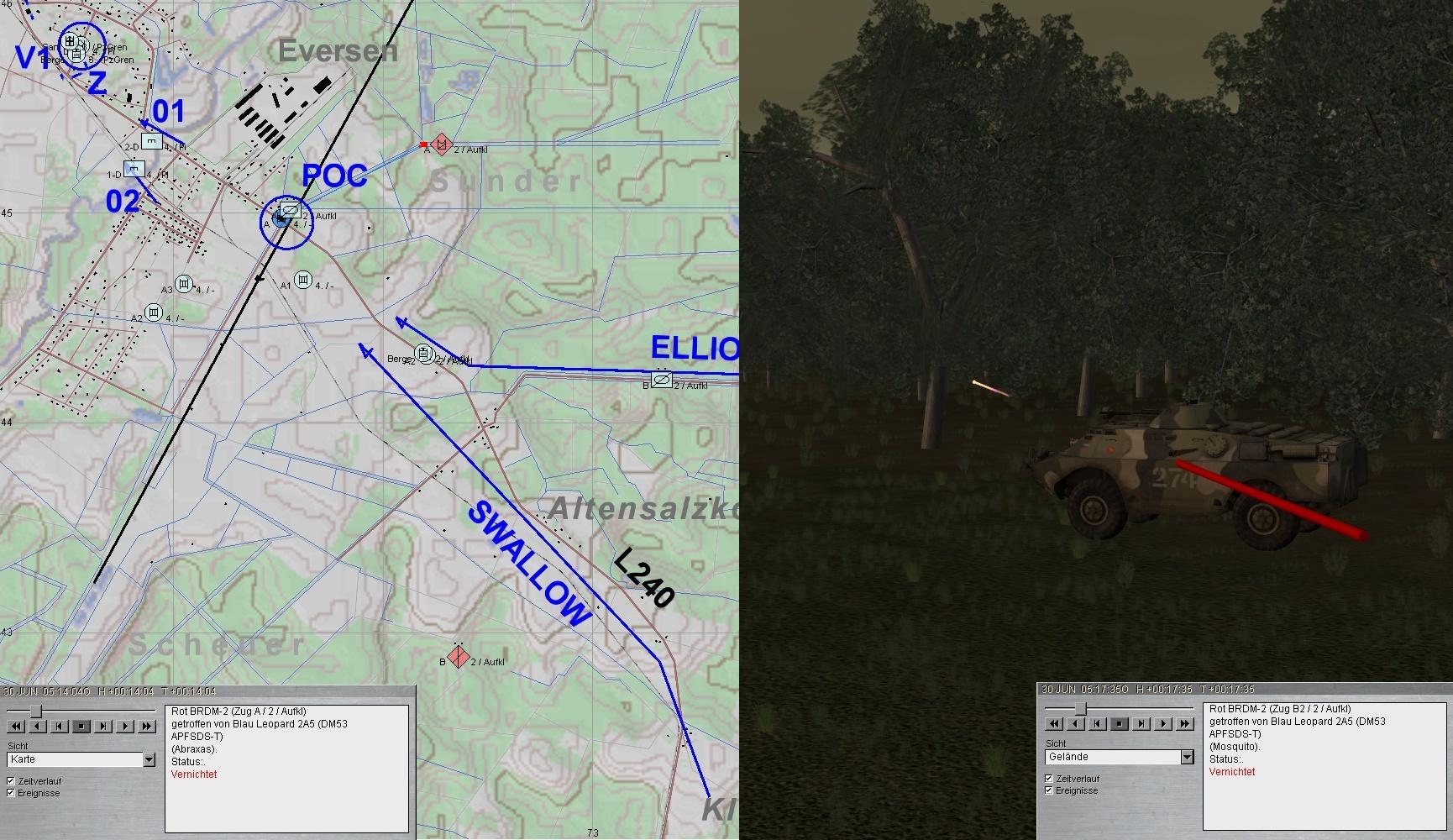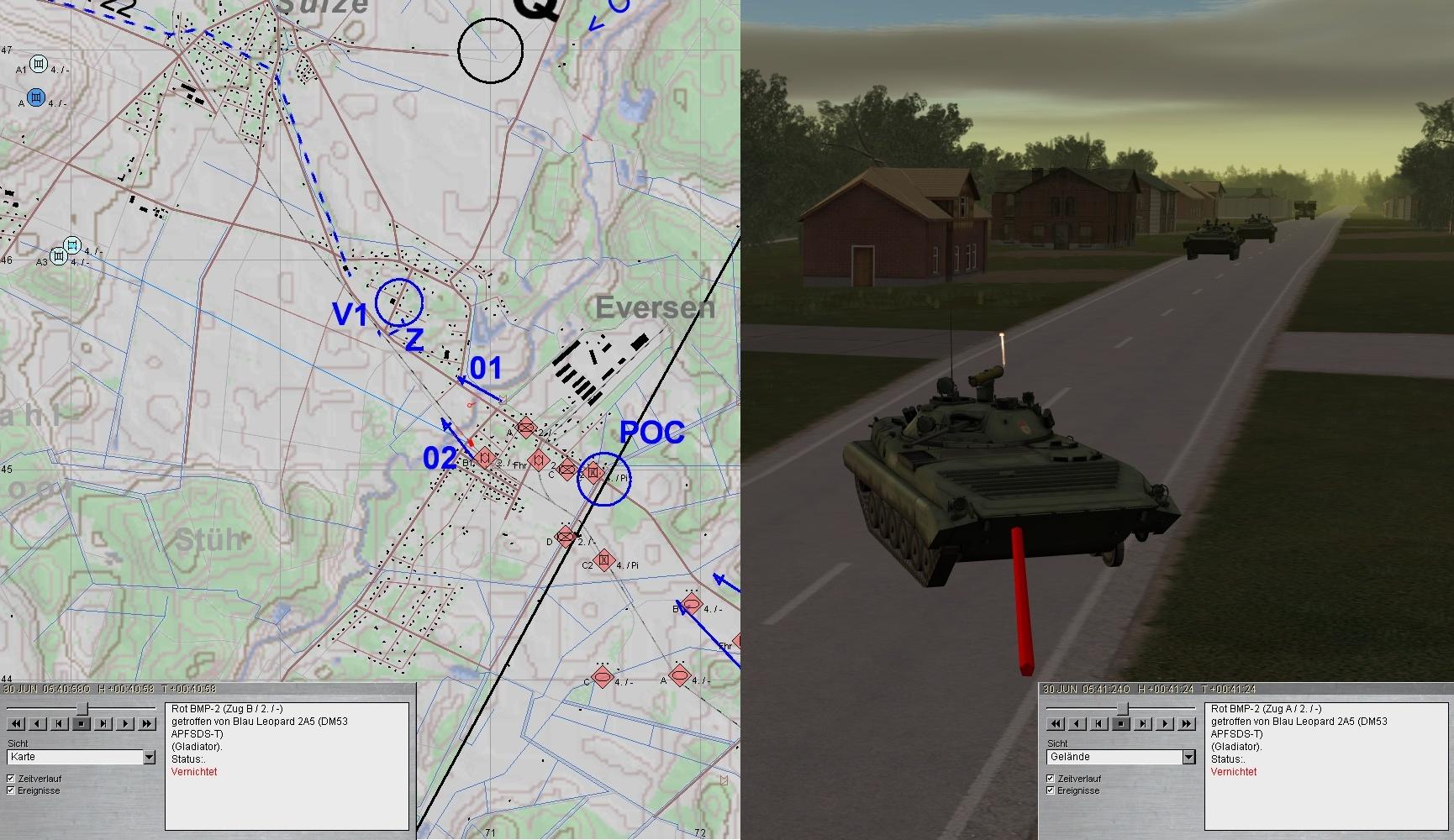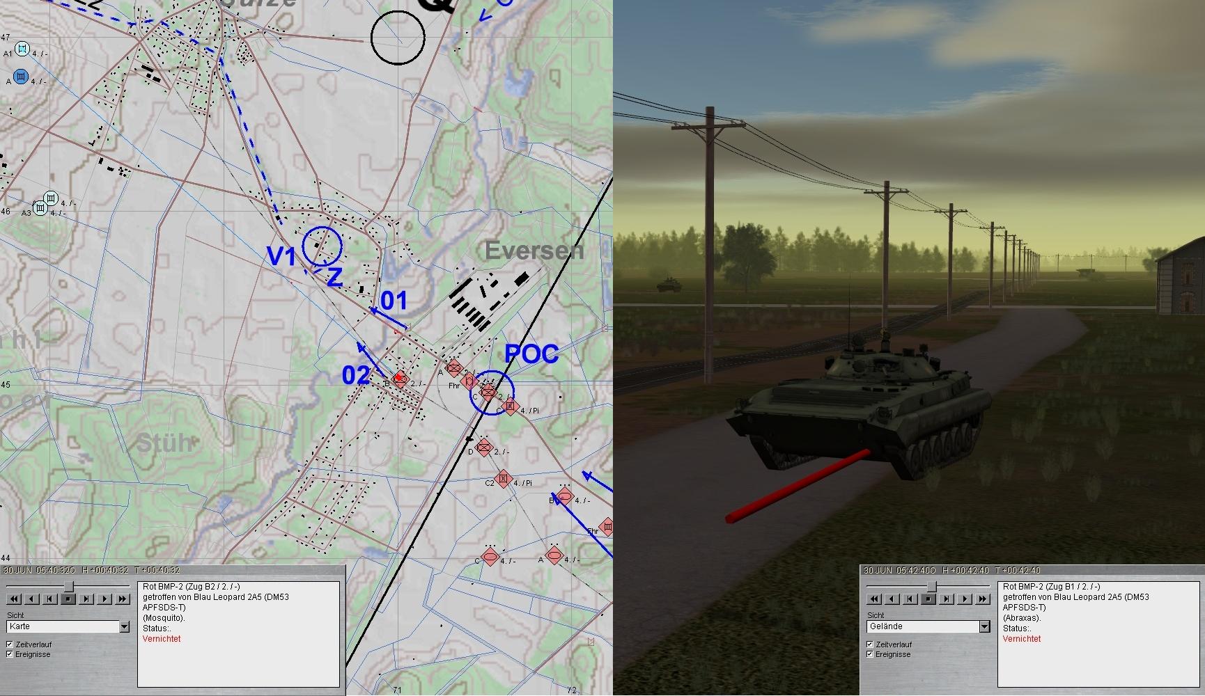 Leider konnte nördlich EVERSEN ein BRDM-2 bis zur Brücke 01 vordringen und erst unter Verlusten des dortigen PiTrp vernichtet werden. Das sollte sich rächen!