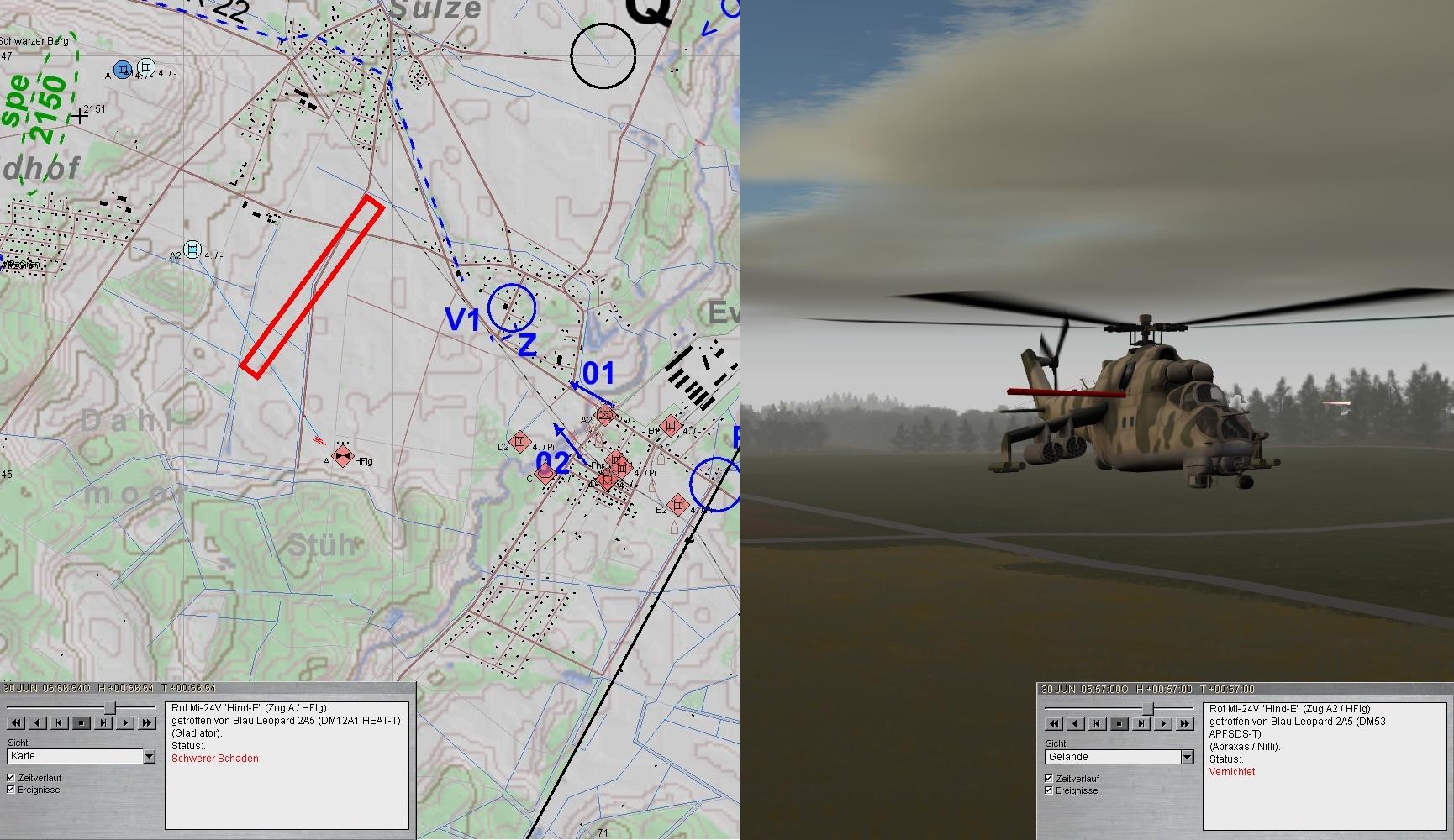 Dann flog ein Schwarm HIND an und Nilli konnte sich beweisen. Alle HIND wurden abgeschossen und letzte Feindpanzer vernichtet. So blieb ROT an der ÖRTZE liegen.
