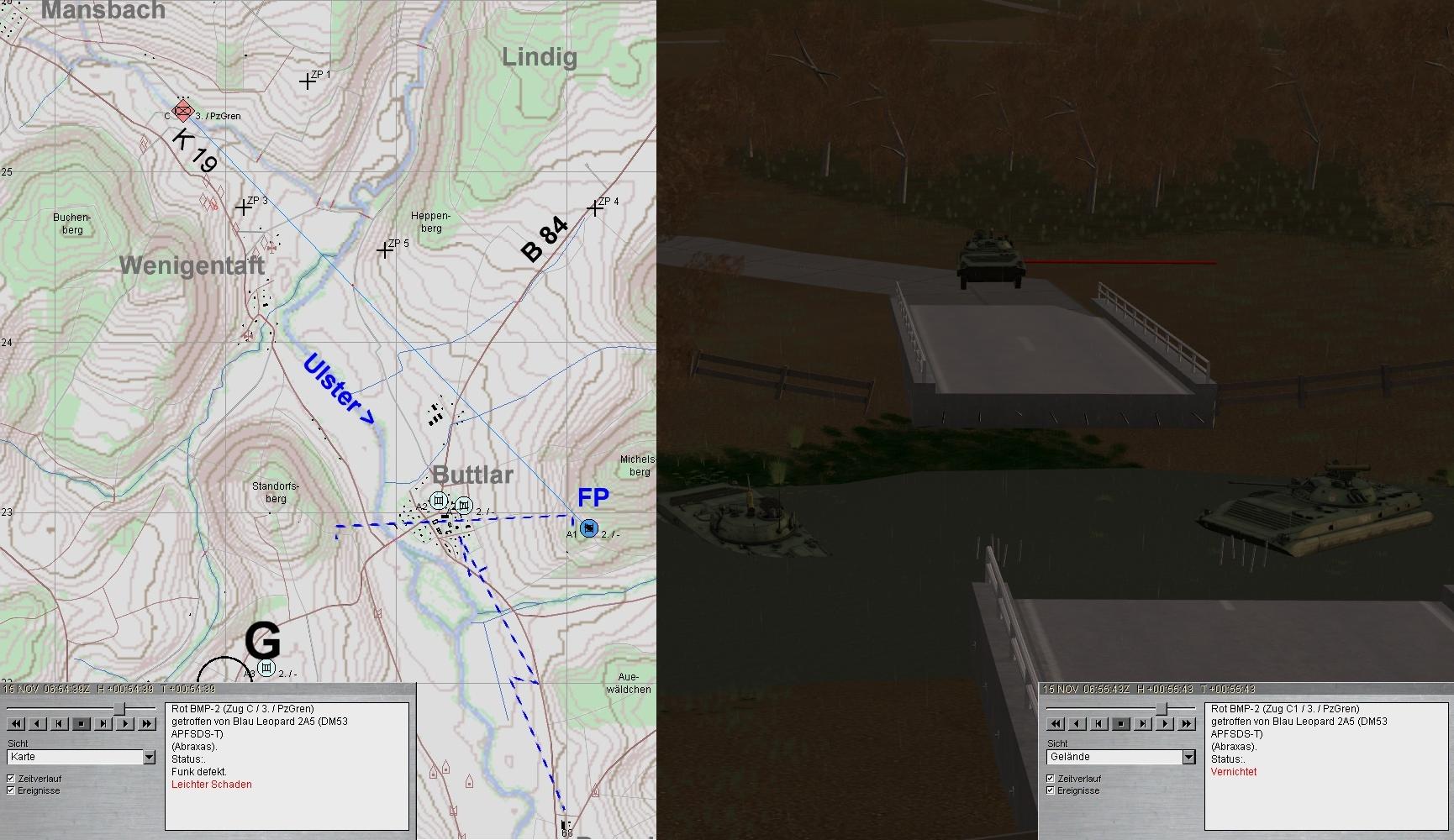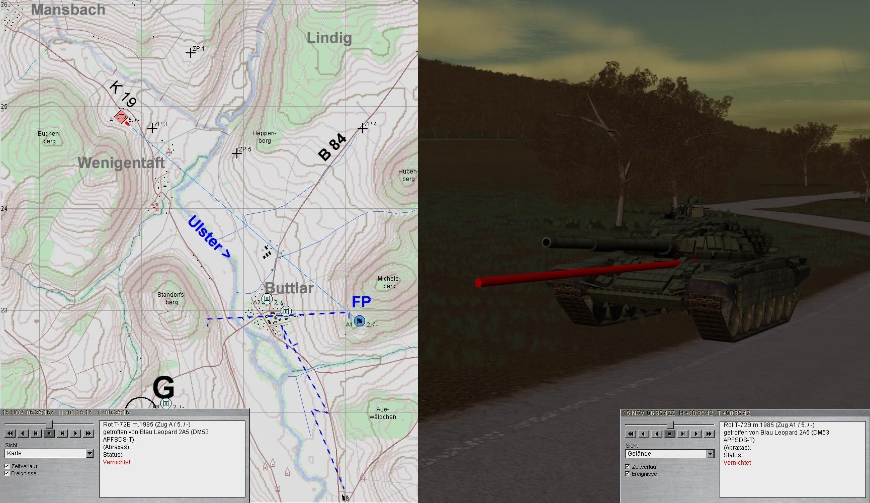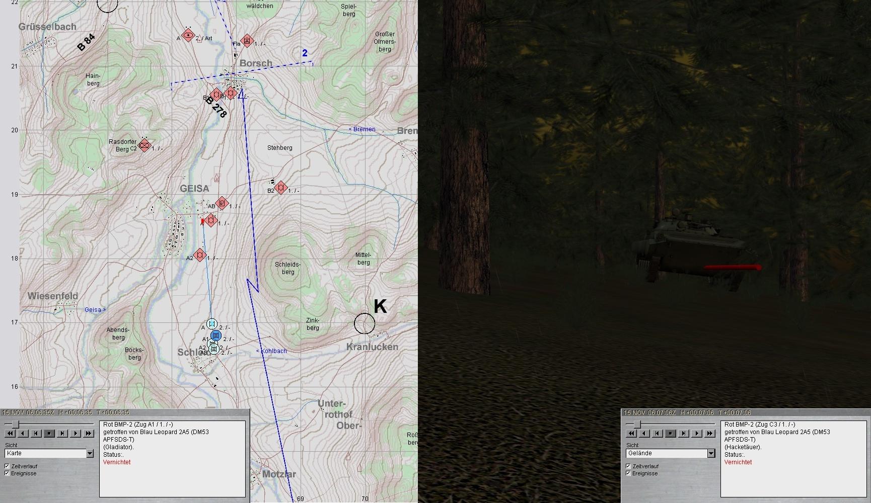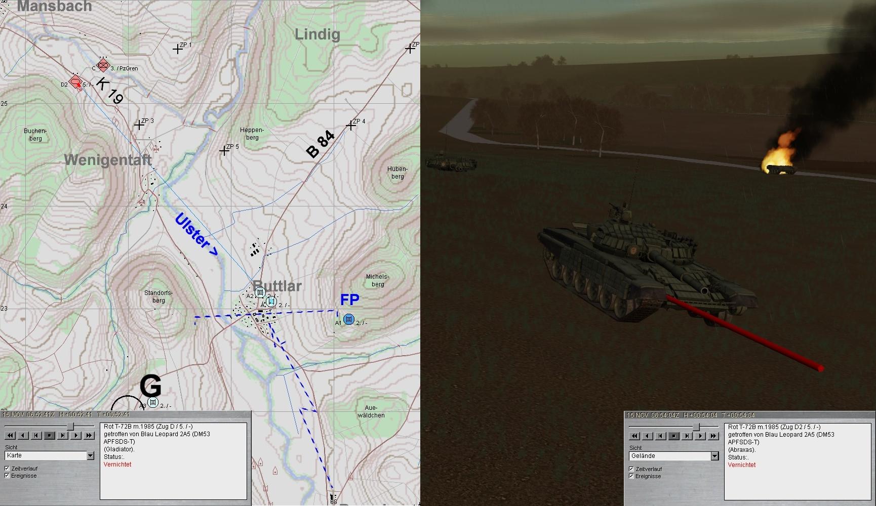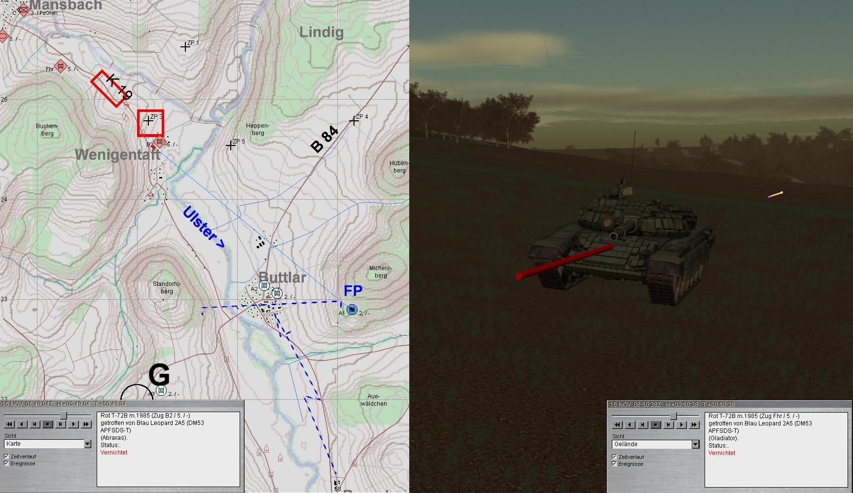 Nach kurzer Ruhephase klärte A1 Feindpanzer in Zg-Stärke aus MANSBACH kommend auf: GefAufklärung einer Kp? Das Feuer wurde auf 3000 eröffnet: