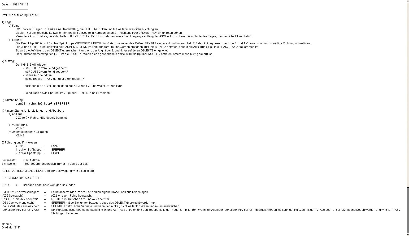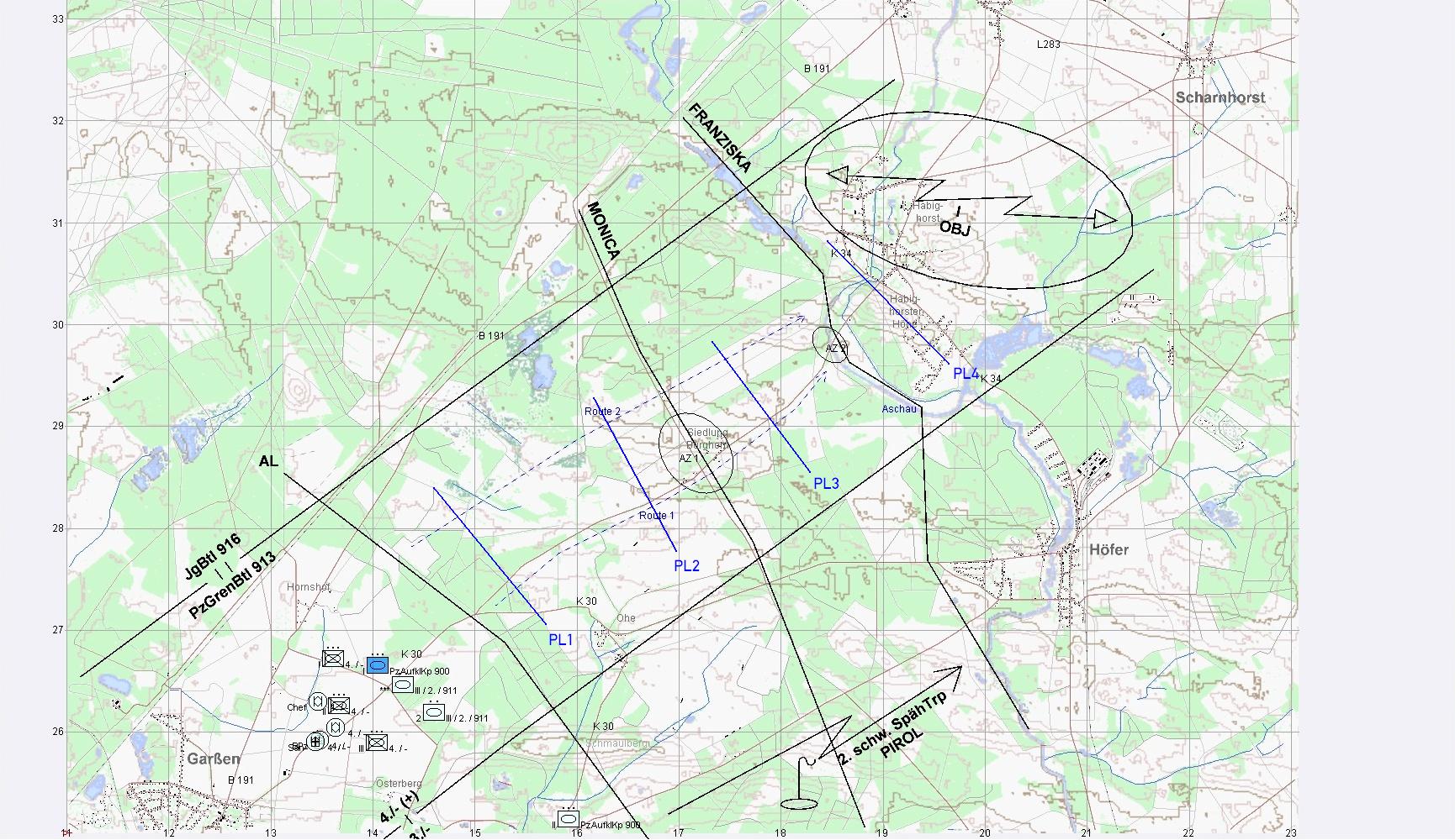 SPERBER trat mit A2 auf Route 2 und A mit A1 auf Hauptroute 1 bis PL1 an. A1 erkannte zunächst fdl SpähTrp und anschließend URAL-Zg. Der Feuerkampf musste sofort eröffnet werden.
