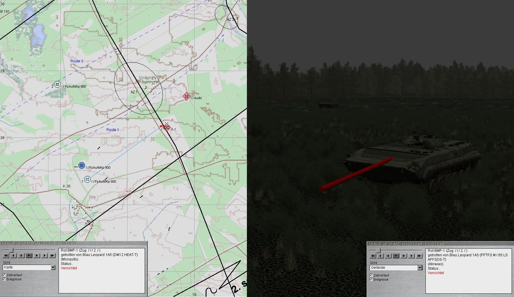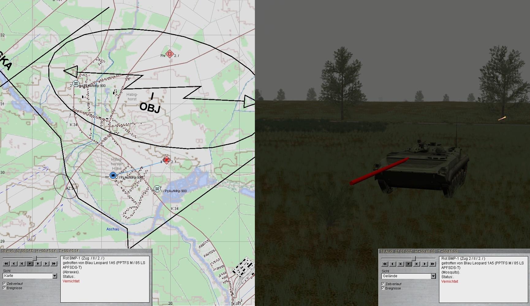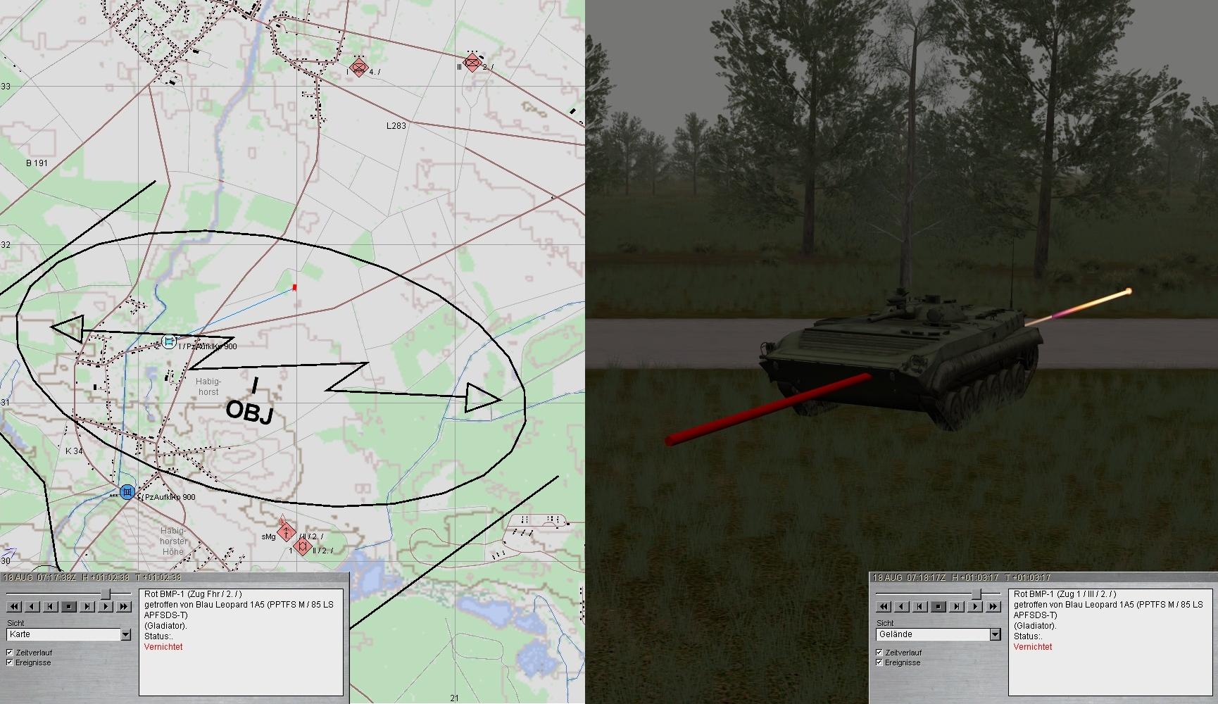 Beide Seiten eröffneten den Feuerkampf. 2 BMP wurden vernichtet. Leider traf der dritte den A1 am Turm (Ausfall der gesamten Turmbesatzung sowie der Hauptwaffe). A1 fuhr zum SanTrp in AZ1!