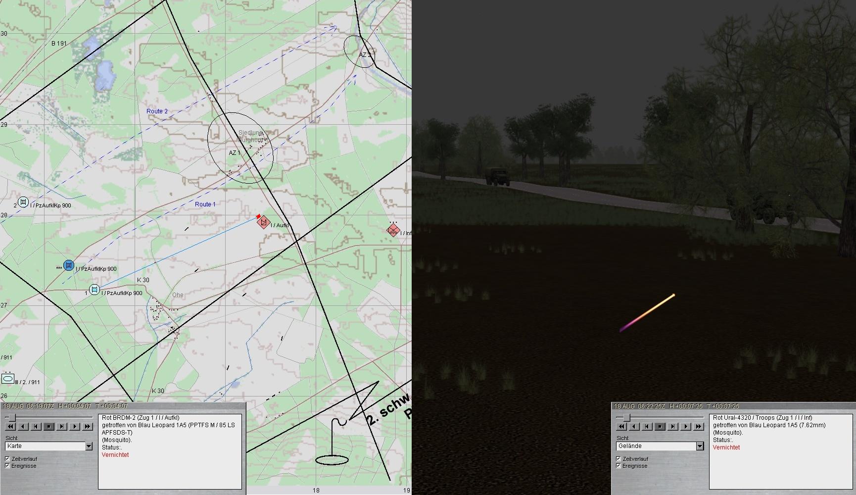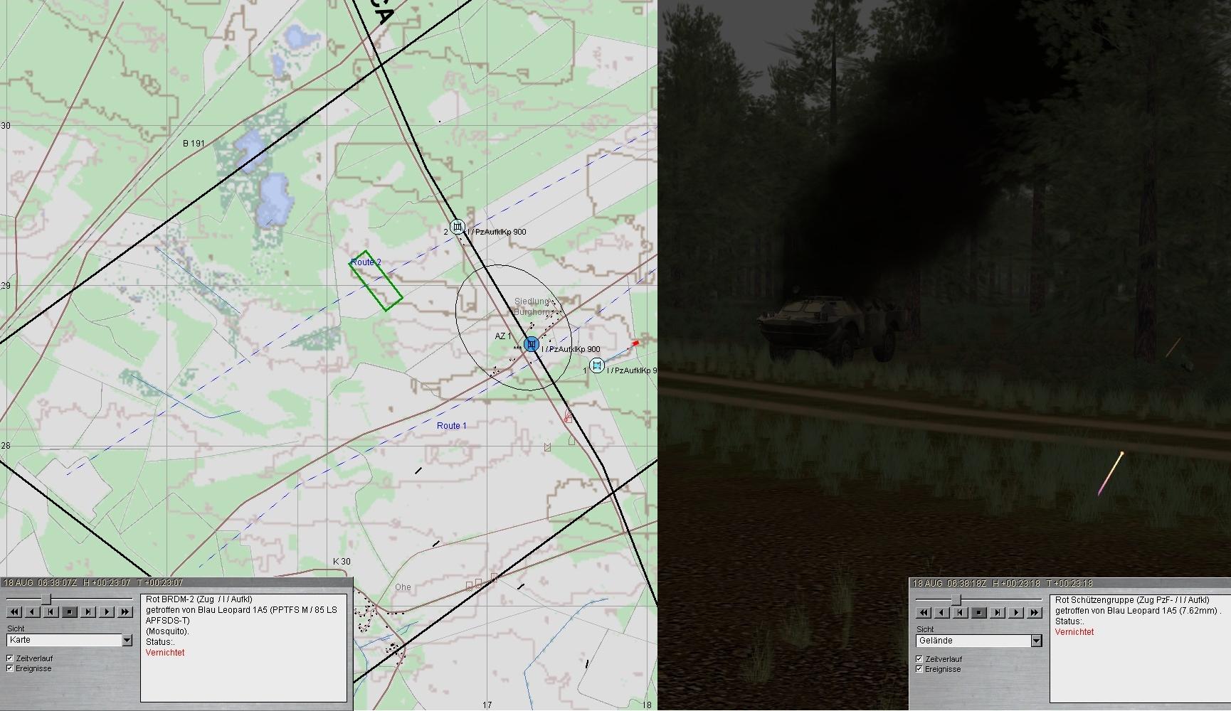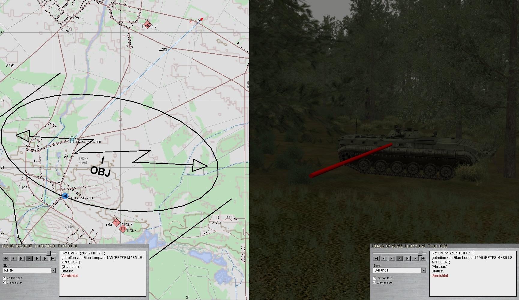 Beide Seiten eröffneten den Feuerkampf. 2 BMP wurden vernichtet. Leider traf der dritte den A1 am Turm (Ausfall der gesamten Turmbesatzung sowie der Hauptwaffe). A1 fuhr zum SanTrp in AZ1!