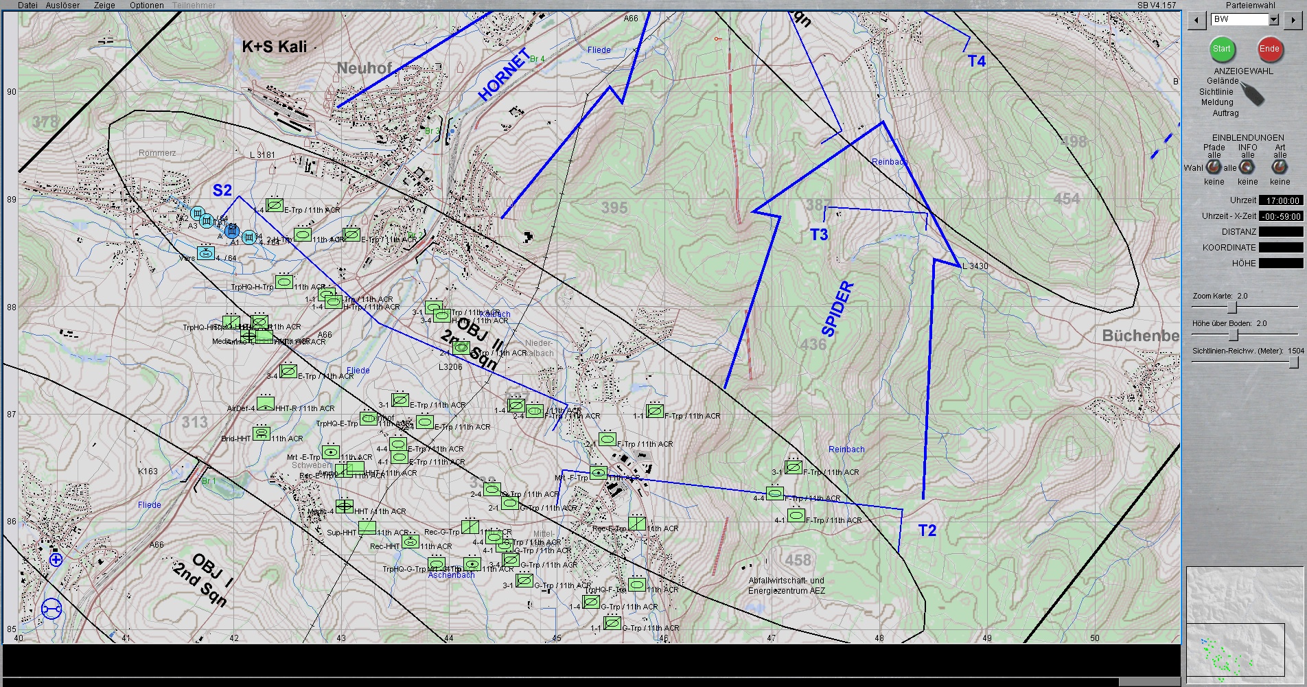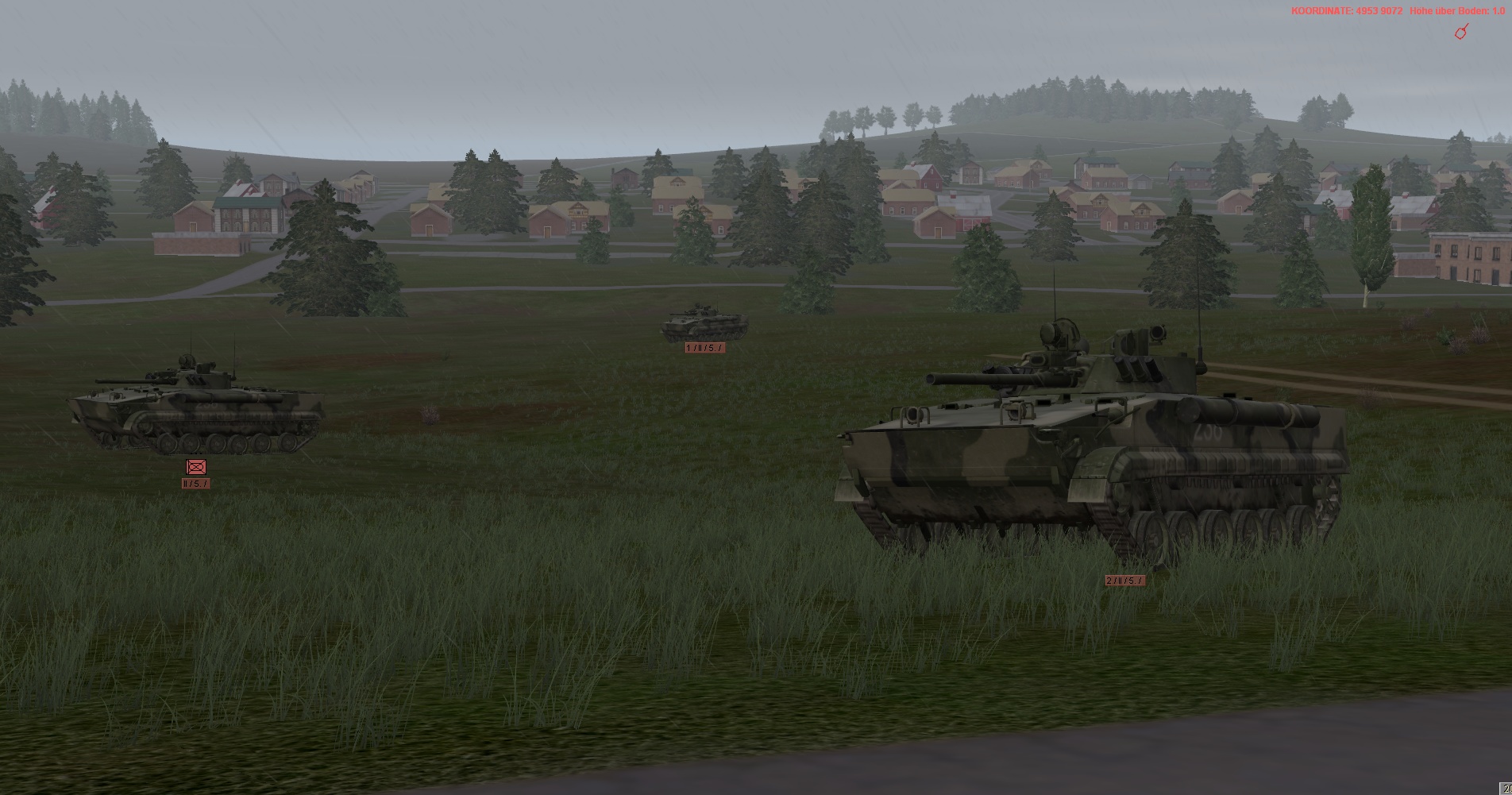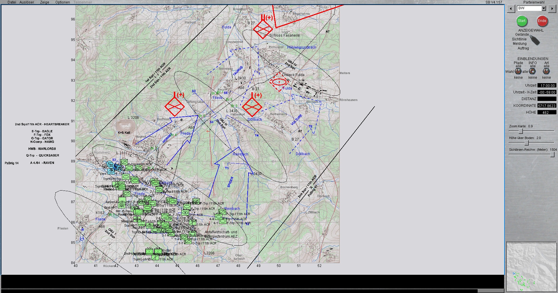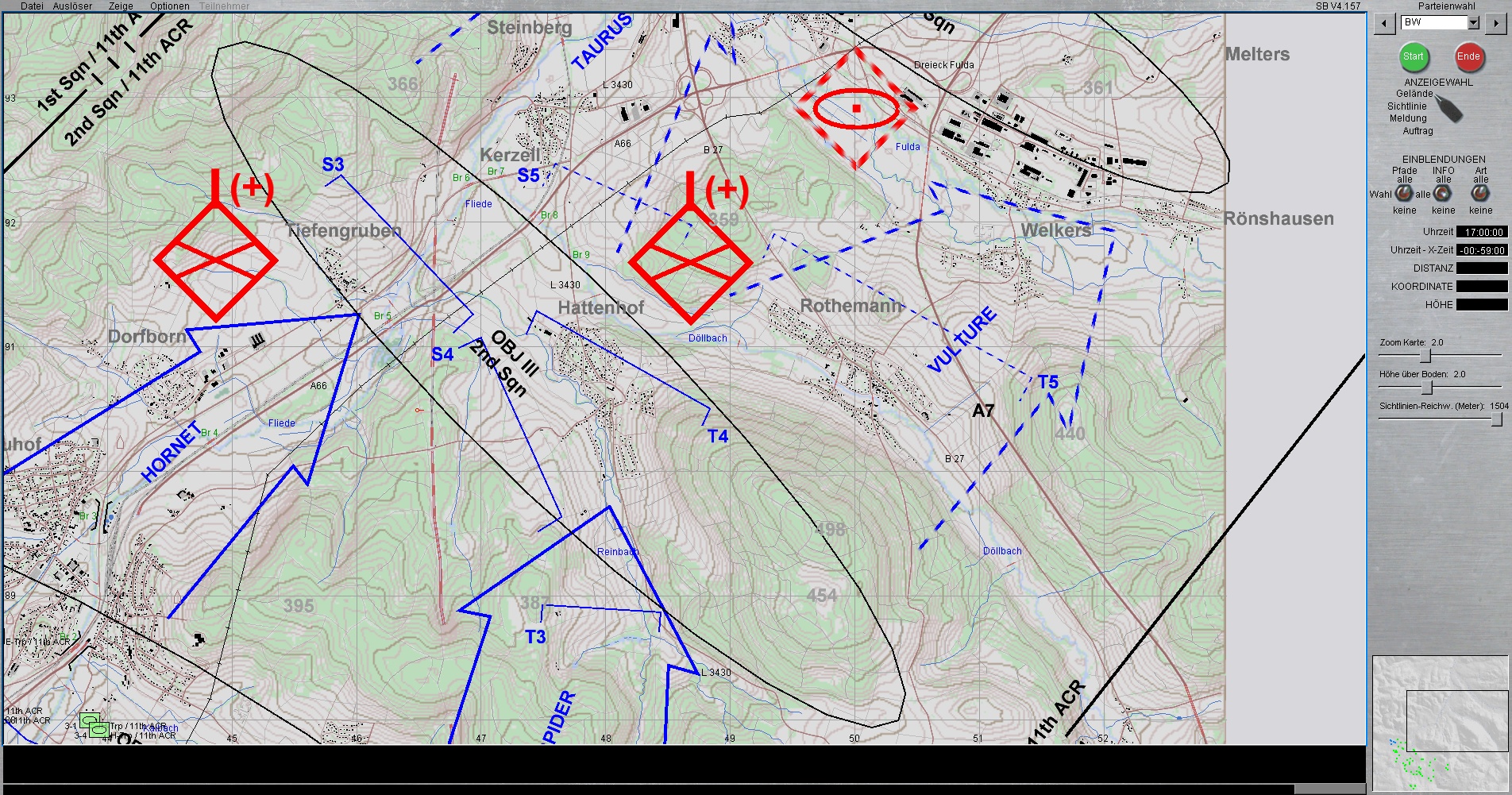 Das US-Btl (Partei Grün) ist mit 2 Kompanien derzeitig kurz vor FLIEDEN und soll mit unserer Hilfe, die ersten Angriffswellen von ROT stoppen, sodass die eigenen nachstoßenden US-Kompanien bis kurz NEUHOF vorstoßen können.