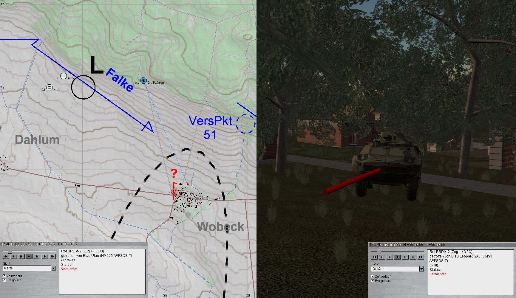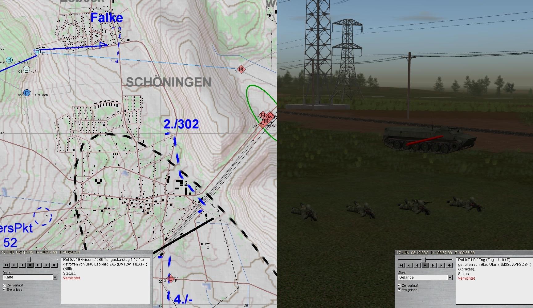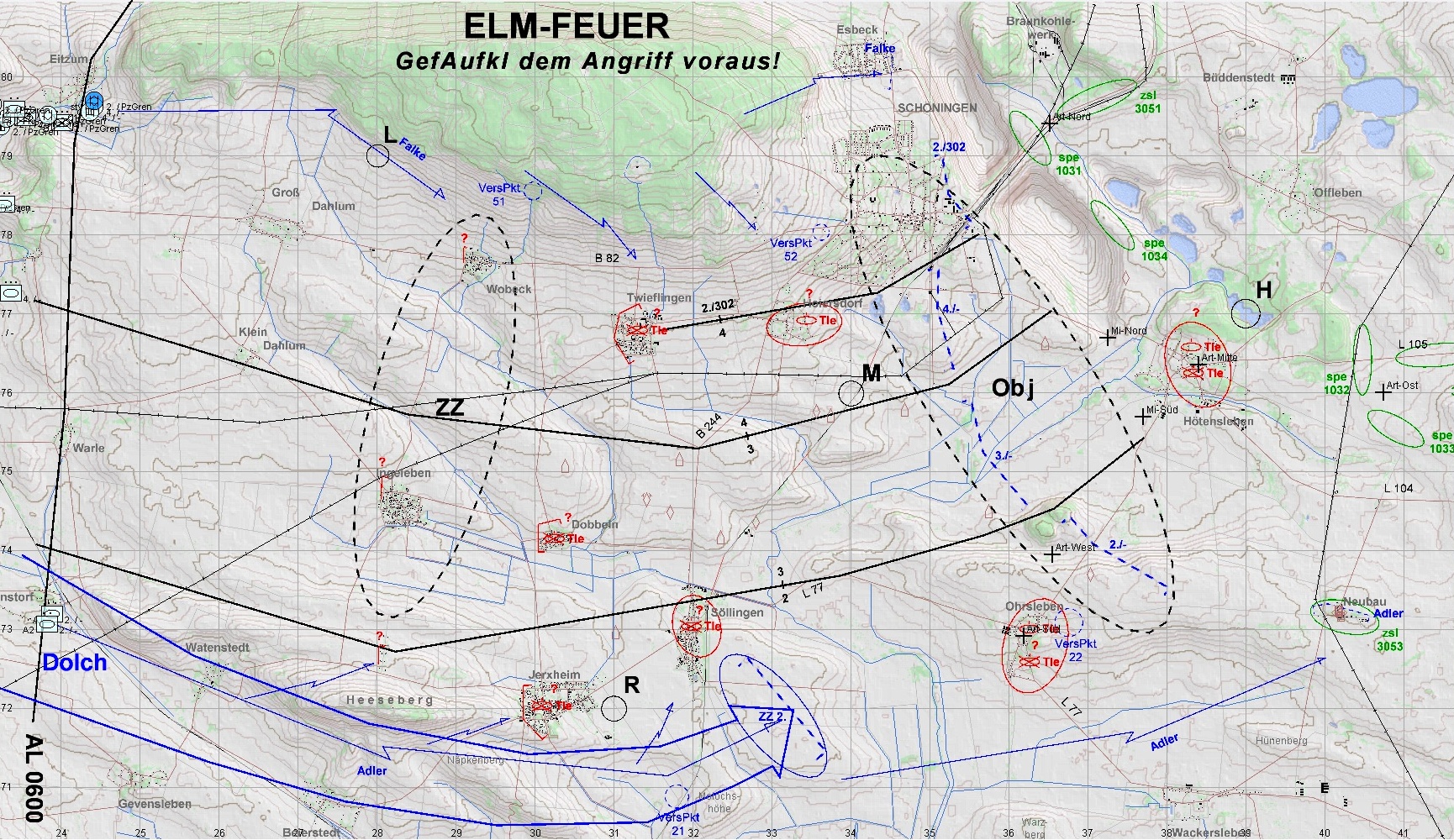 Dann erfolgte der Feindangriff. Nordostwärts SCHÖNINGEN trat eine BMP-Kp an. Die vstk PzGrenKp kämpfte gut, denn nur 1 BMP gelangte ins Visier von FALKE und wurde vernichtet.