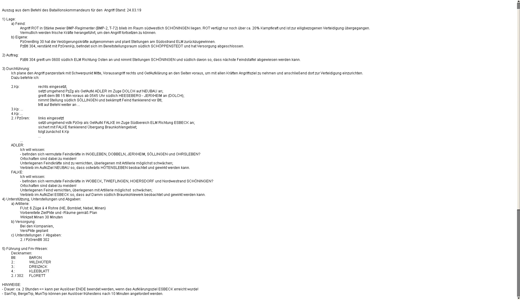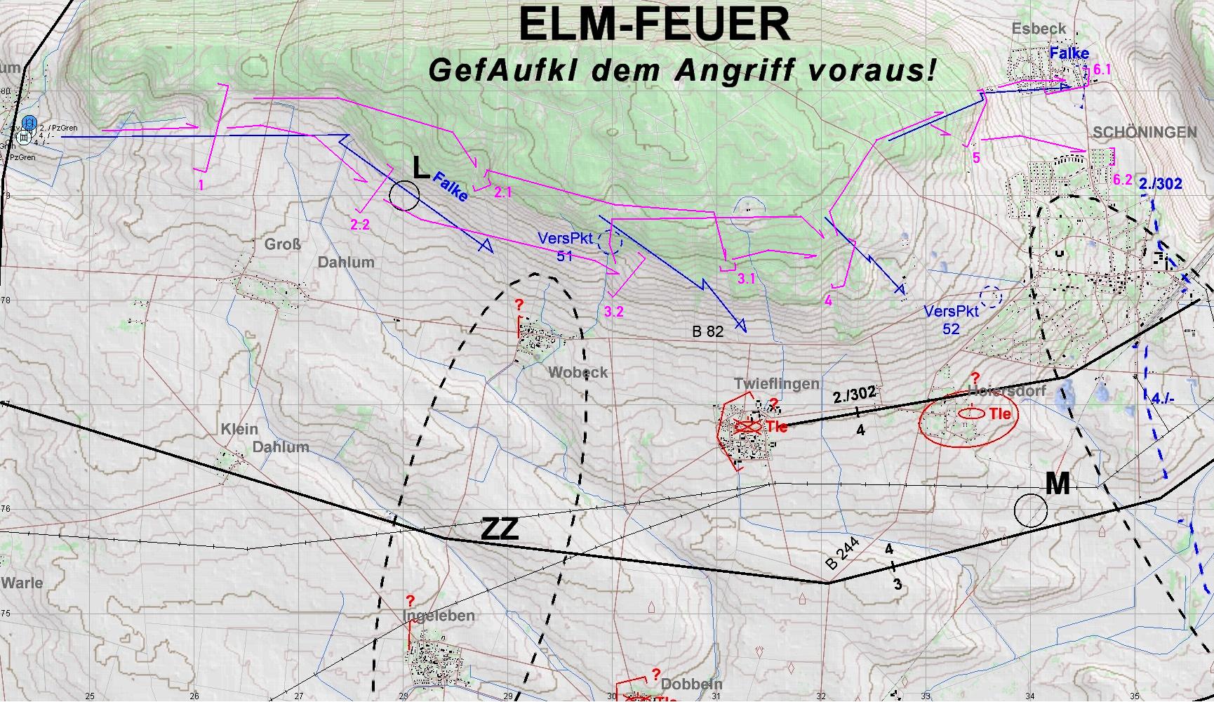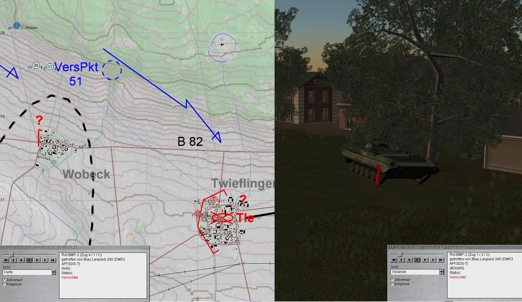 Dann erfolgte der Feindangriff. Nordostwärts SCHÖNINGEN trat eine BMP-Kp an. Die vstk PzGrenKp kämpfte gut, denn nur 1 BMP gelangte ins Visier von FALKE und wurde vernichtet.