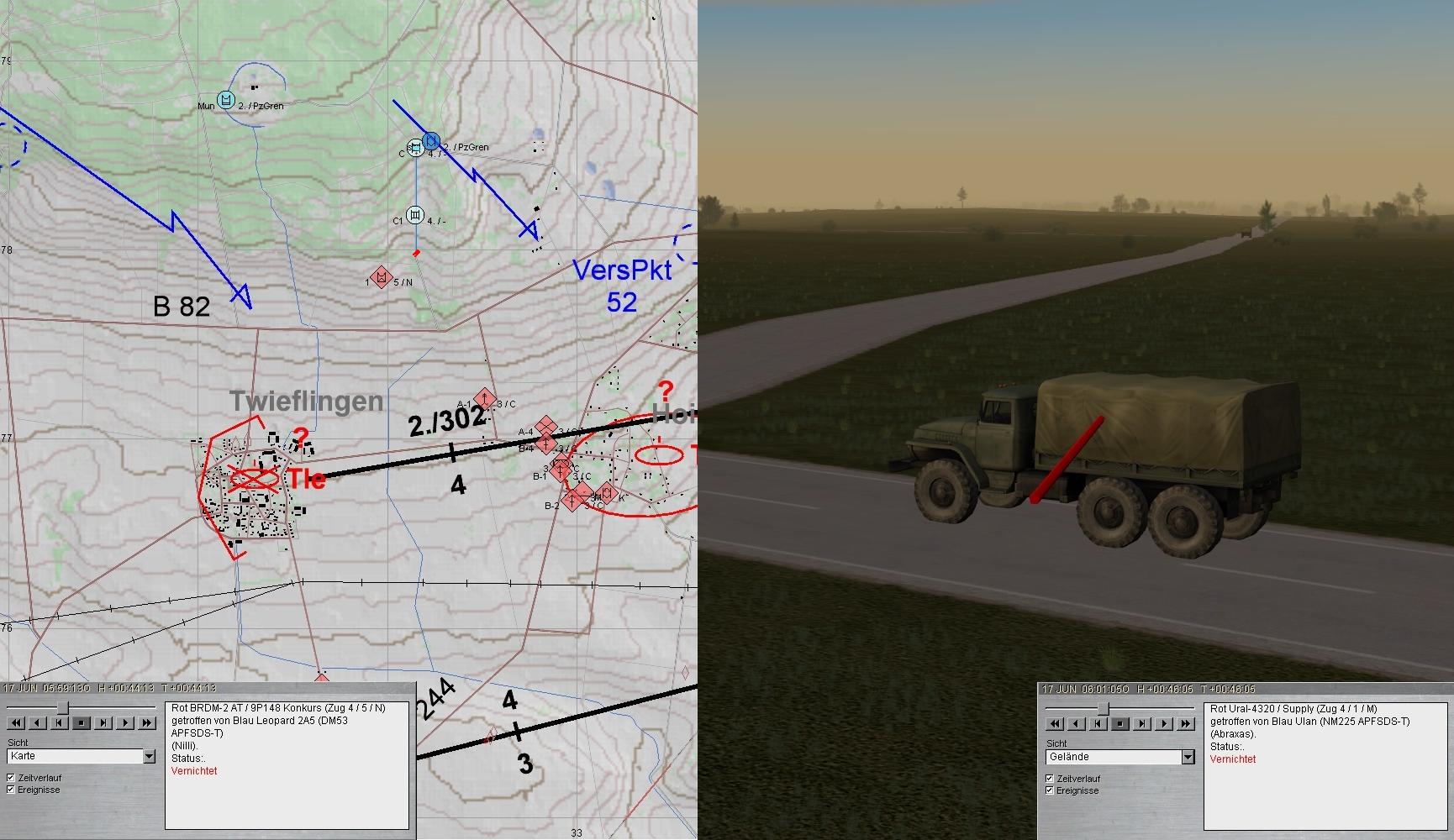 Nun ging es weiter in die Stellung 4, diesmal sollte PzGren rechts bleiben. Kaum erreichte C-Grp die Stellung, musste ein fdl PzJg vernichtet werden. C1 wurde von FdPz erfolglos beschossen und PzGren konnte noch fdl Lkw vernichten. Dann wich man aus und trat auf Stg 5 an.