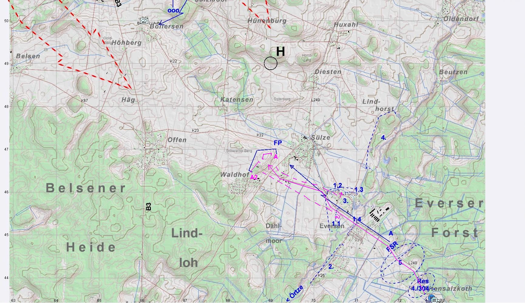 Während A-Pz mittels BergePz über die Örtze abgeschoben wurde, wich 2. Grp auf Stellungen 1.1 und 1.3 aus. A1 unterstütze PzGren in Stellung 1.2. Aus N griffen insgesamt 2 BMP-Kpn an, die BLAU erheblich zusetzten und dezimierten.