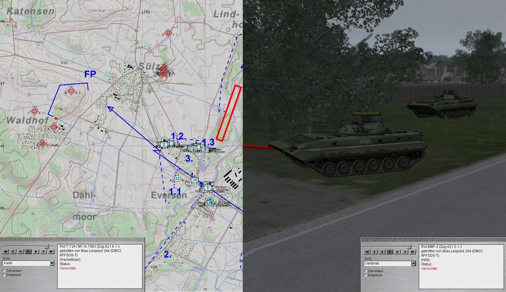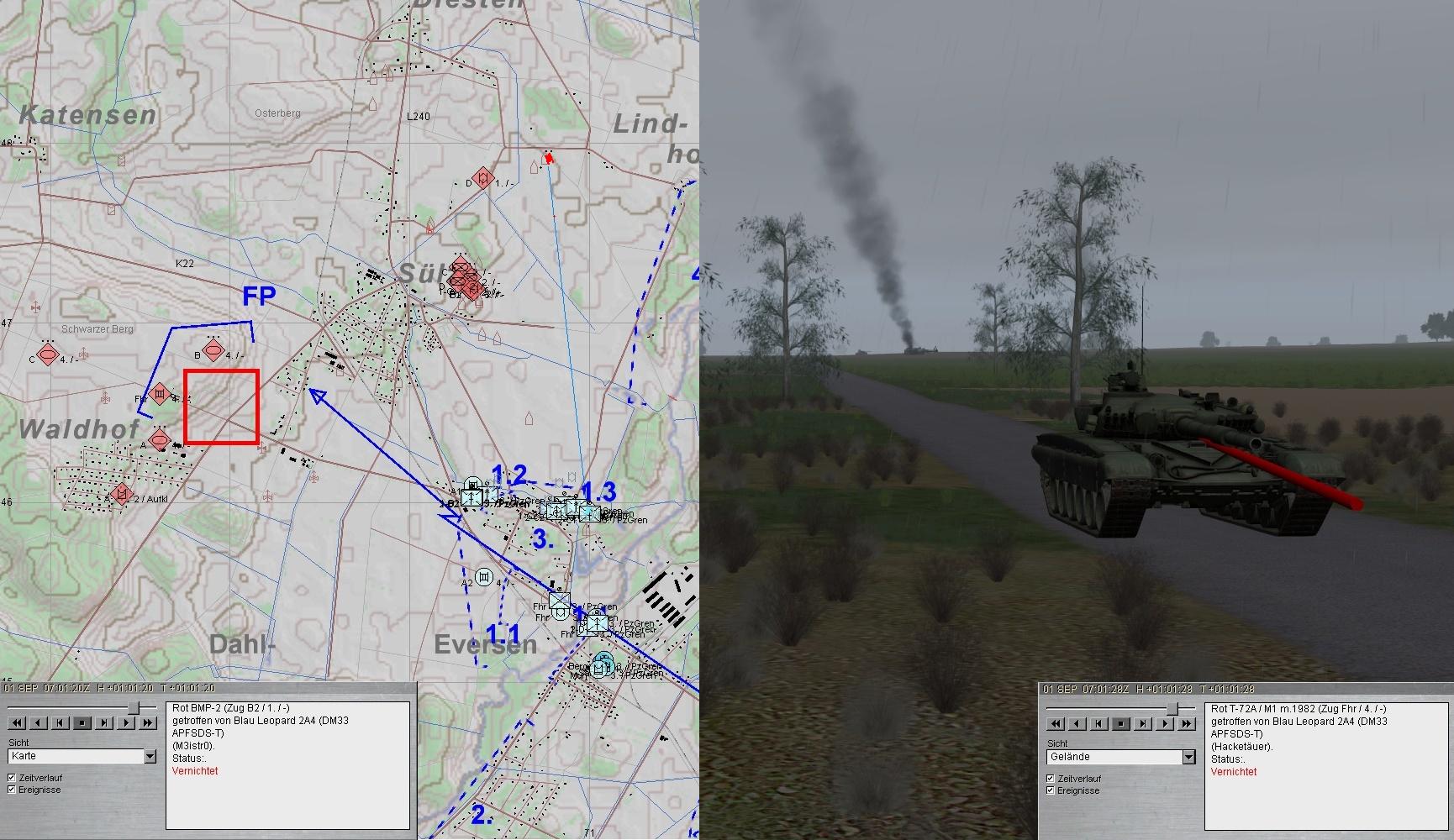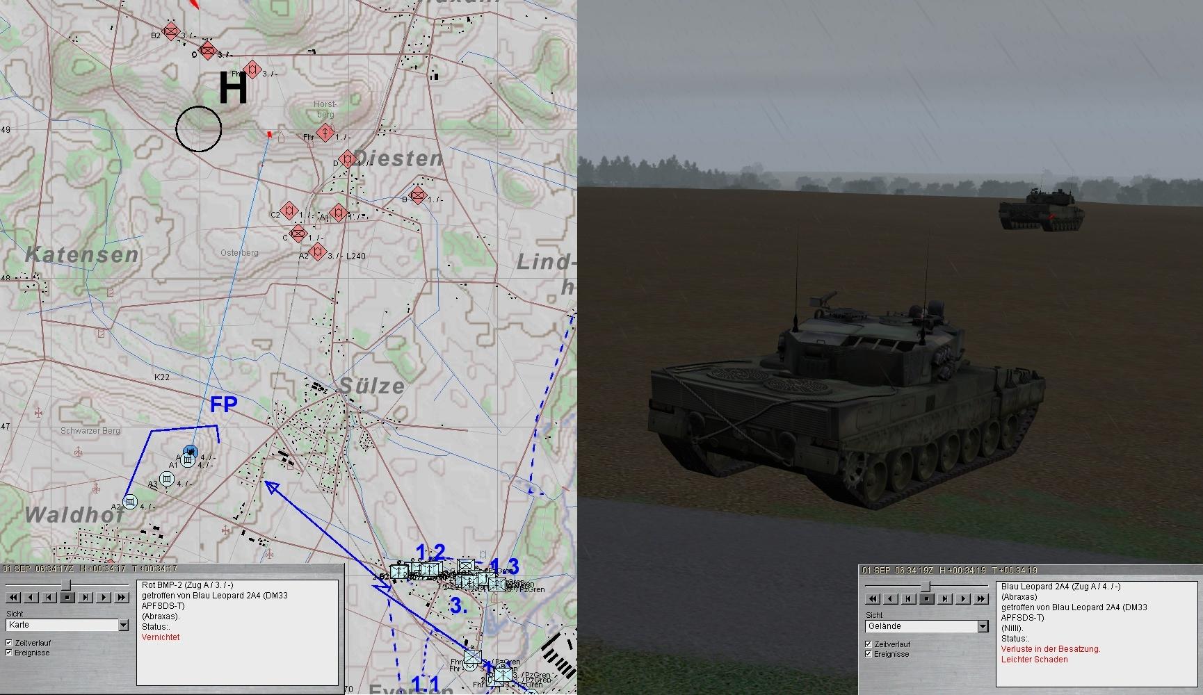 A1 verbesserte seine Stellung! Nun trat eine BMP-Kp aus N an. Das Feuer wurde eröffnet. Leider traf A1 dabei den A-Pz: MKF und RS verwundet, etliche Schäden an Waffenanlage und Kraftstoffleitung.