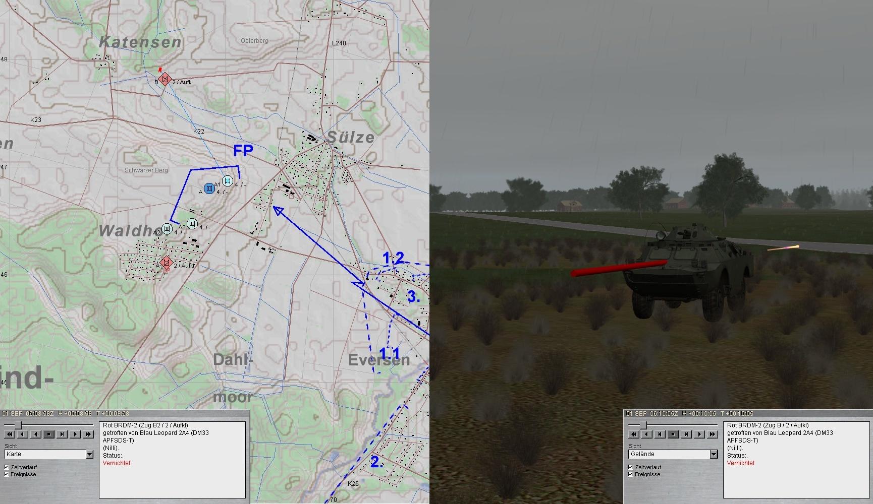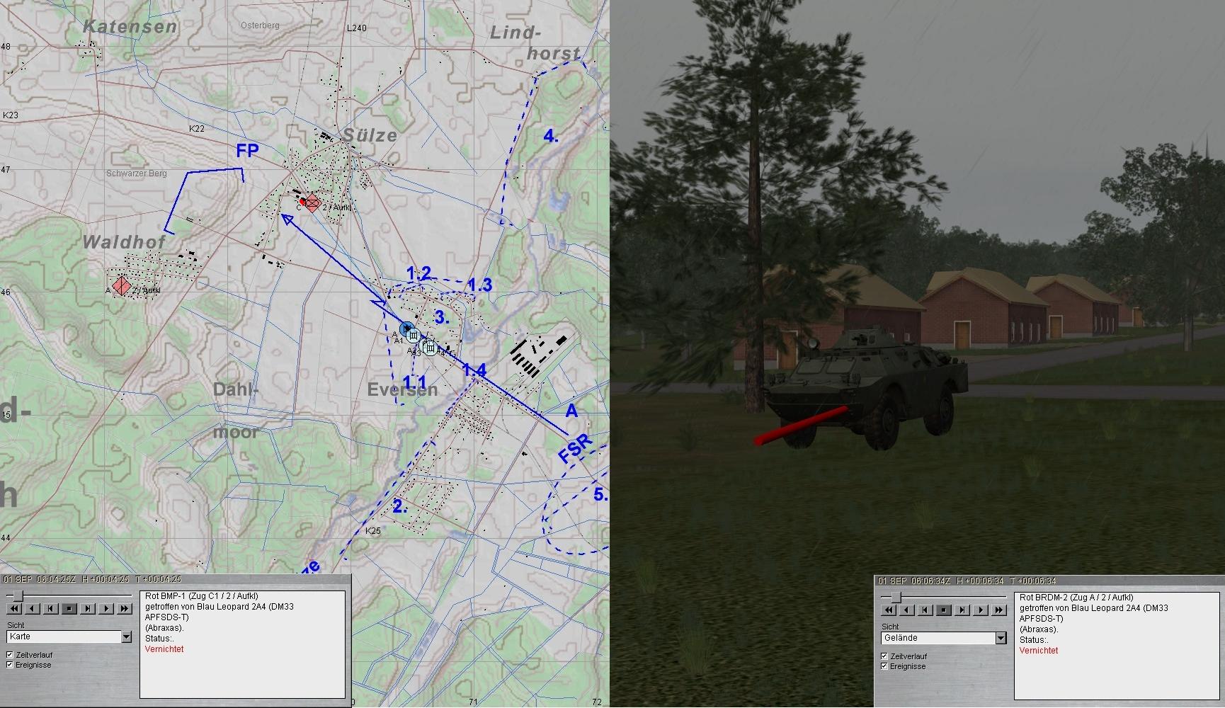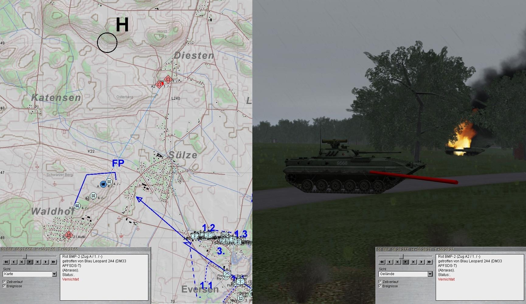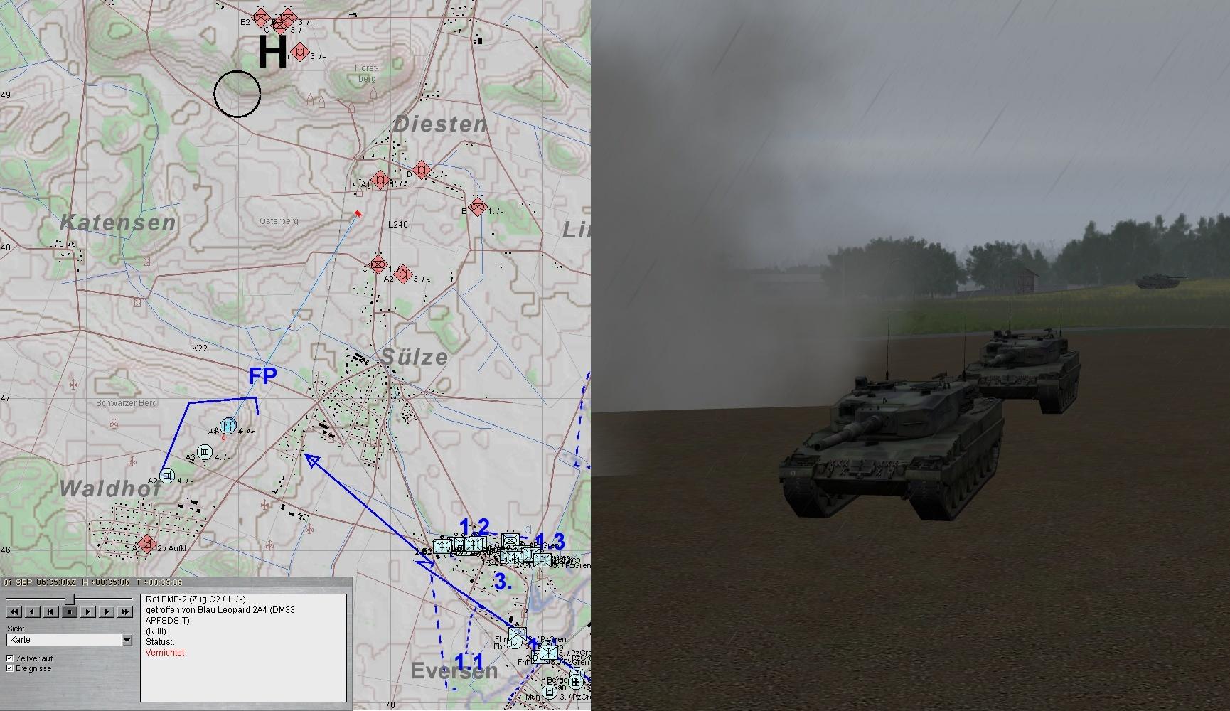 A1 verbesserte seine Stellung! Nun trat eine BMP-Kp aus N an. Das Feuer wurde eröffnet. Leider traf A1 dabei den A-Pz: MKF und RS verwundet, etliche Schäden an Waffenanlage und Kraftstoffleitung.