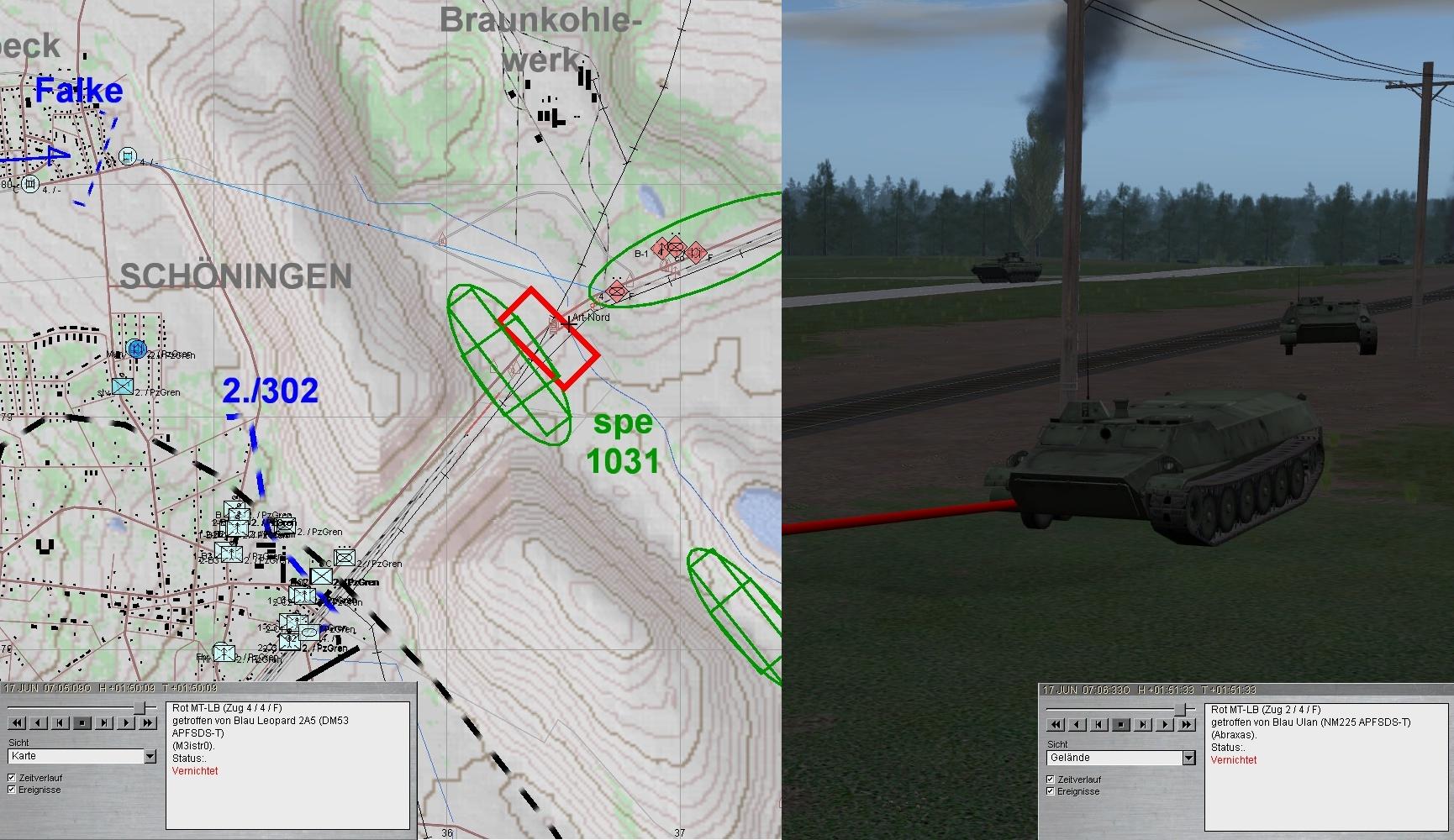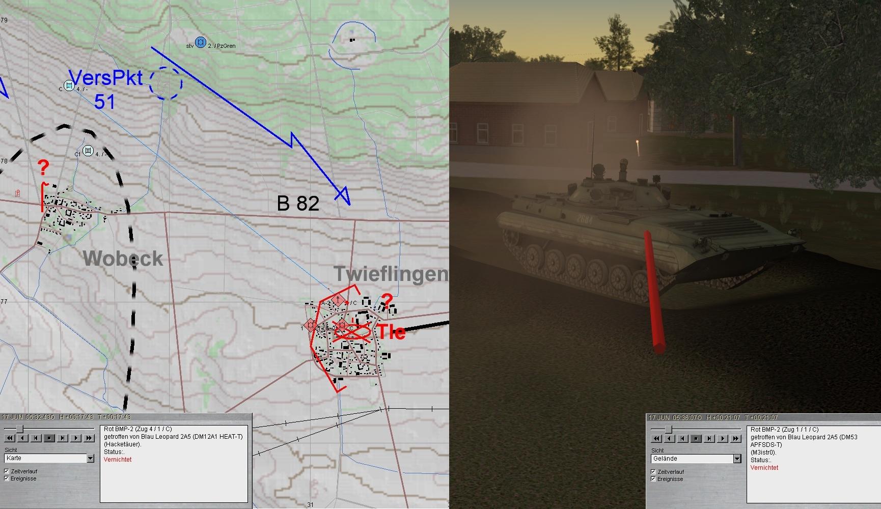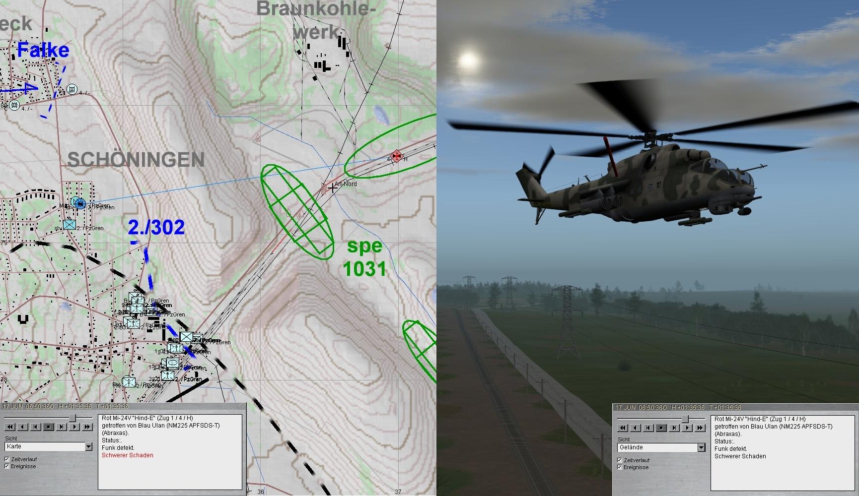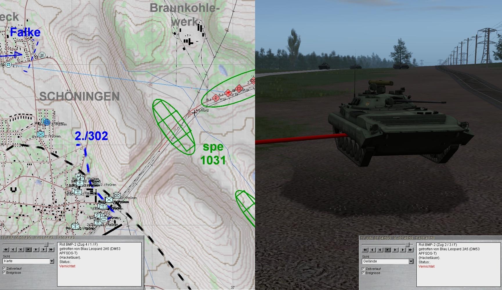 Das Btl war mittlerweile angetreten und nahm das Angriffsziel. Da warnte der BtlKdr vor einem anmarschierenden verstärkten PzBtl. Zunächst griffen HIND voraus an und ostwärts SCHÖNINGEN folgten BMP, während im Süden der Panzerangriff erfolgte.