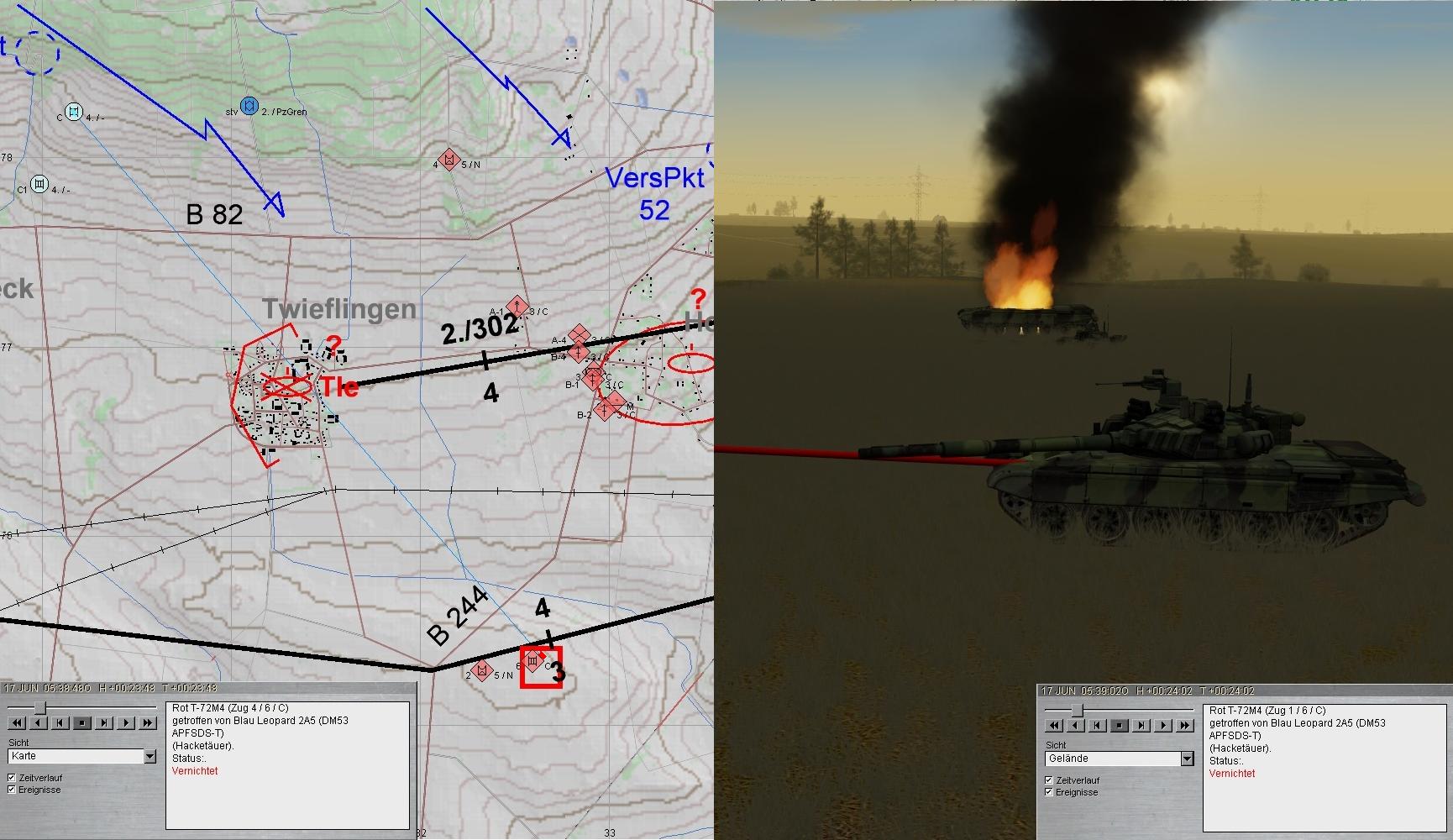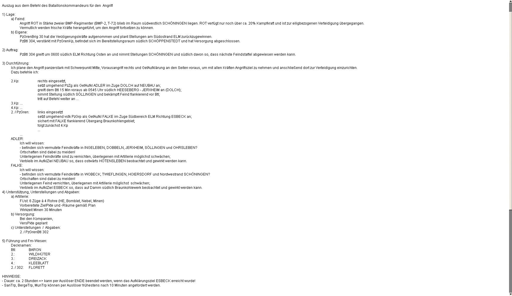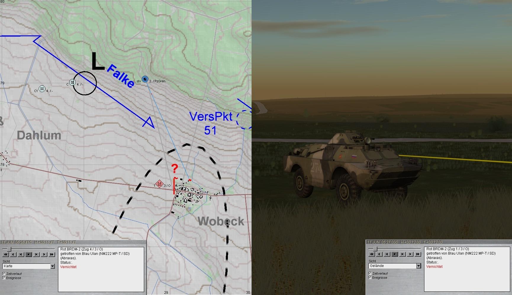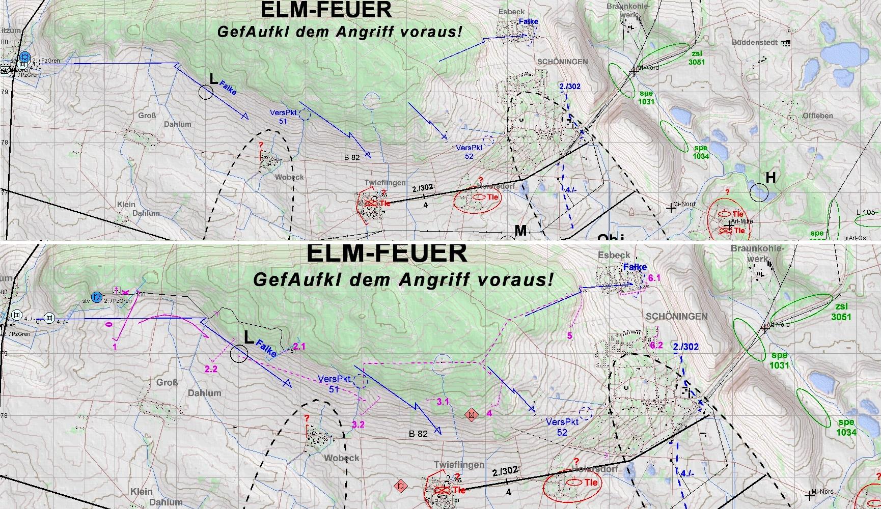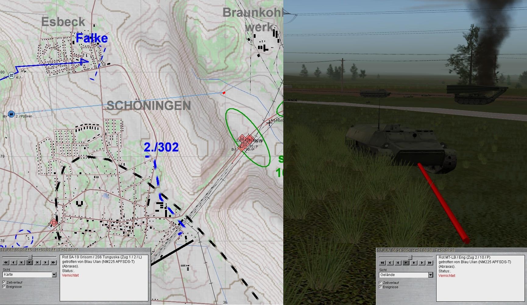 Das Btl war mittlerweile angetreten und nahm das Angriffsziel. Da warnte der BtlKdr vor einem anmarschierenden verstärkten PzBtl. Zunächst griffen HIND voraus an und ostwärts SCHÖNINGEN folgten BMP, während im Süden der Panzerangriff erfolgte.